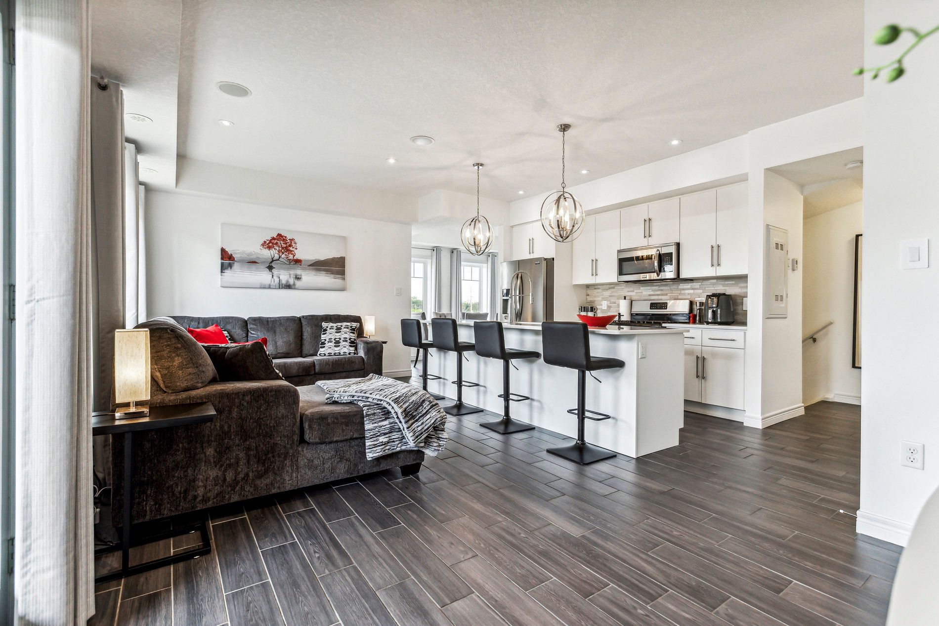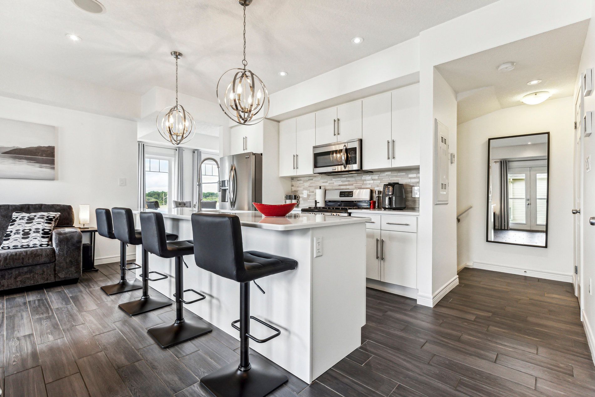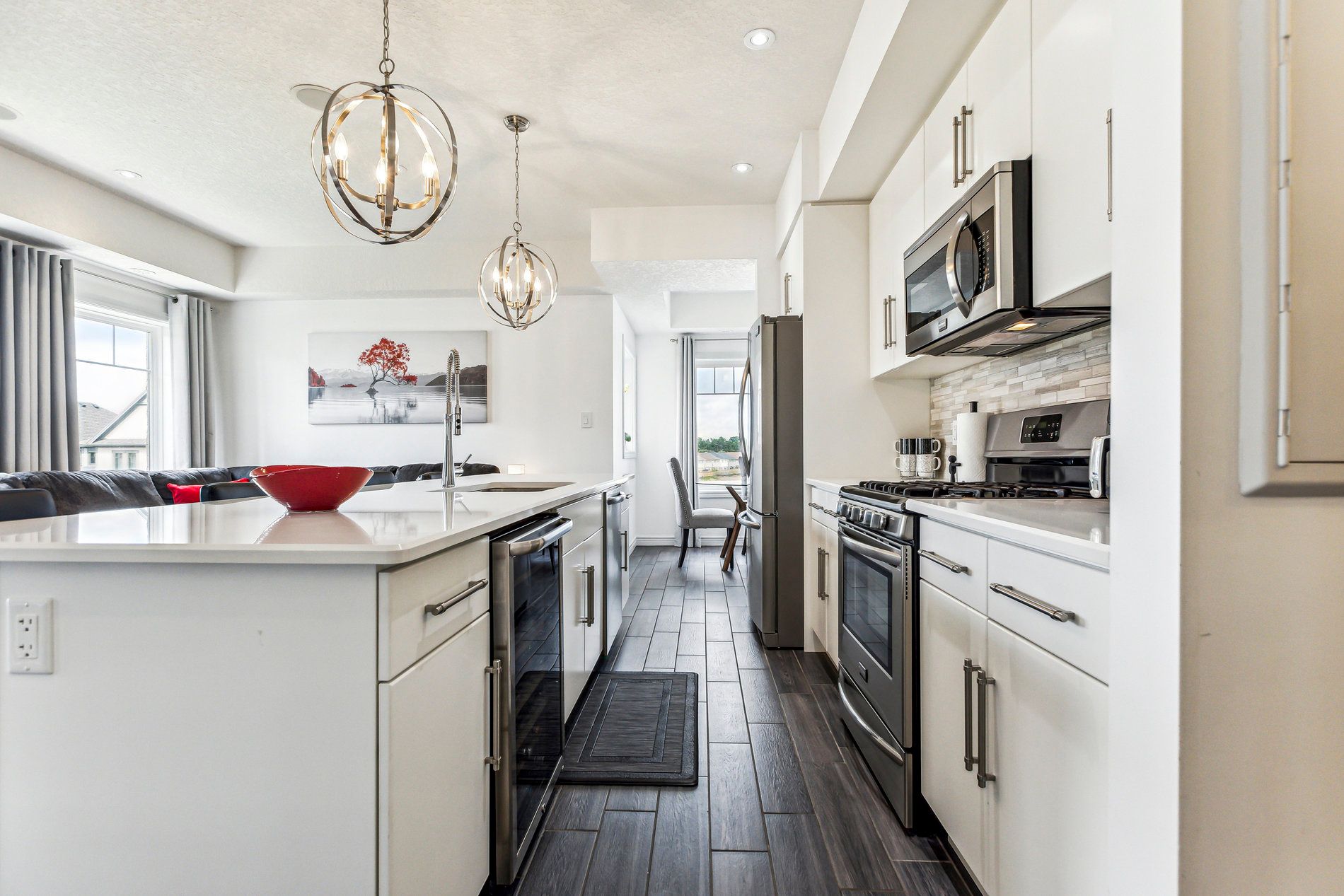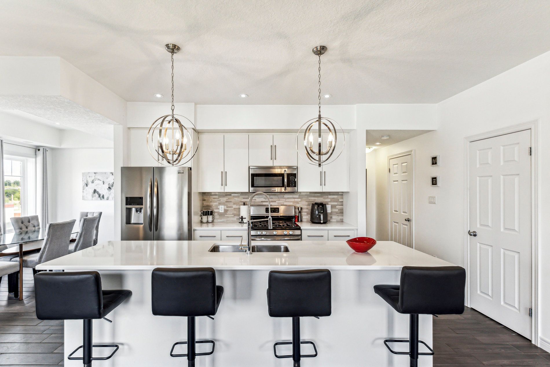 • Bright open-concept kitchen with modern appliances and large island.
