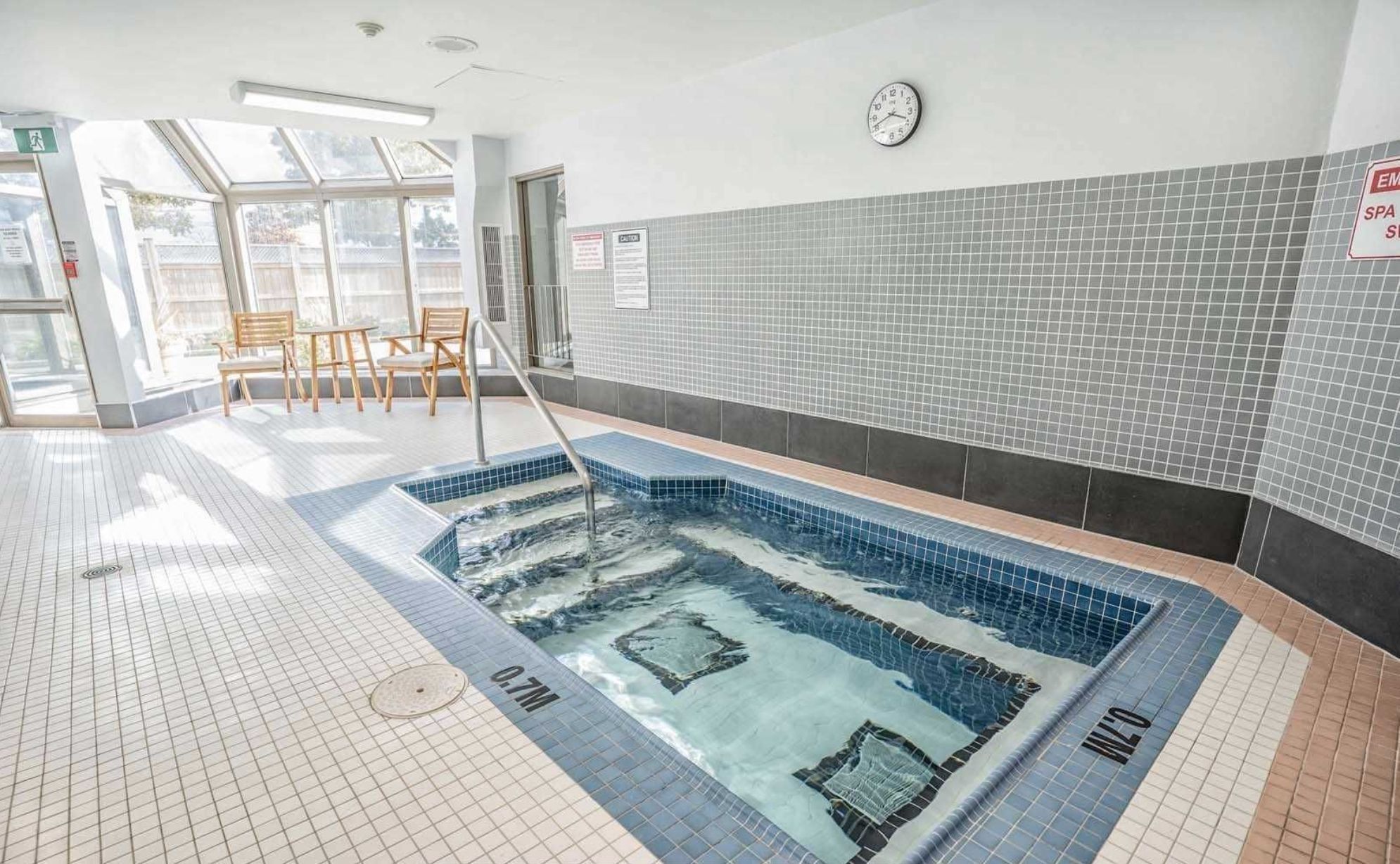 • Amenities include indoor pool, fitness room, and tennis courts.