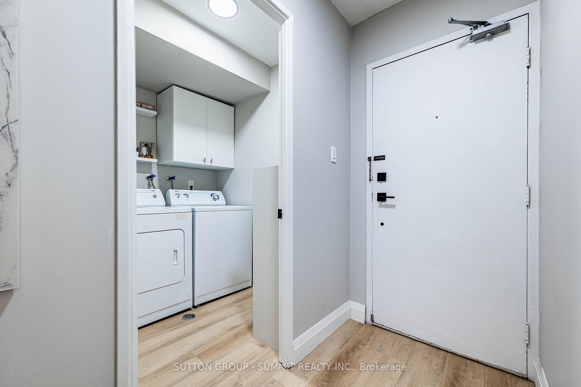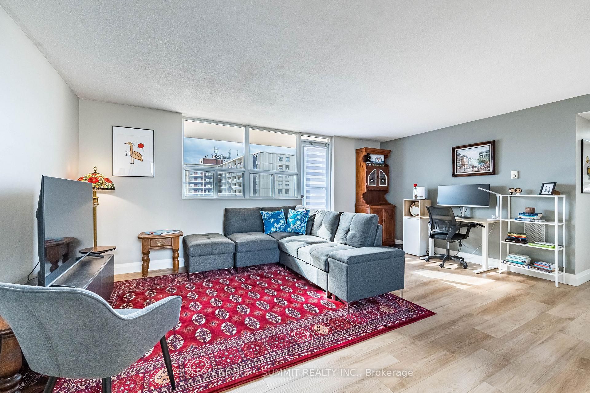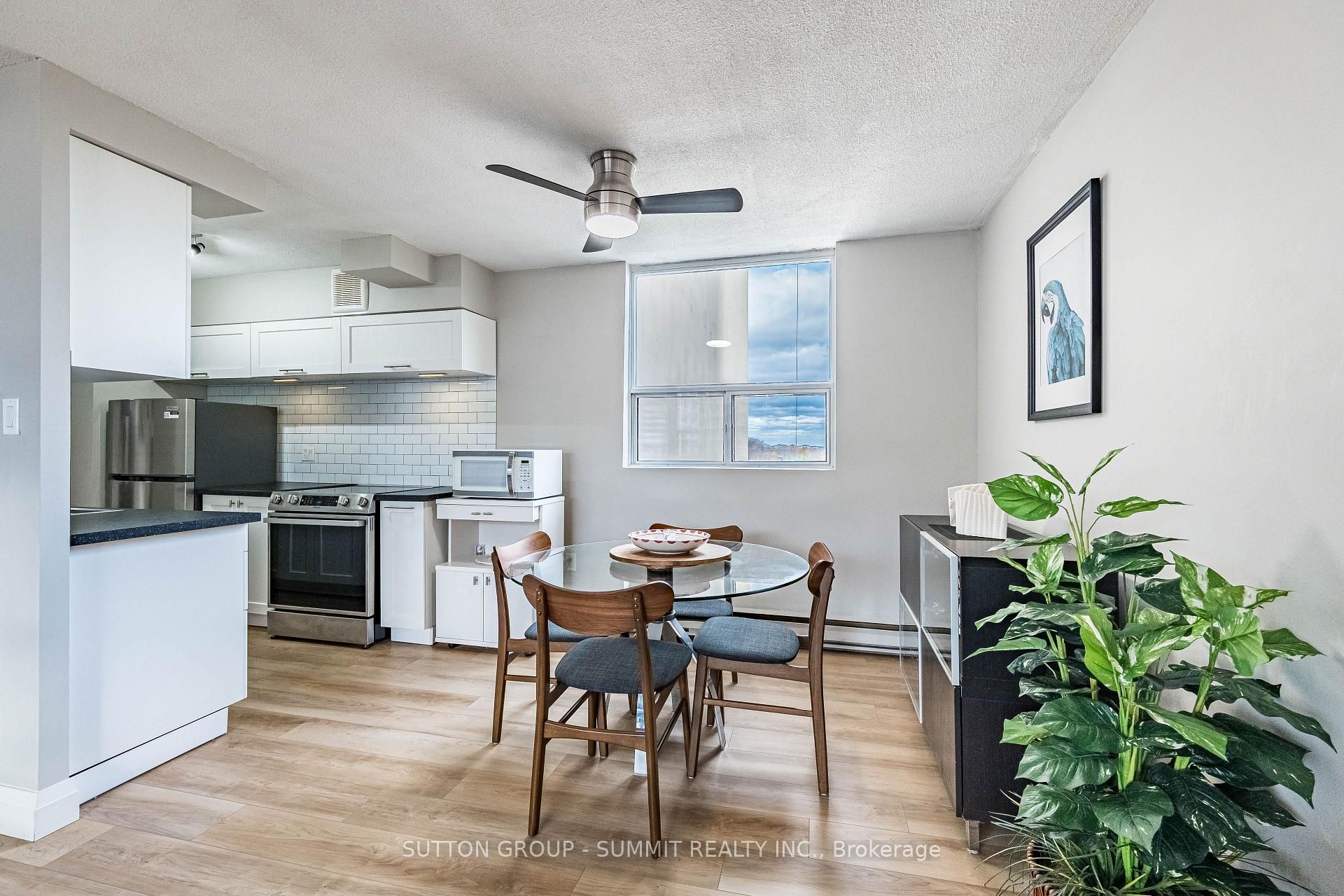 Beautifully renovated & move-in ready! Located in the empress, one of burlington's most sought-after condominium communities. This oversized 1-bedroom + den suite is the largestone-bedroom layout in the building, offering over 1,000 sq. Ft. Of bright, open living space with east and west exposures - perfect for enjoying both sunrise and sunset views. Completely renovated in 2023-2024, this suite features new flooring and baseboards throughout, freshly painted walls and ceilings, new doors, modern light fixtures, and ceiling fans. The custom kitchen shines with sleek cabinetry, extended counter space, and stainless steel appliances -ideal for cooking and entertaining. The updated bathroom offers a new tub, toilet, vanity, and elegant touch-light mirror for a spa-like feel. The bright living and dining area opens to a large private balcony, perfect for relaxing outdoors. The spacious bedroom includes two large double closets, while the versatile den is ideal for a home office. In-suite laundry and one underground parking space complete this exceptional home. Building amenities include: 24-hour concierge, outdoor pool, fitness centre, sauna, party room, library, car wash bay, workshop, barbecues, ev charging station, and ample visitor parking. Enjoy comfort, security, and convenience just steps from shopping, dining, transit, and the burlington centre mall.