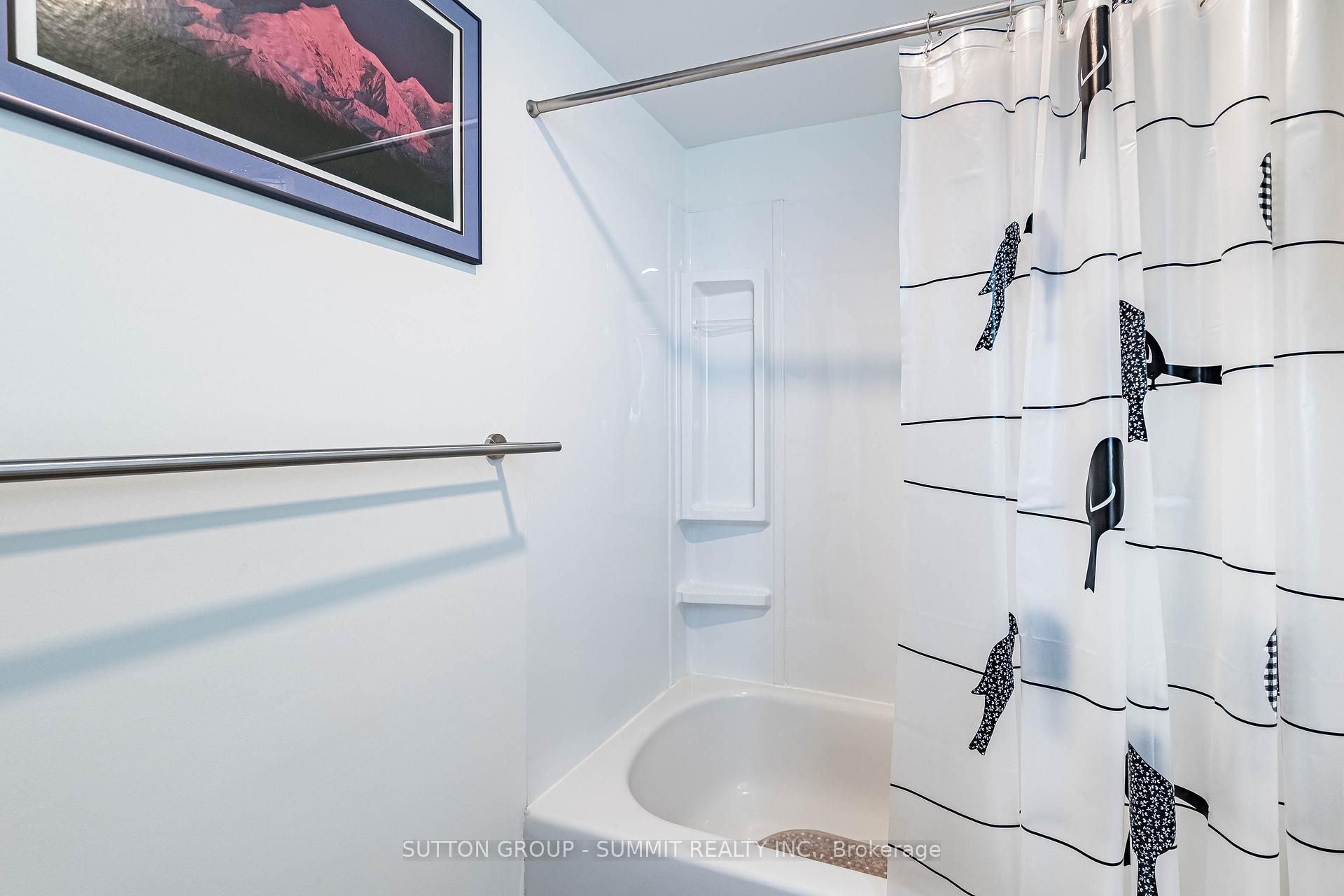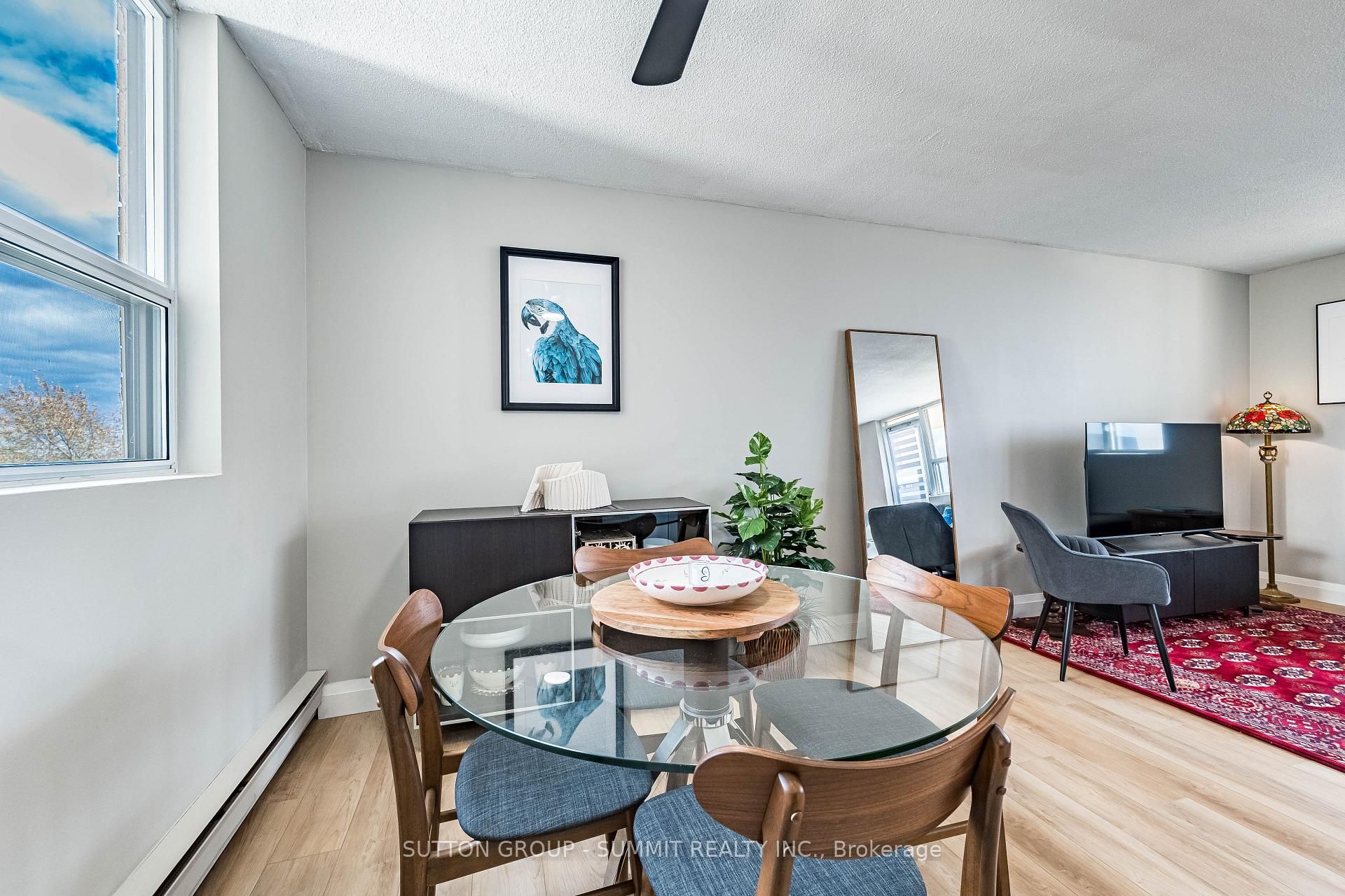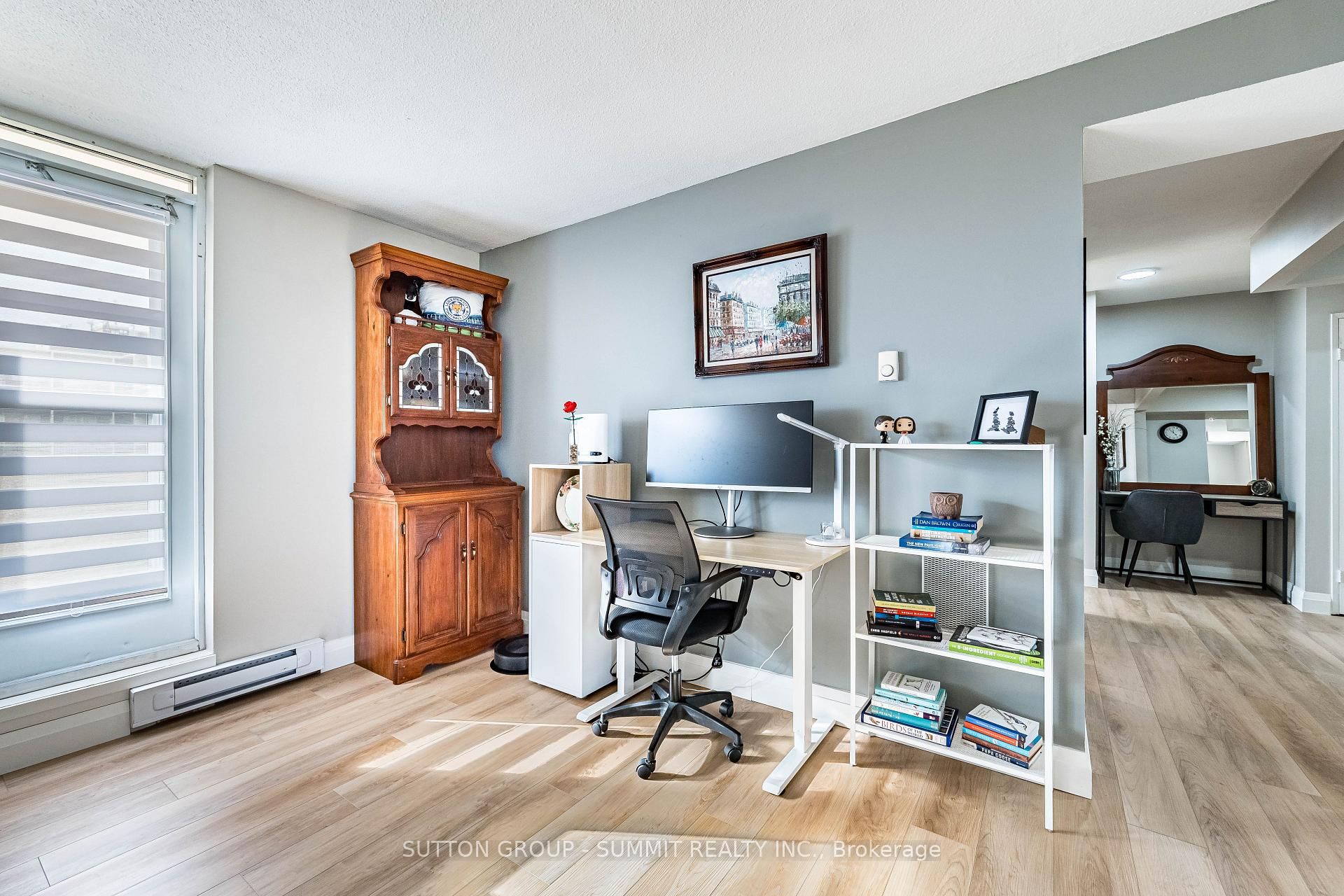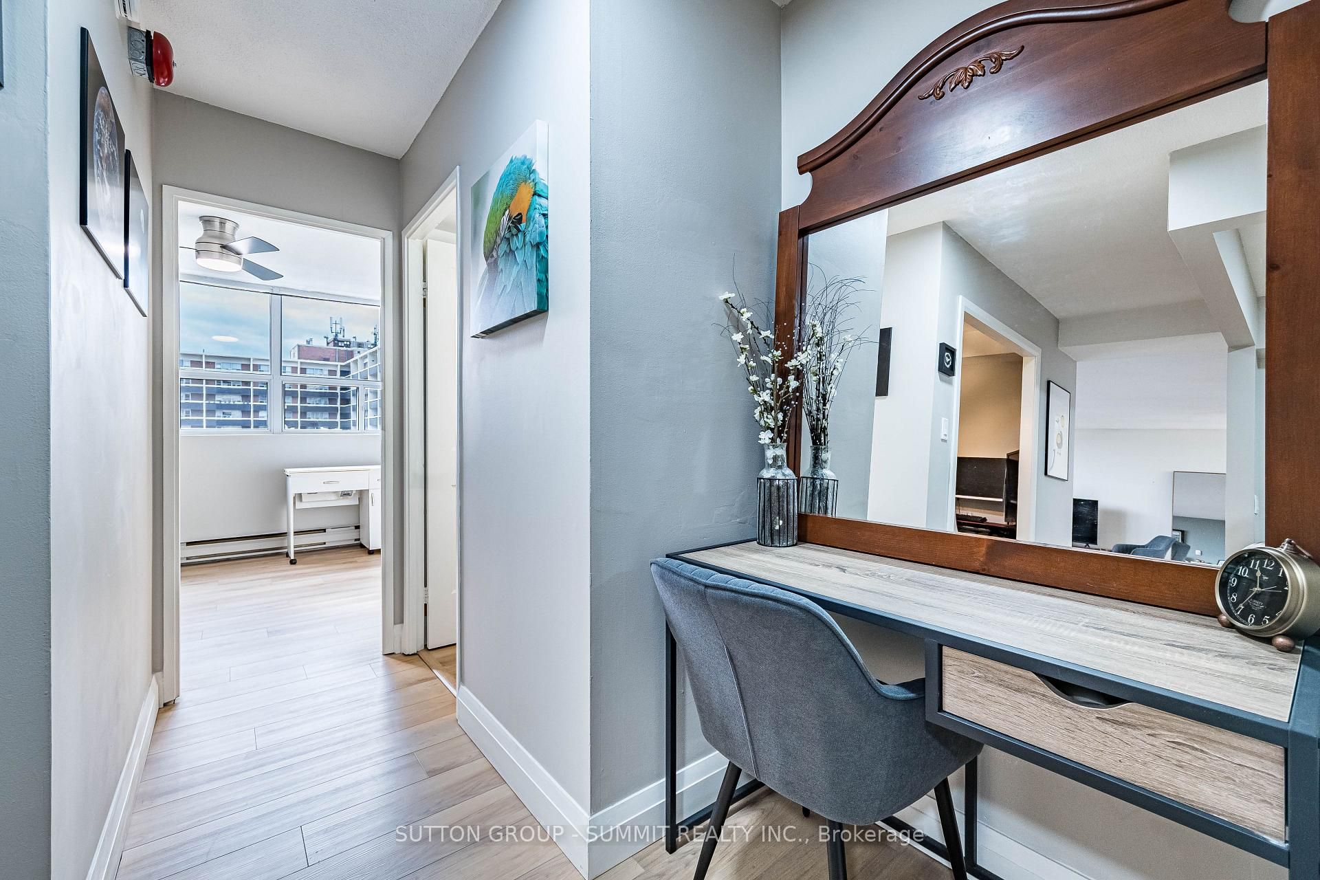 Beautifully renovated & move-in ready! Located in the empress, one of burlington's most sought-after condominium communities. This oversized 1-bedroom + den suite is the largestone-bedroom layout in the building, offering over 1,000 sq. Ft. Of bright, open living space with east and west exposures - perfect for enjoying both sunrise and sunset views. Completely renovated in 2023-2024, this suite features new flooring and baseboards throughout, freshly painted walls and ceilings, new doors, modern light fixtures, and ceiling fans. The custom kitchen shines with sleek cabinetry, extended counter space, and stainless steel appliances -ideal for cooking and entertaining. The updated bathroom offers a new tub, toilet, vanity, and elegant touch-light mirror for a spa-like feel. The bright living and dining area opens to a large private balcony, perfect for relaxing outdoors. The spacious bedroom includes two large double closets, while the versatile den is ideal for a home office. In-suite laundry and one underground parking space complete this exceptional home. Building amenities include: 24-hour concierge, outdoor pool, fitness centre, sauna, party room, library, car wash bay, workshop, barbecues, ev charging station, and ample visitor parking. Enjoy comfort, security, and convenience just steps from shopping, dining, transit, and the burlington centre mall.