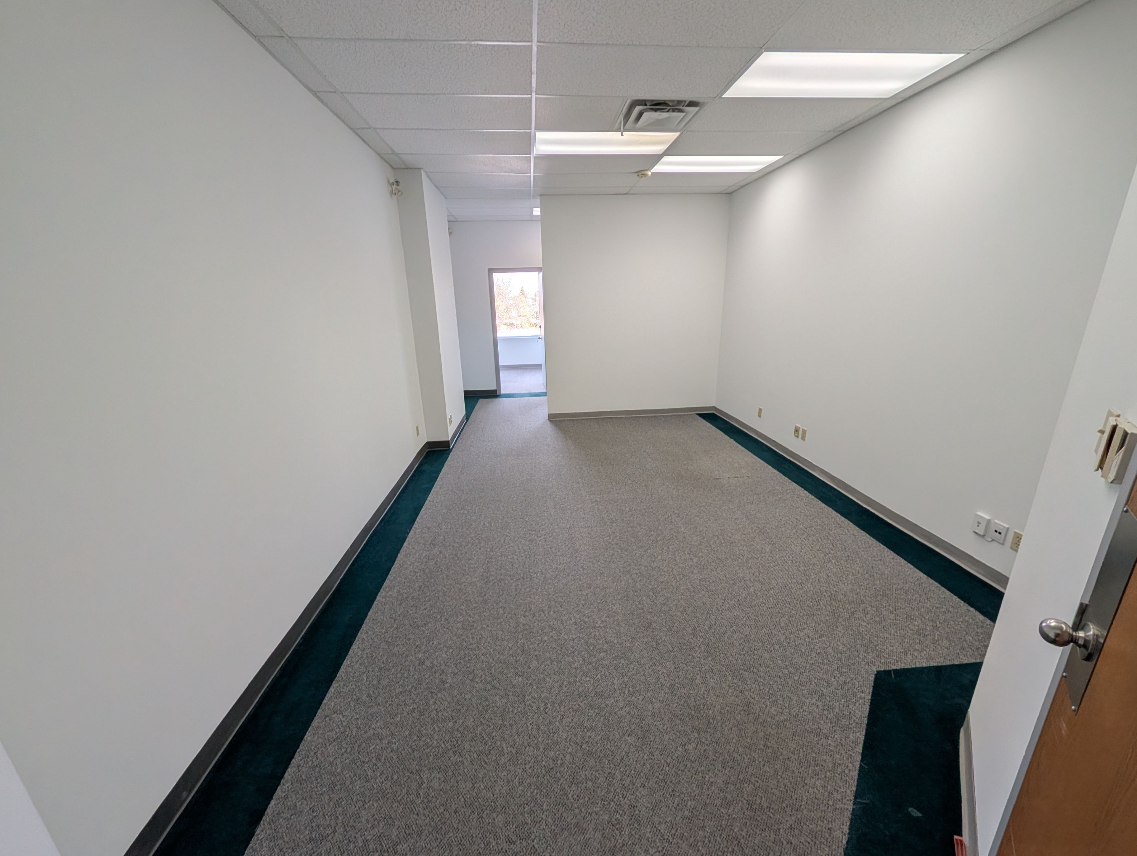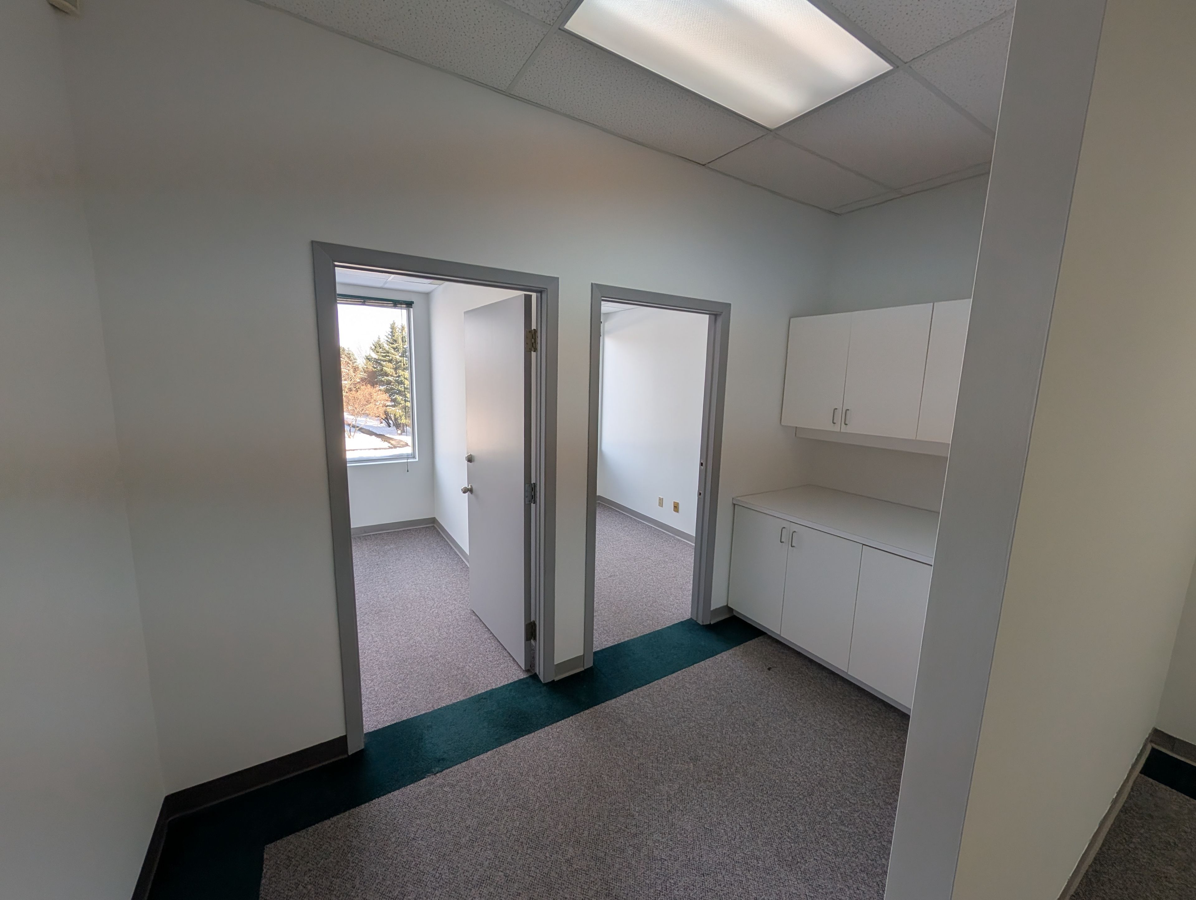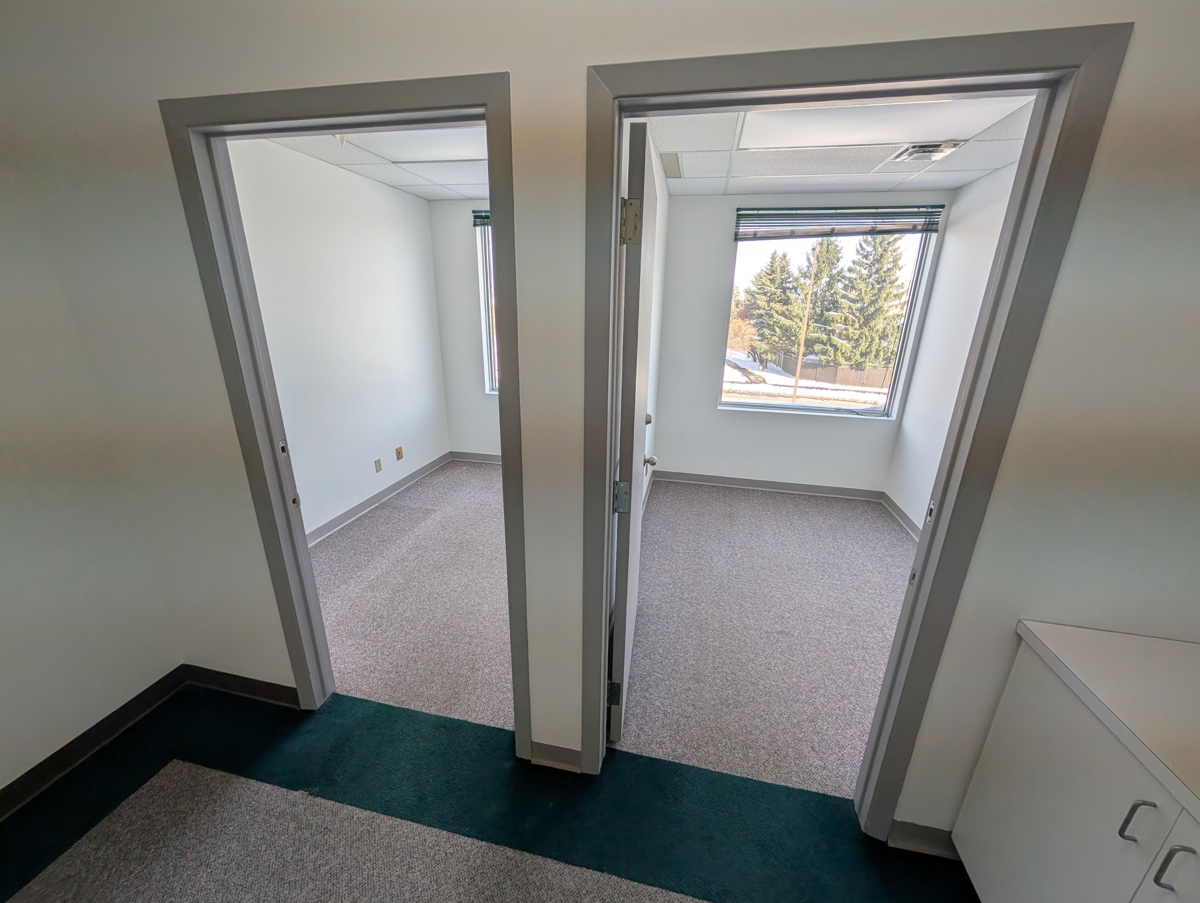 • Second-floor suite with two enclosed offices and rear-facing windows.