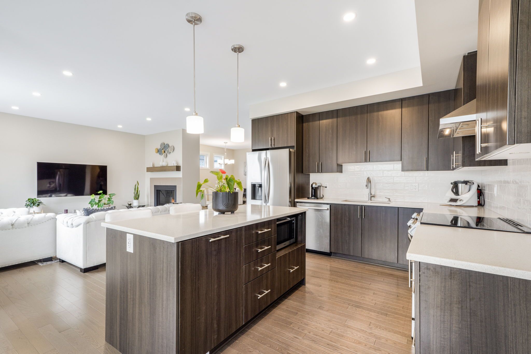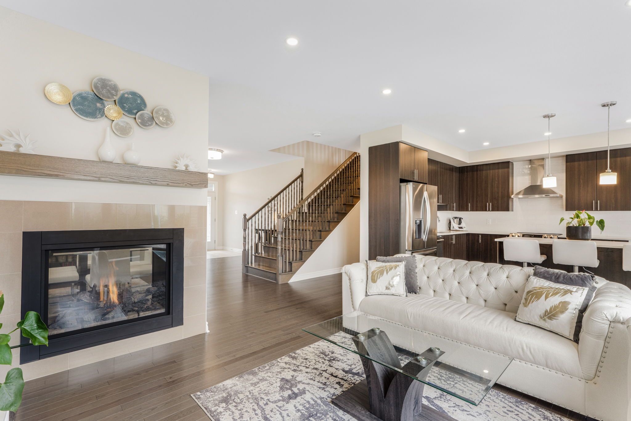 Stylish, spacious, and perfectly positioned, this impressive two-storey corner-lot home is tucked into one of the area's most sought-after, family-friendly neighborhoods. Surrounded by lush hedges and a sleek pvc fence, it offers enhanced privacy with standout curb appeal. Inside, discover 5 bedrooms plus a main-floor den/office that can easily be converted to an additional bedroom, and 4 bathrooms, offering generous space for growing families. The open-concept layout is filled with natural light and thoughtful design, featuring a front office, formal dining room, and a striking double-sided fireplace with a warm oak mantel connecting the main living areas. The chef-inspired kitchen is the heart of the home, complete with quartz countertops, a stylish backsplash, a large island, and a walk-in pantry. A bright dining nook with vaulted ceilings and backyard access adds charm and versatility, all set atop elegant engineered hardwood flooring. Upstairs, four spacious bedrooms and two full bathrooms provide comfort and convenience for the whole family. The primary suite is a luxurious escape with a spa-like 5-piece ensuite and walk-in closet. The fully finished basement adds even more living space with a large family room, an extra bedroom, and a full bathroom, ideal for guests, teens, or entertaining. Step outside to your private backyard retreat with a shed and space to unwind. With parks, scenic walking trails, and everyday amenities just moments away, this home blends comfort, privacy, and location in one irresistible package.
