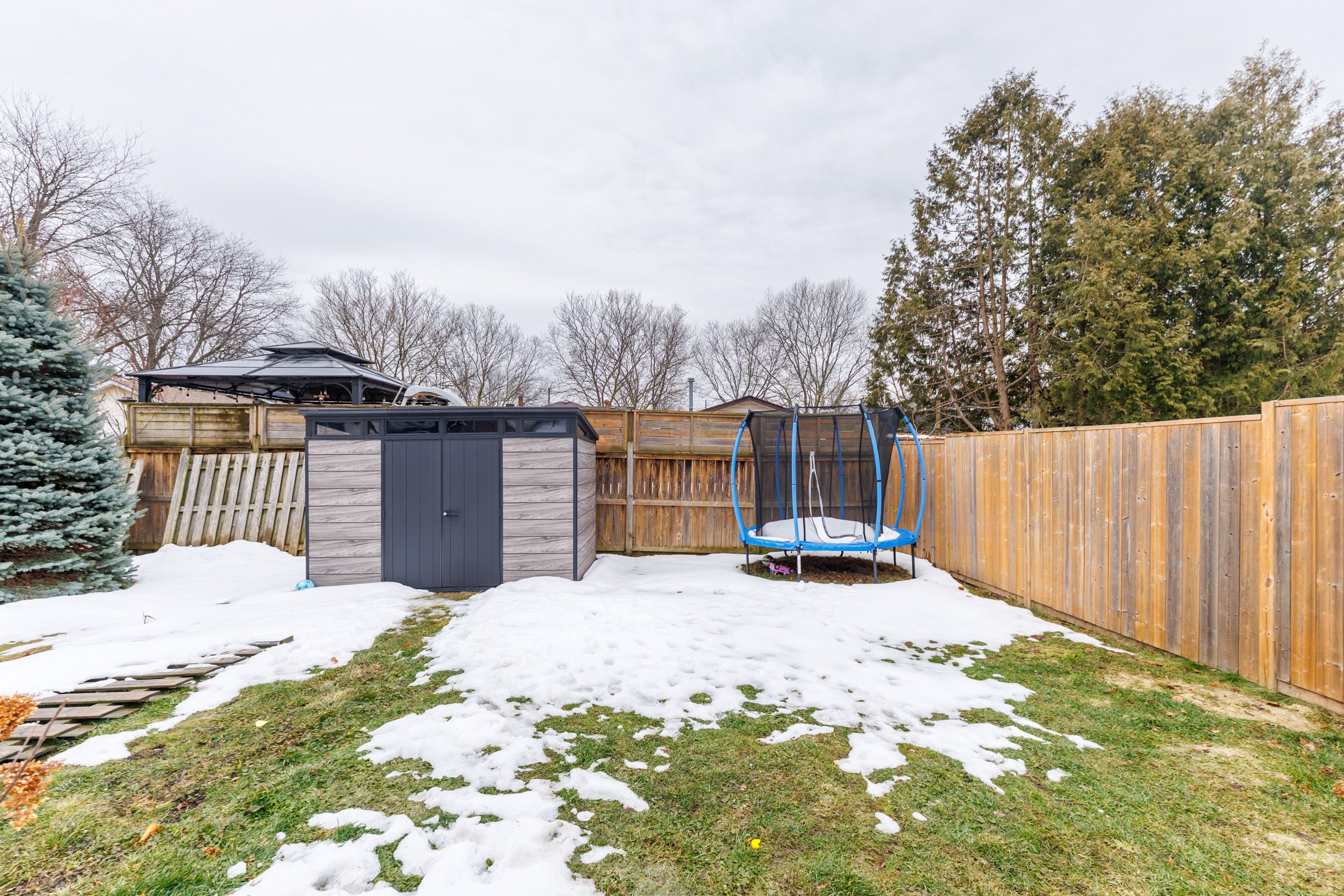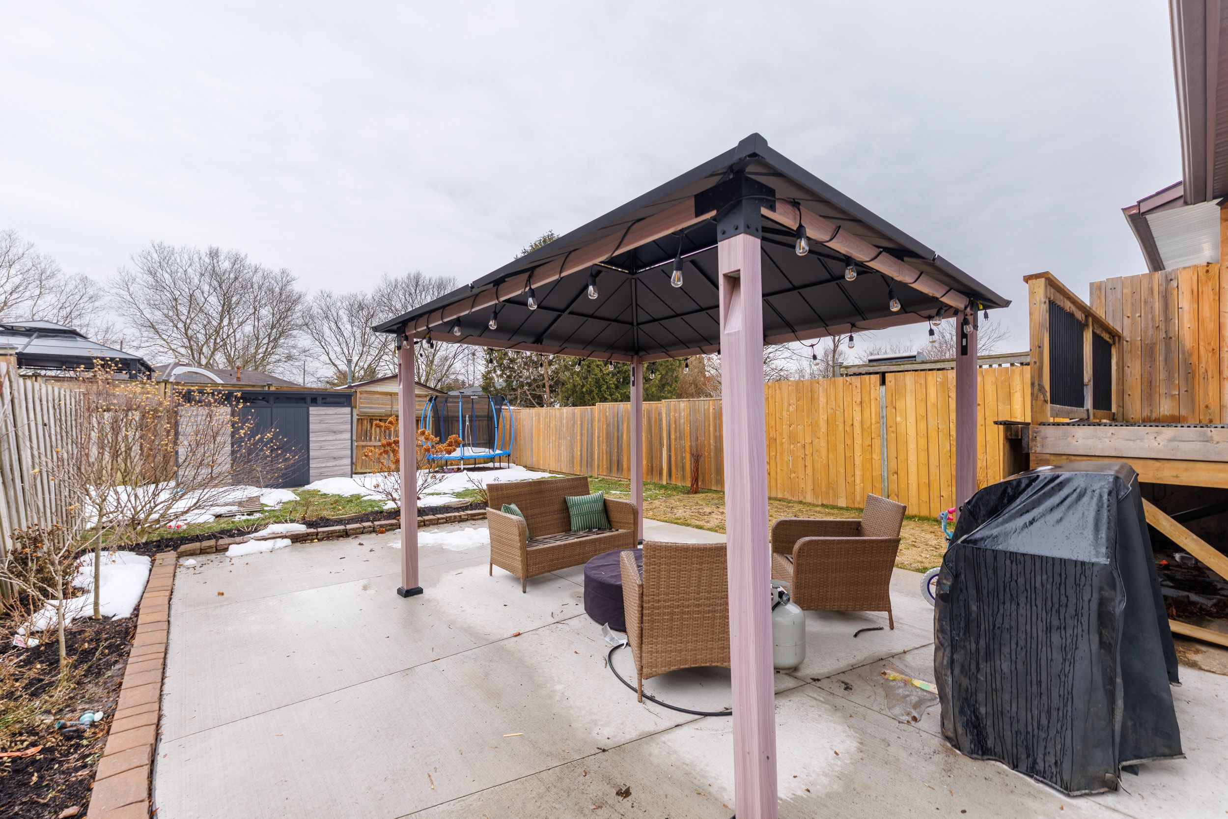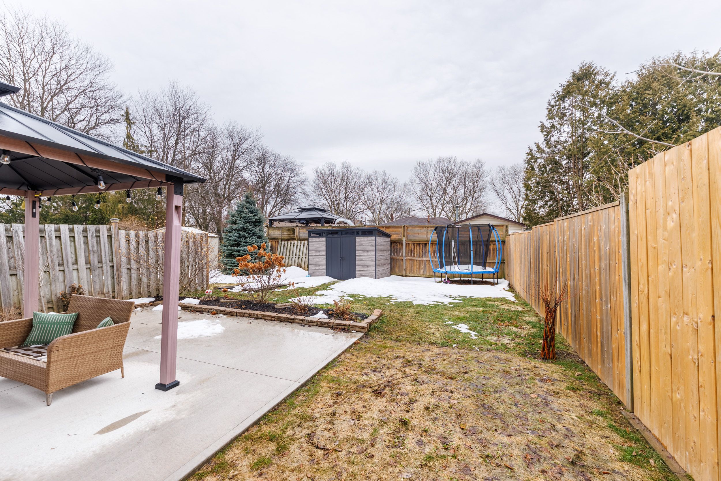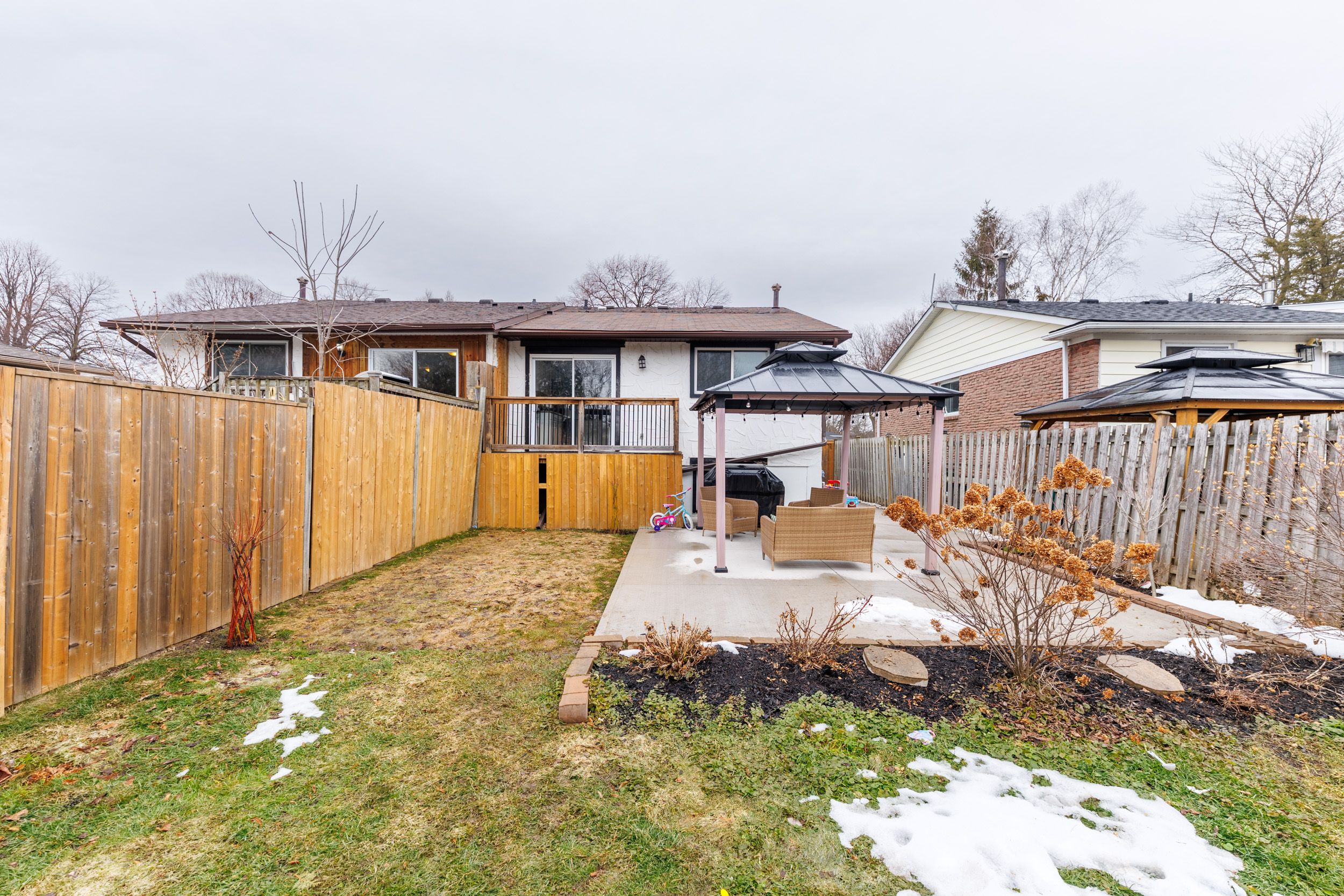 • Fully fenced backyard with a concrete patio for outdoor gatherings and relaxation.