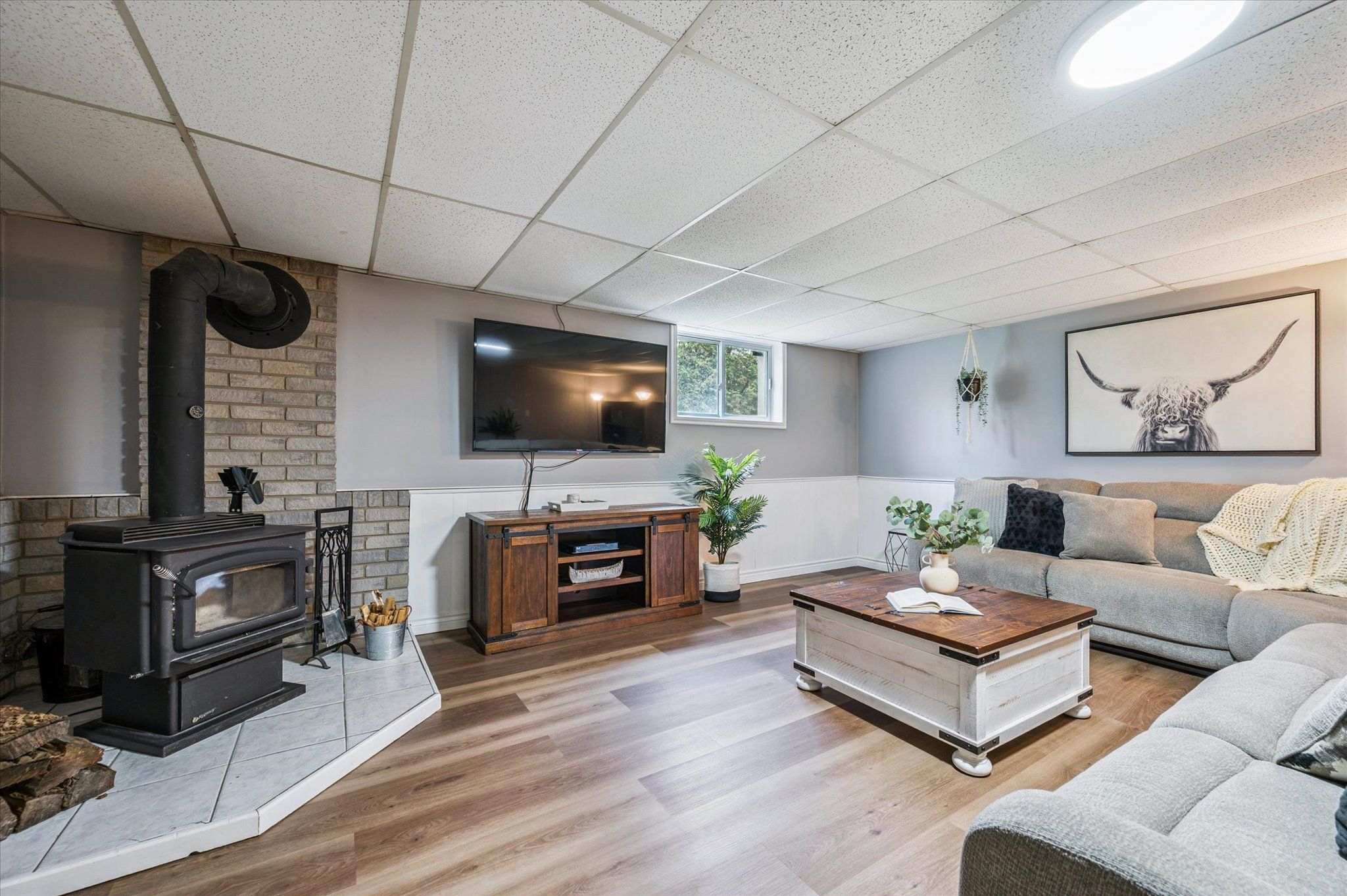 • Walk-out lower level features a cozy woodstove and games area.