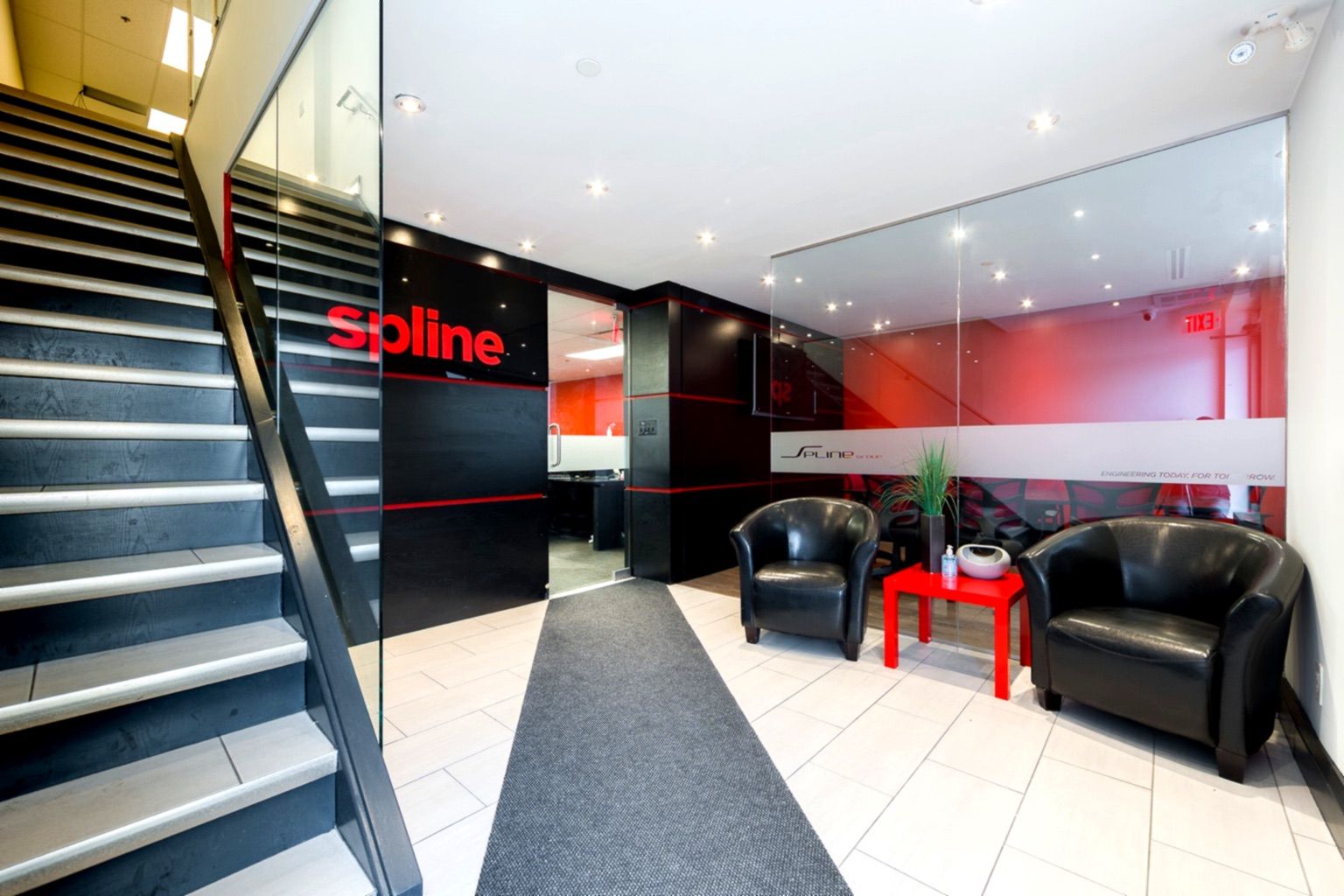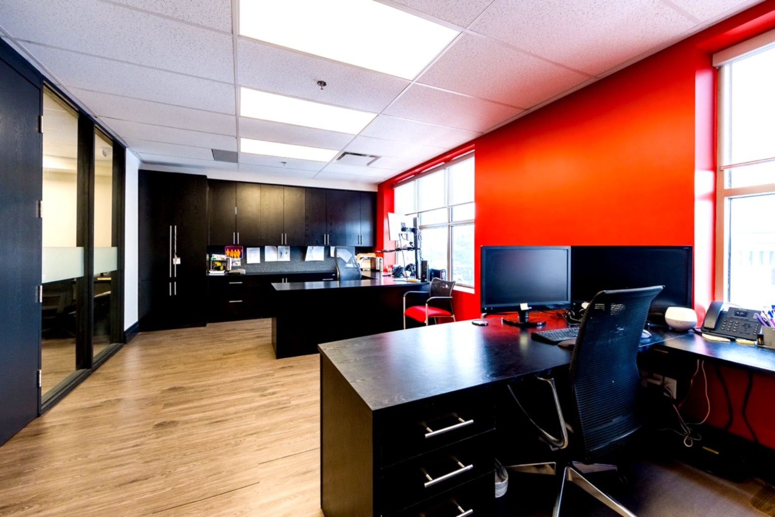 • Features a private glass-enclosed principal office and multiple work areas.