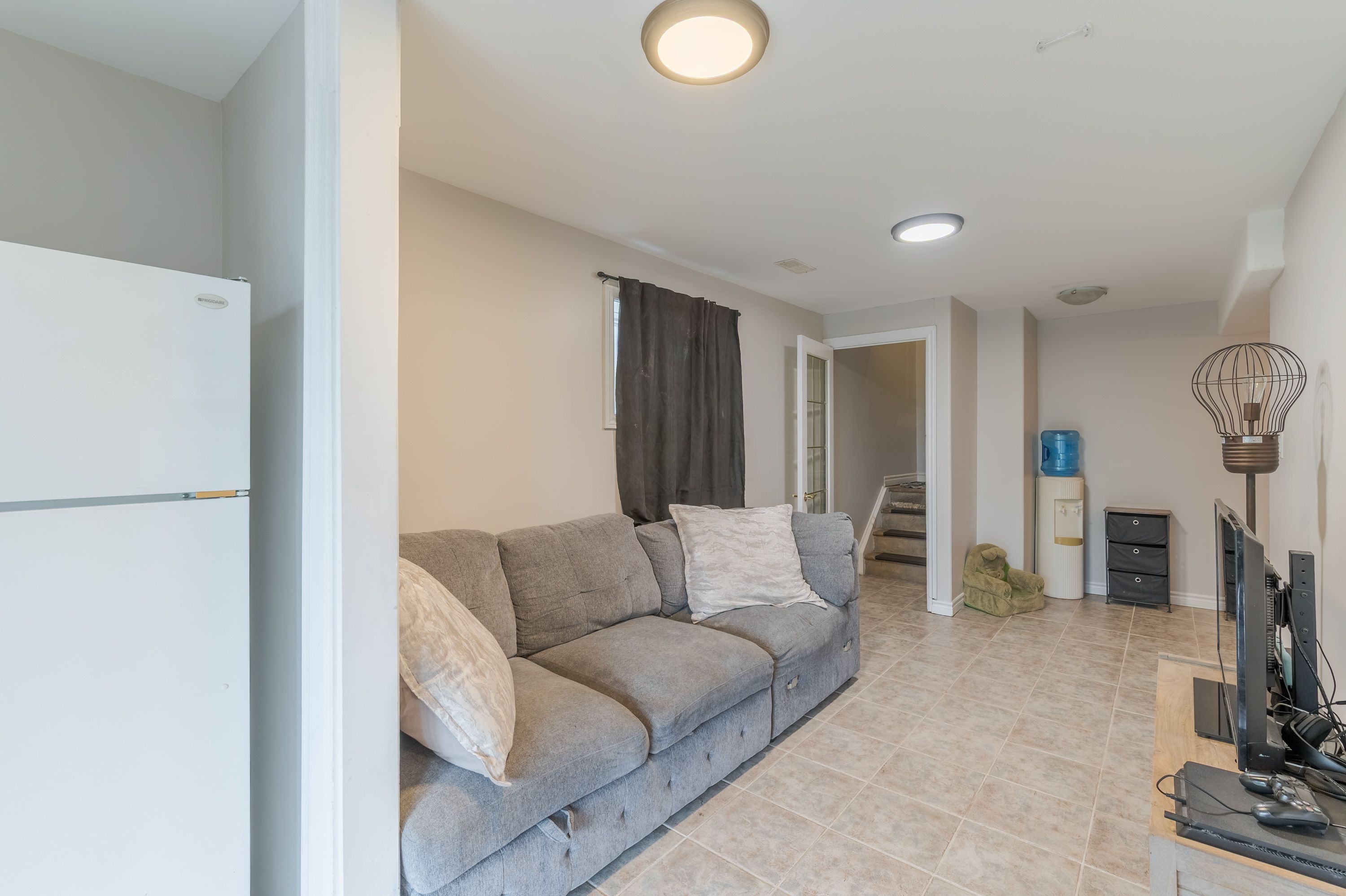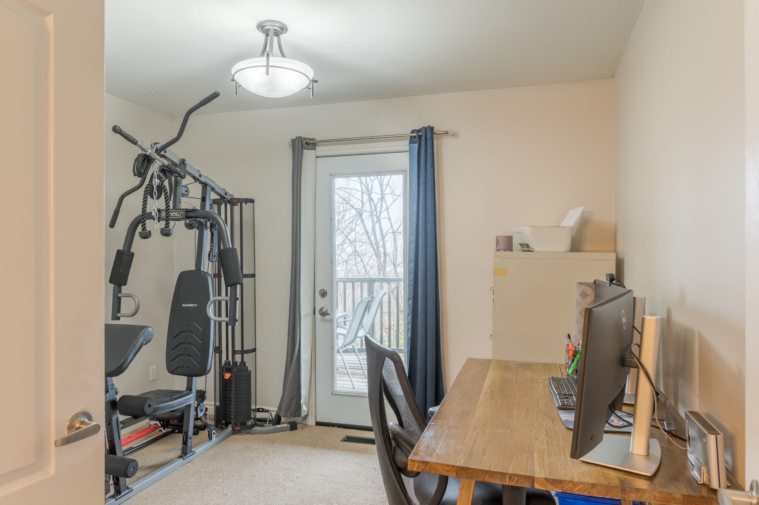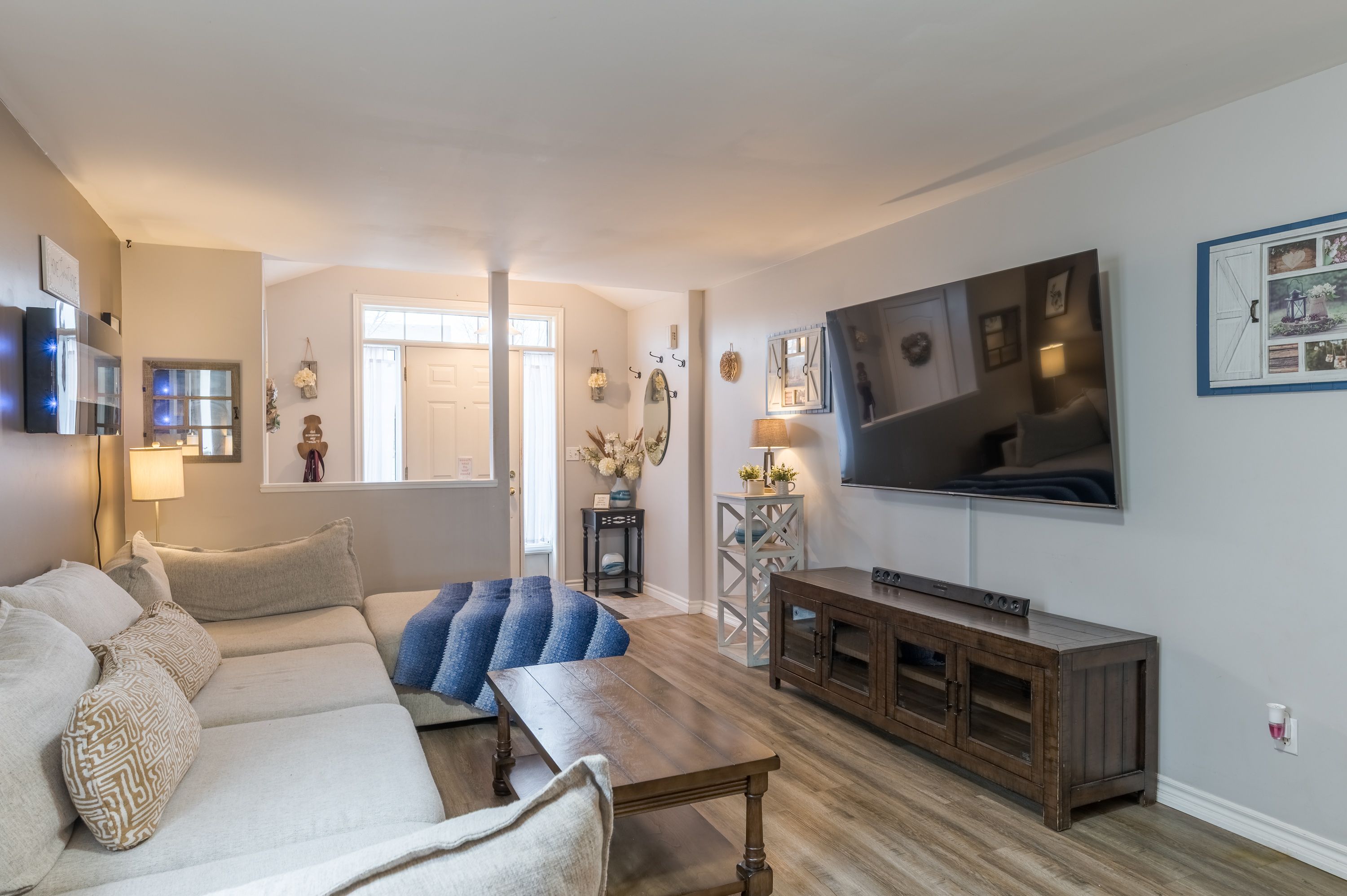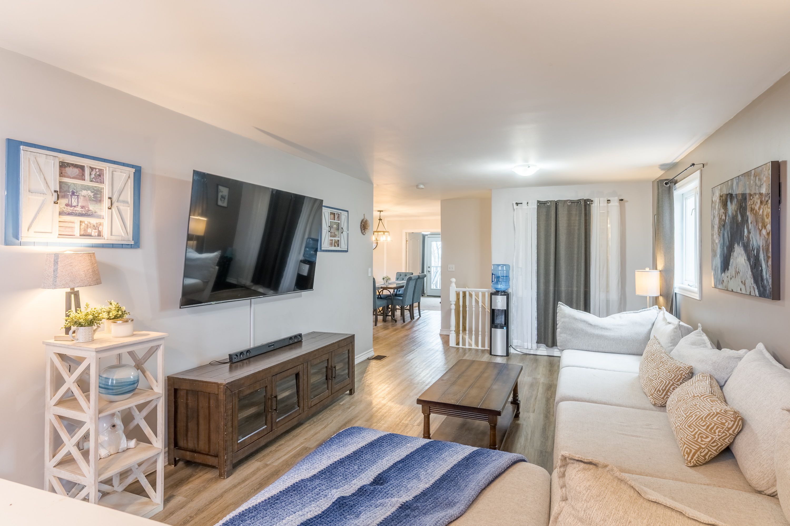 • Main floor living space features an electric fireplace and deck access.