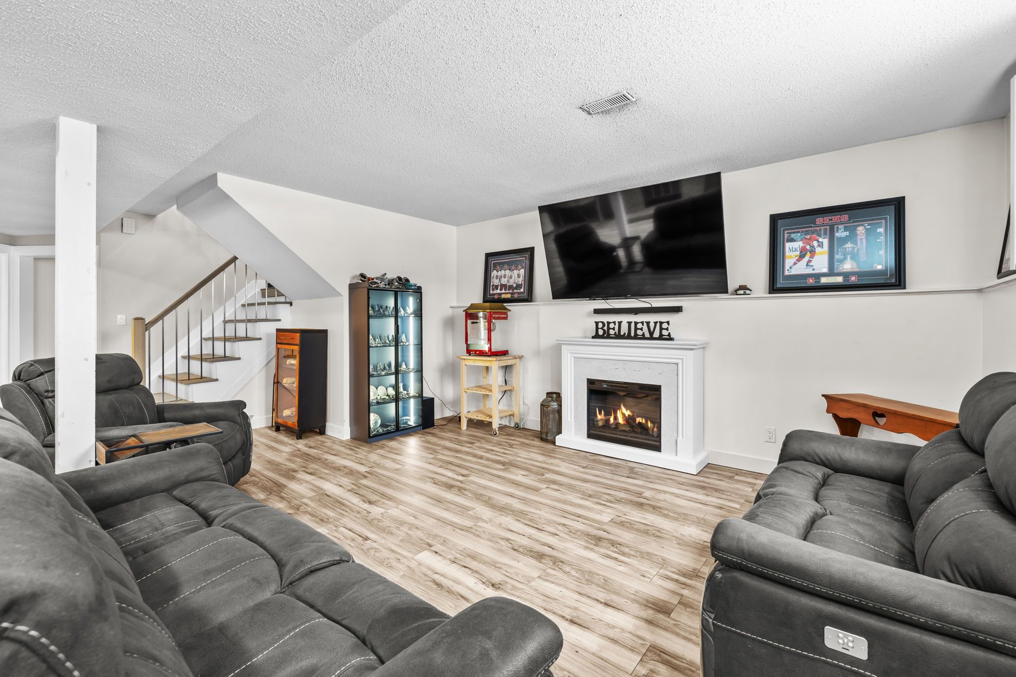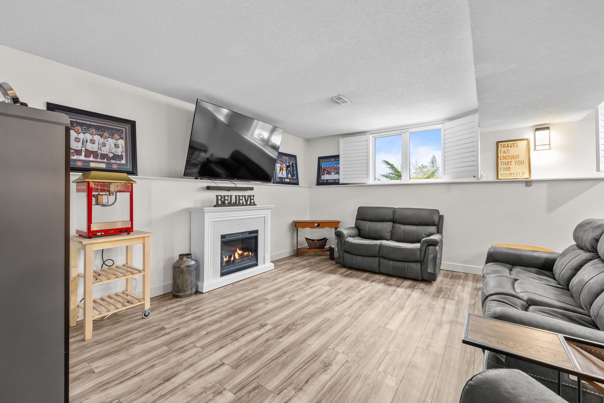 • Finished basement includes cozy family room with wood-burning fireplace.