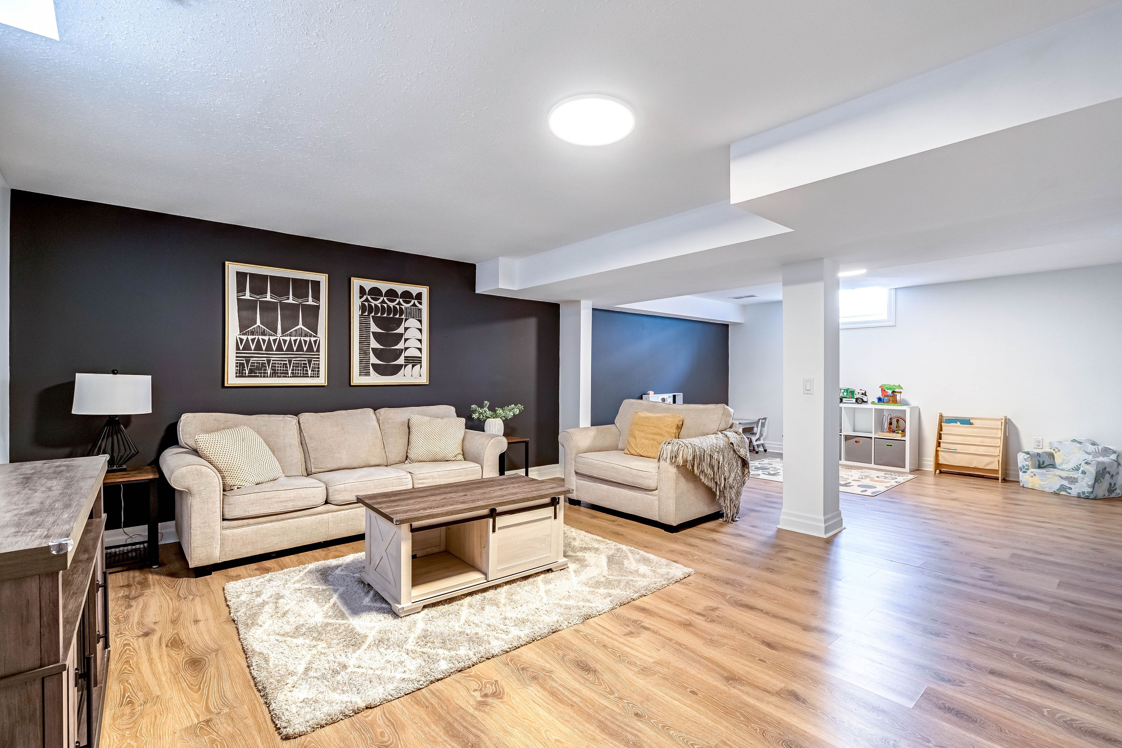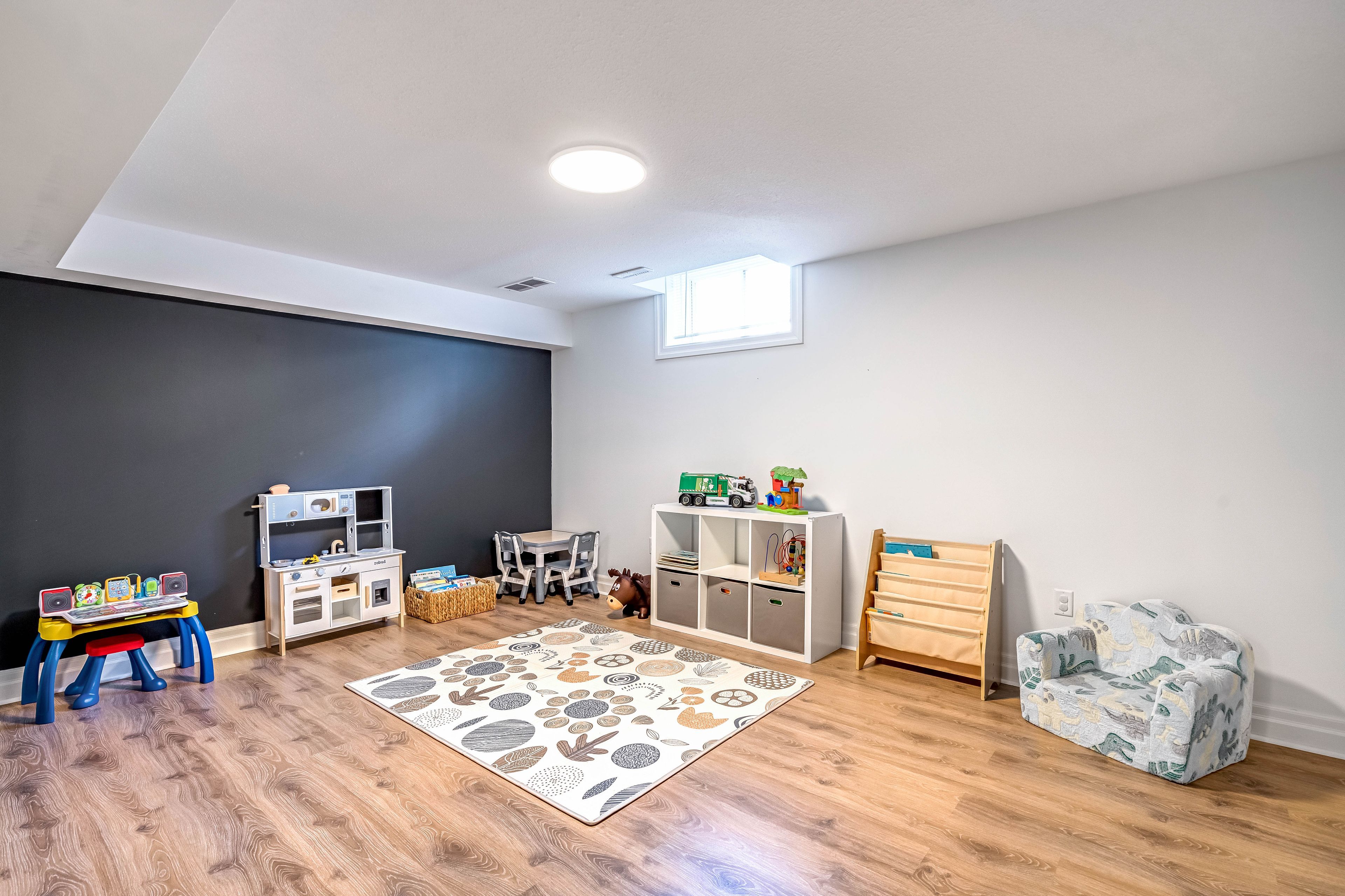 • Finished basement adds extra bedroom, bathroom, and play space.