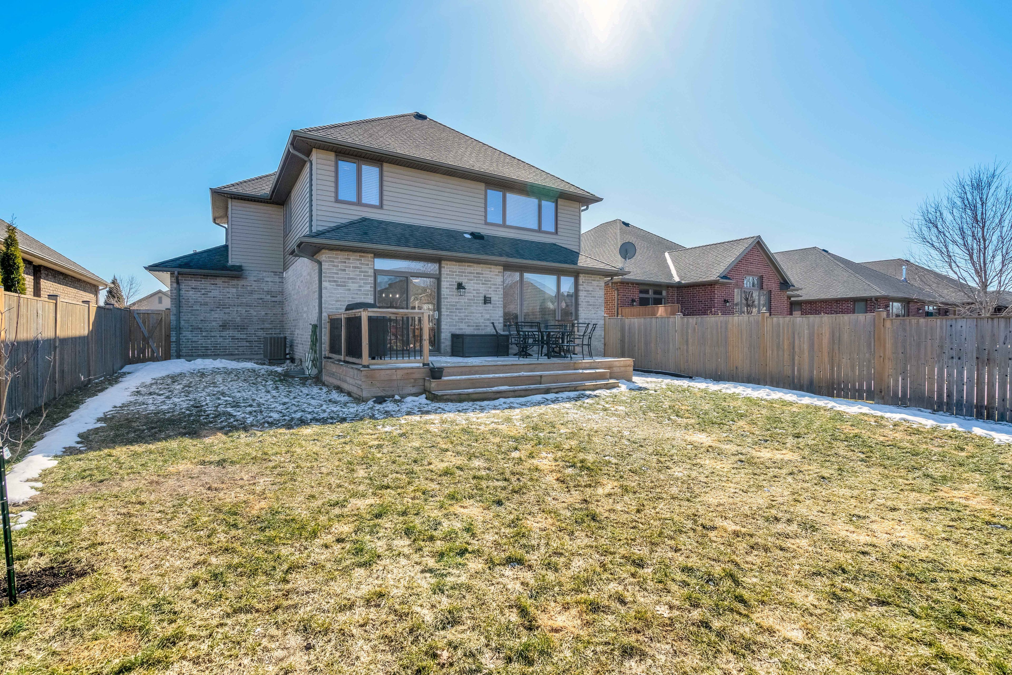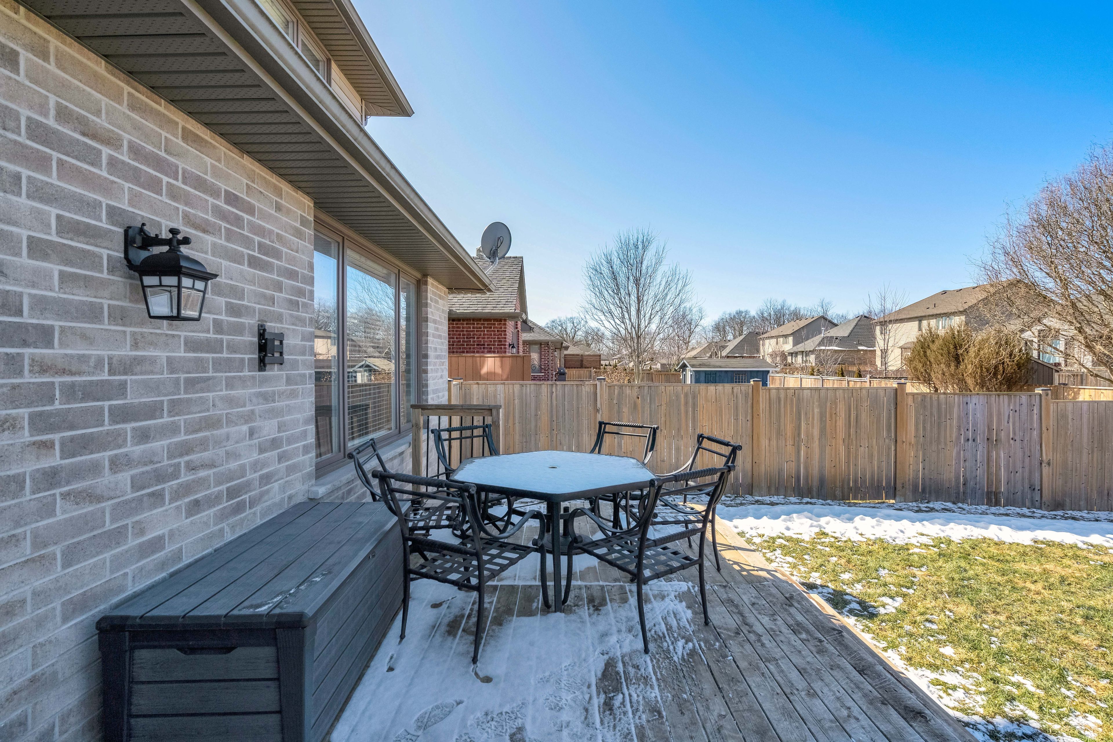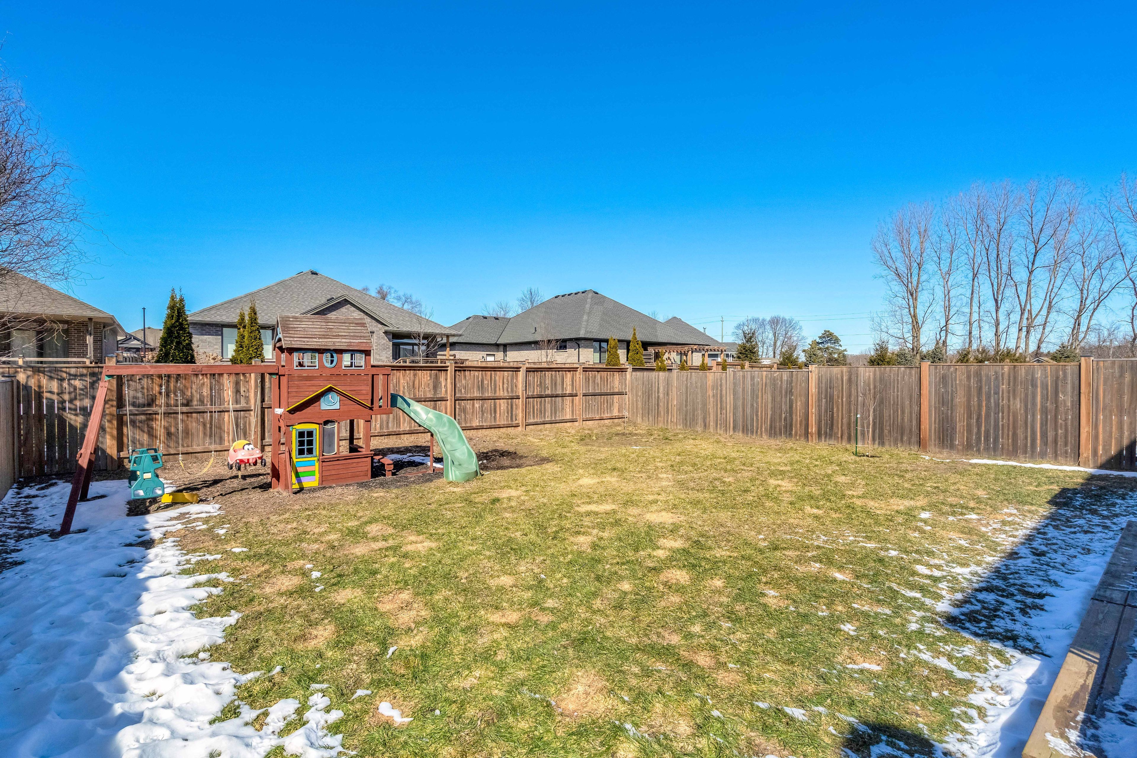 • Fully fenced backyard with deck and included kids' playground.