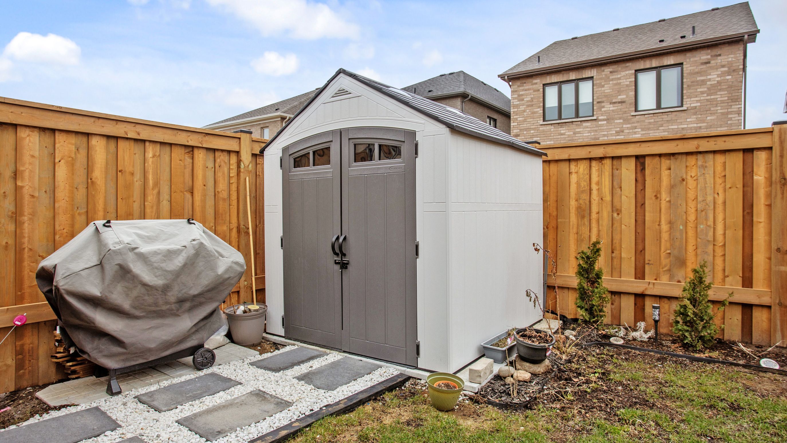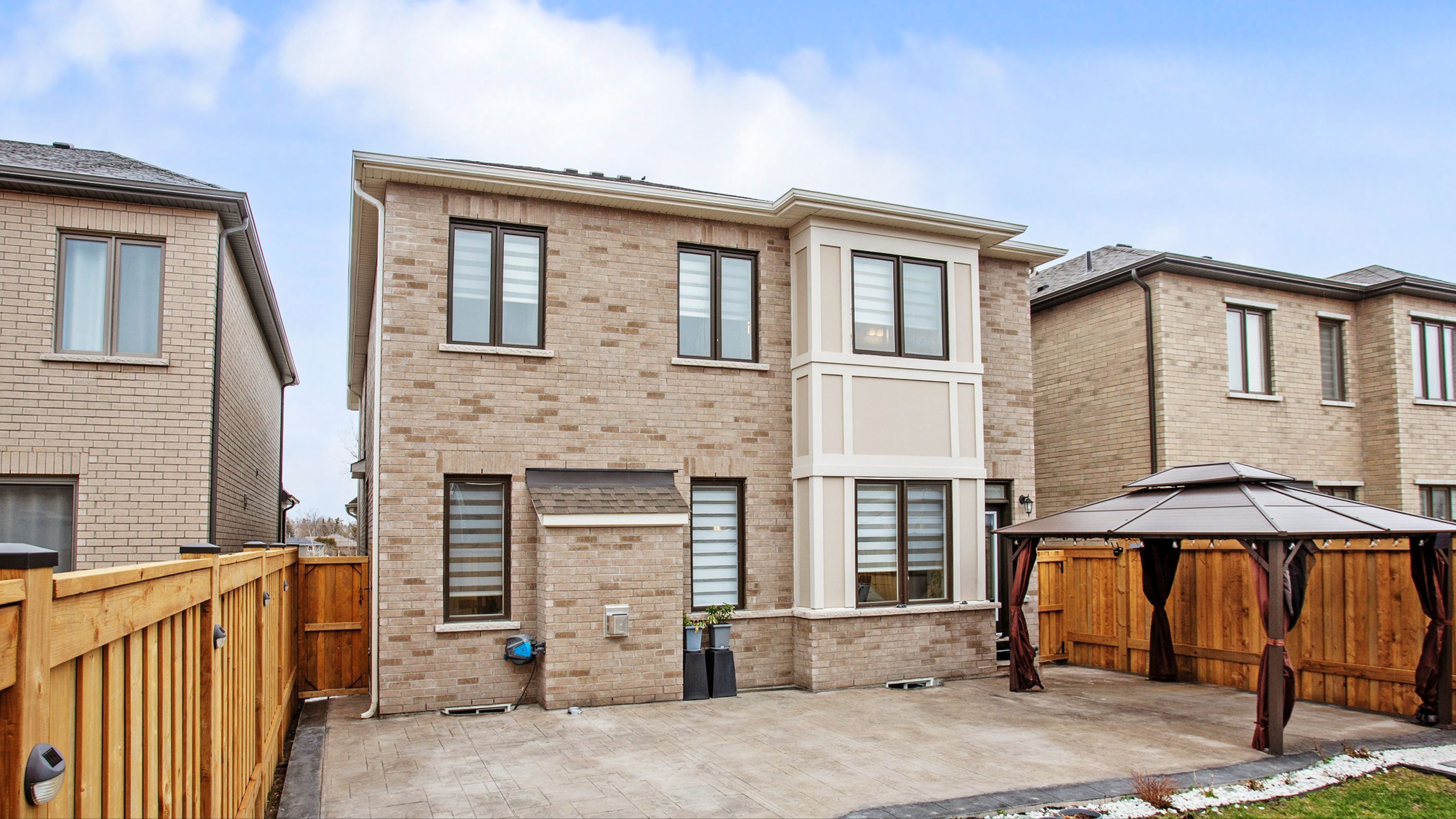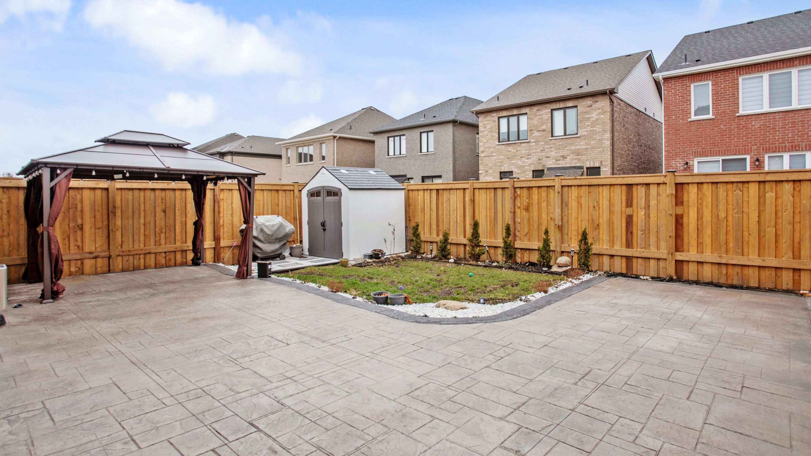 • Fully fenced backyard oasis with stamped concrete and gazebo.
