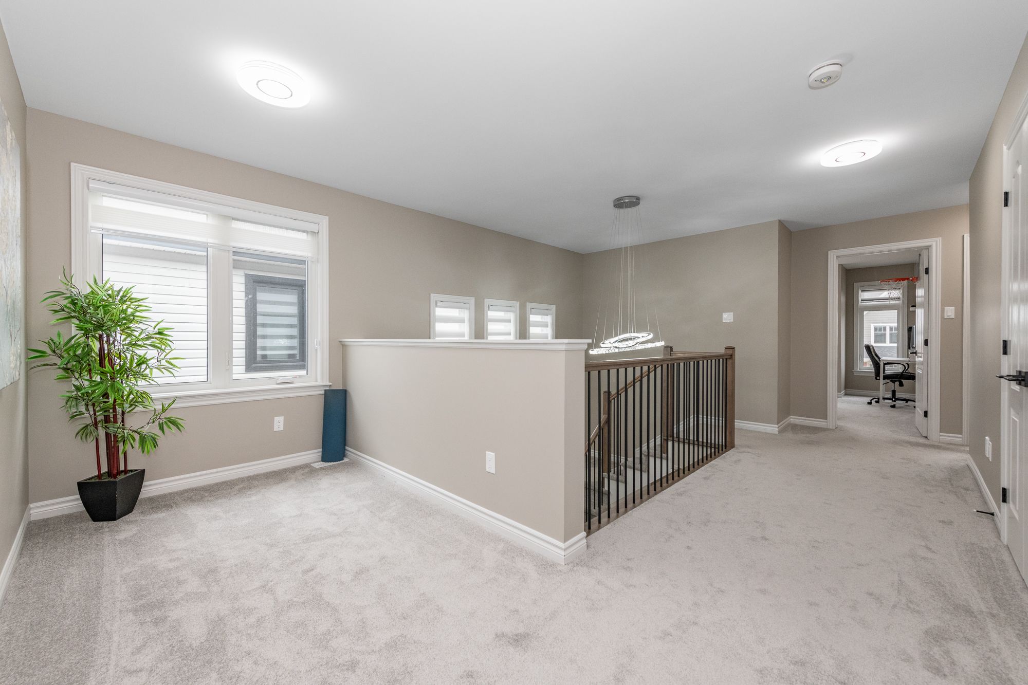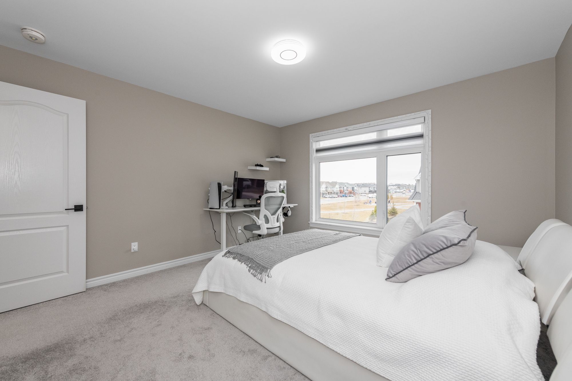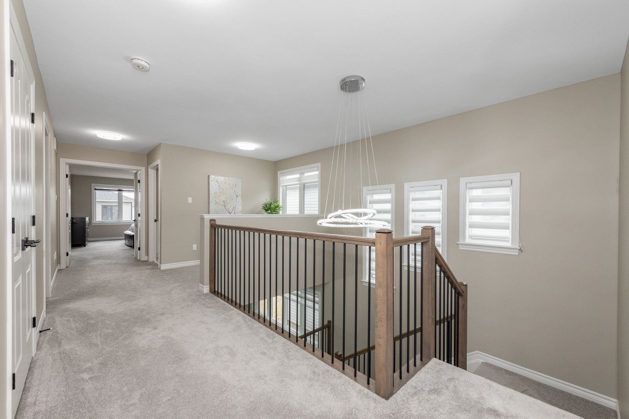 Tamarack home, 2022-built with 4 beds/4 baths and offering over 3,100 sq ft of living space (with 3 full baths on 2nd floor!) situated across from a park. The main level features 9' ceilings, upgraded engineered hardwood floors, an open-concept layout, and modern kitchen with quartz counters, stainless steel appliances, built-in oven & microwave, high-end cabinetry and walk-in pantry. Cozy gas fireplace in living room, central vac with automatic dustpan, and custom zebra blinds throughout. Upstairs includes 4 spacious bedrooms with upgraded carpet, including a primary suite with walk-in closet and luxurious ensuite with double sinks, soaker tub, and separate shower. A guest bedroom features its own ensuite, with 3 full bathrooms on the upper level. Convenient second-floor laundry with sink and storage. Fully finished basement offers a large rec room, soft carpeting, and ample storage. Located across from a park and near top-rated schools, convenient shopping, restaurants and community amenities, with easy access to major routes for commuting.