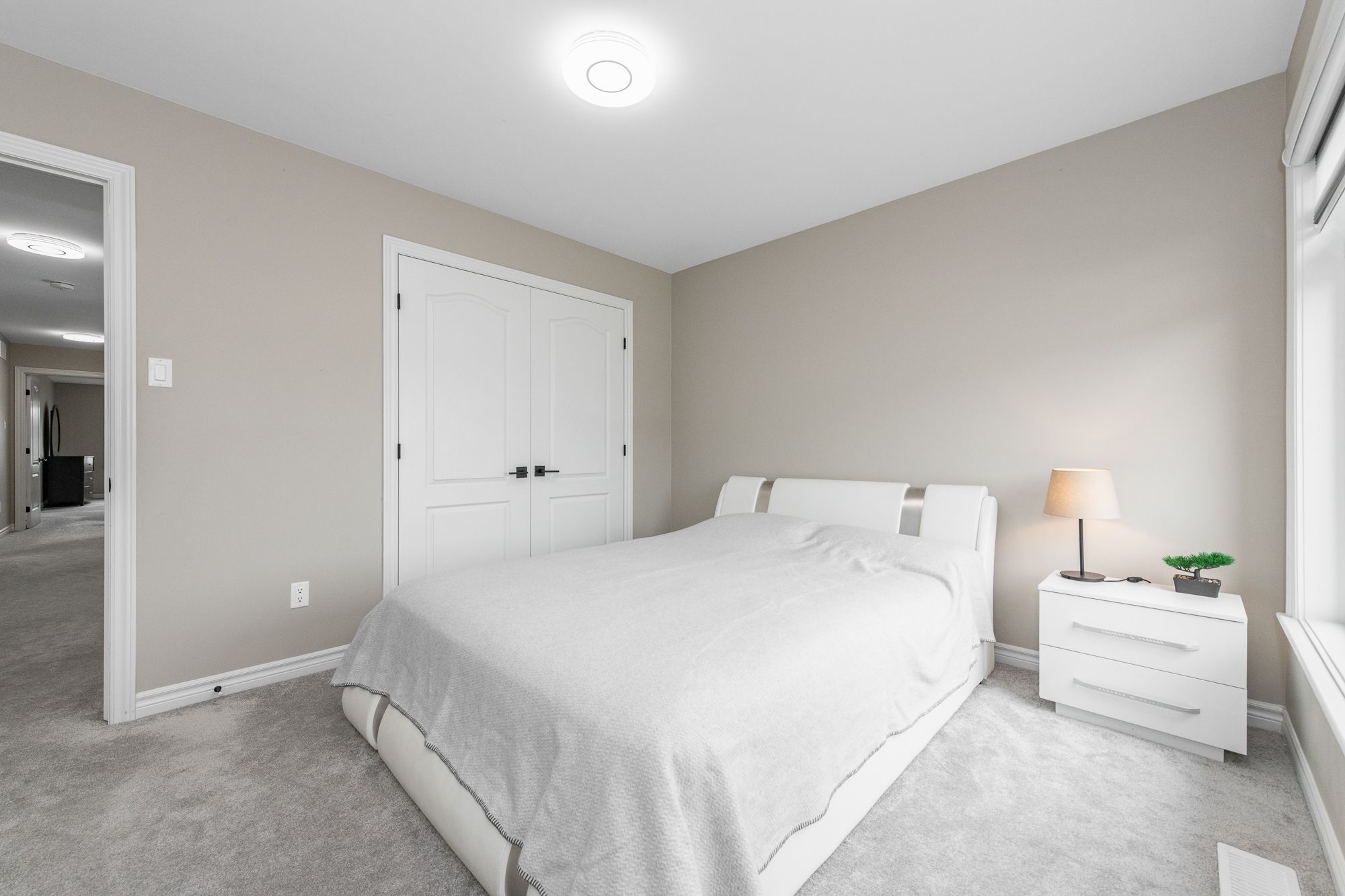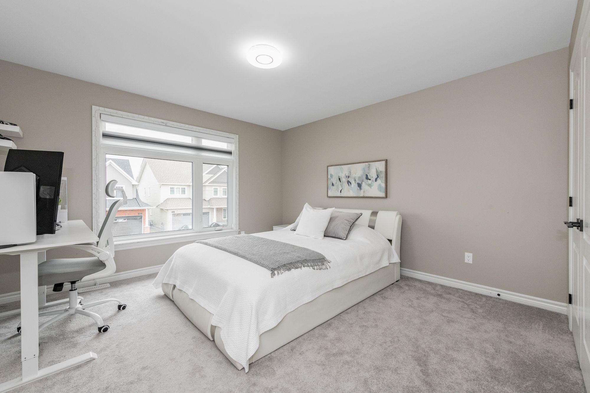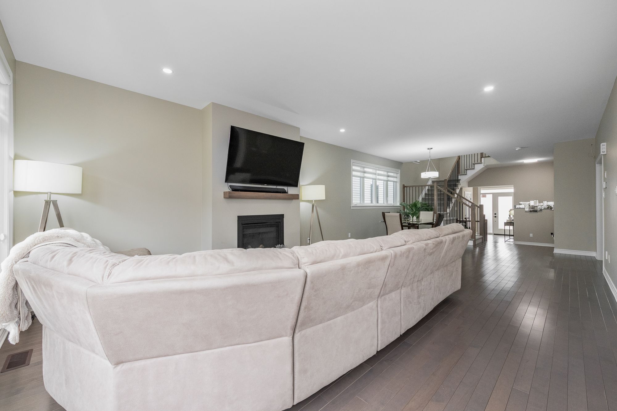 Tamarack home, 2022-built with 4 beds/4 baths and offering over 3,100 sq ft of living space (with 3 full baths on 2nd floor!) situated across from a park. The main level features 9' ceilings, upgraded engineered hardwood floors, an open-concept layout, and modern kitchen with quartz counters, stainless steel appliances, built-in oven & microwave, high-end cabinetry and walk-in pantry. Cozy gas fireplace in living room, central vac with automatic dustpan, and custom zebra blinds throughout. Upstairs includes 4 spacious bedrooms with upgraded carpet, including a primary suite with walk-in closet and luxurious ensuite with double sinks, soaker tub, and separate shower. A guest bedroom features its own ensuite, with 3 full bathrooms on the upper level. Convenient second-floor laundry with sink and storage. Fully finished basement offers a large rec room, soft carpeting, and ample storage. Located across from a park and near top-rated schools, convenient shopping, restaurants and community amenities, with easy access to major routes for commuting.
