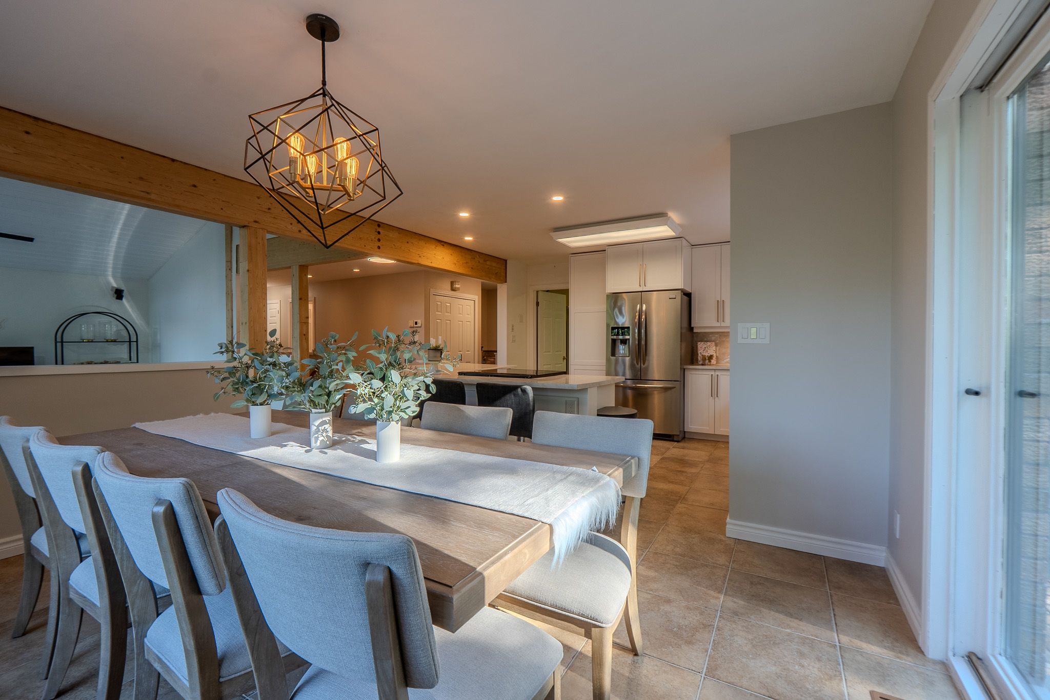• Modern kitchen flows into living and dining areas, great for entertaining.