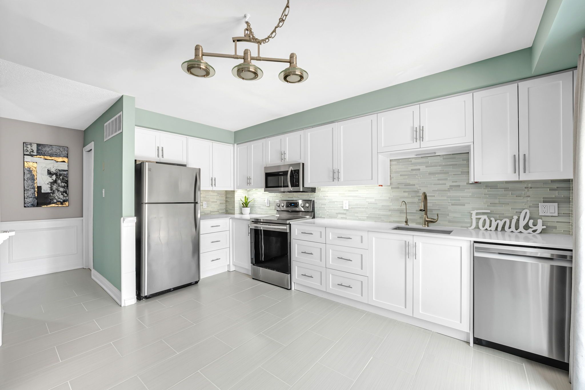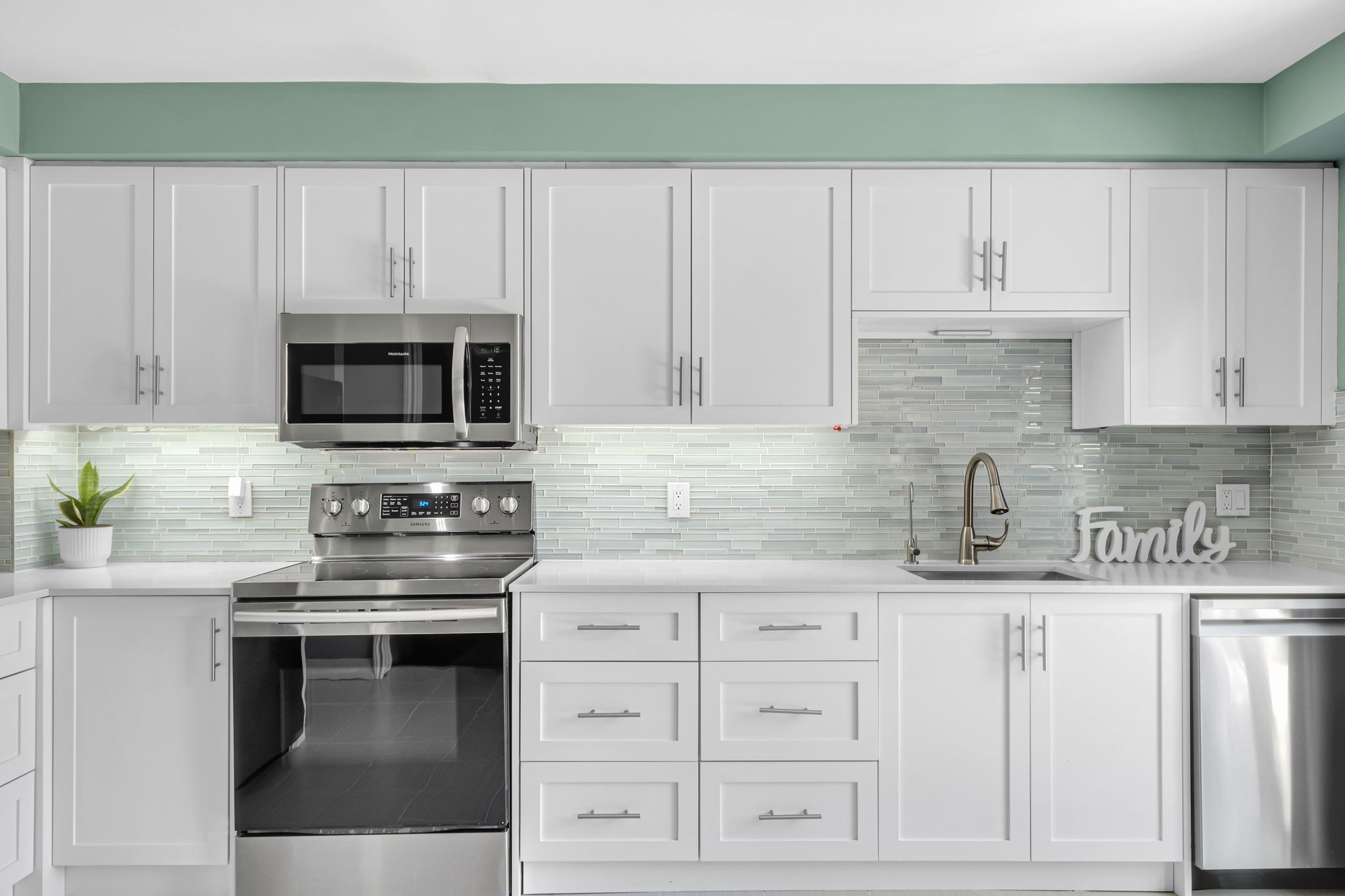 • Stylish kitchen with stainless steel appliances and ample prep space.