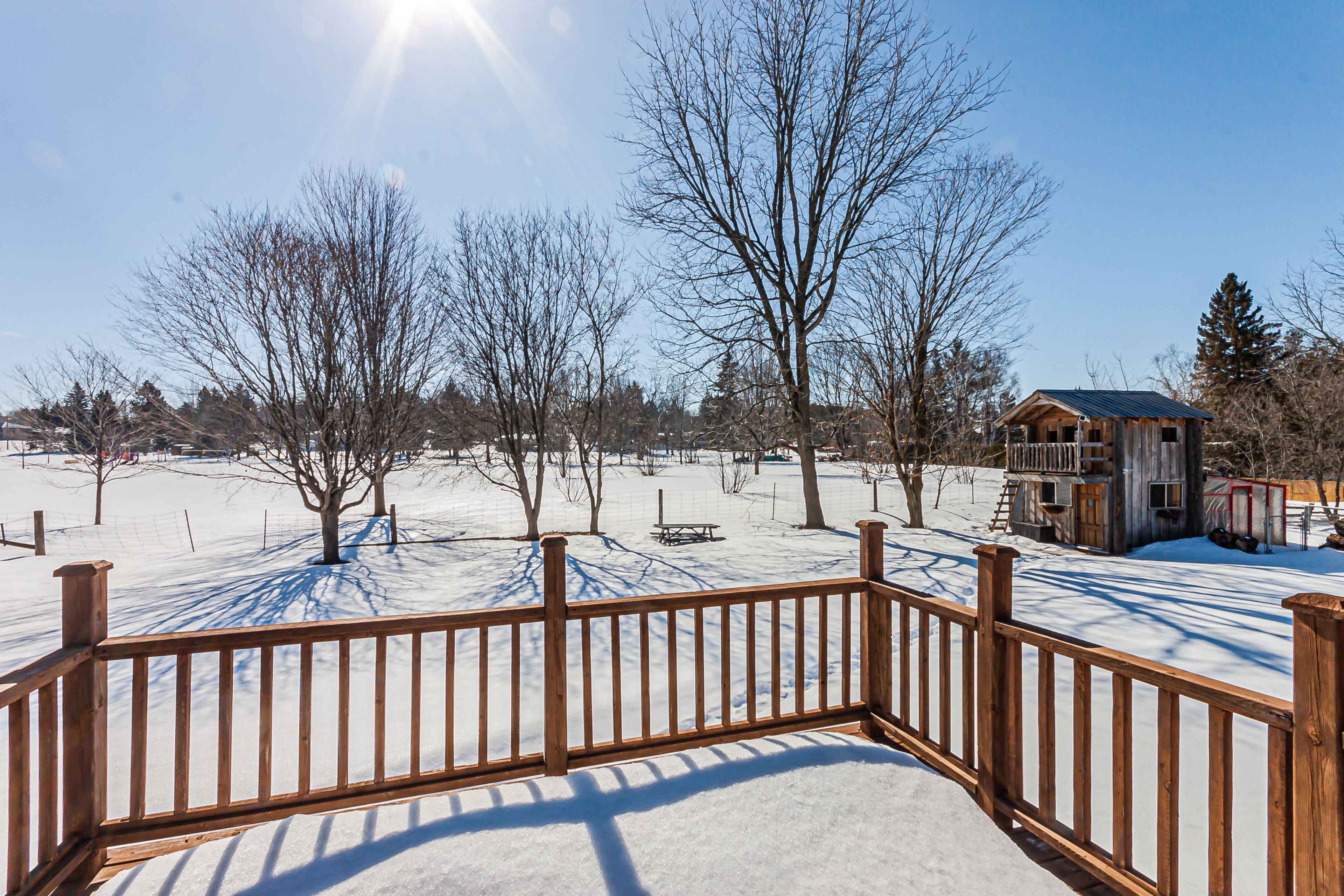 • Large yard with a deck, treehouse, and vegetable garden.