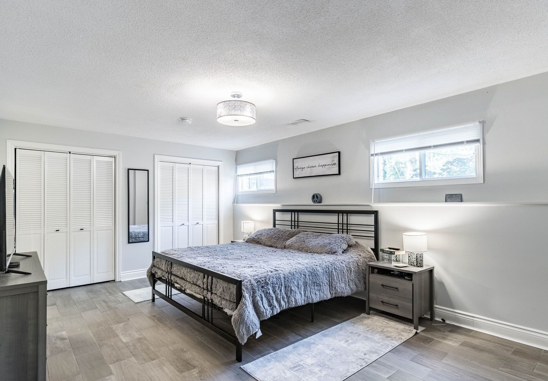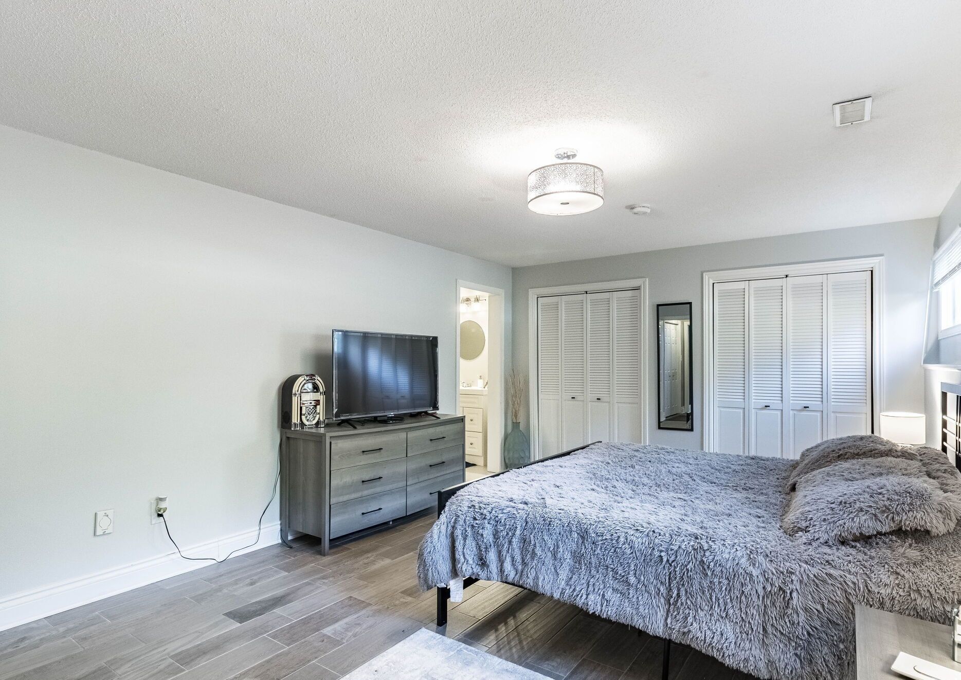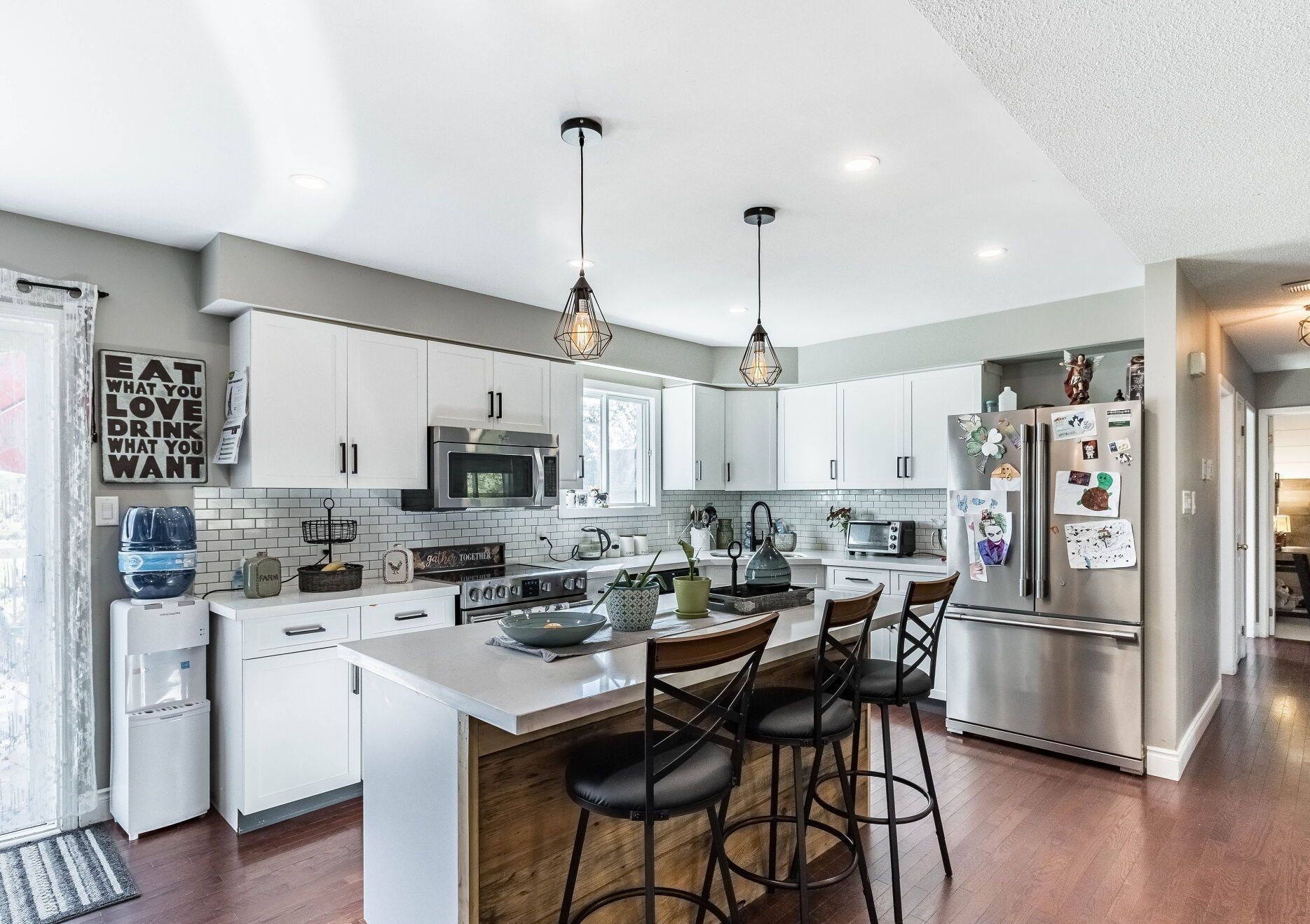 • Spacious kitchen with quartz countertops and stainless steel appliances.