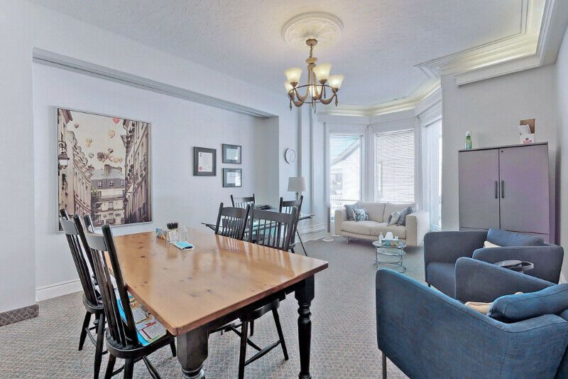 Beautiful main floor office space offers over 350sf of floor space with high elegant ceiling and ample lighting and 3 bay windows to add to the victorian ambiance. Walking distance from tribute communities centre, courthouse, city hall and under 10min to the 401 & 407. Perfect for counsellors, psychotherapists, lawyers, paralegals, mortgage brokers, and any other professional. Gross rent of $880. 00 includes all utilities, tmi, and wi-fi, business signage advertisement for free, 3 waiting areas, and common kitchen area. A must see!