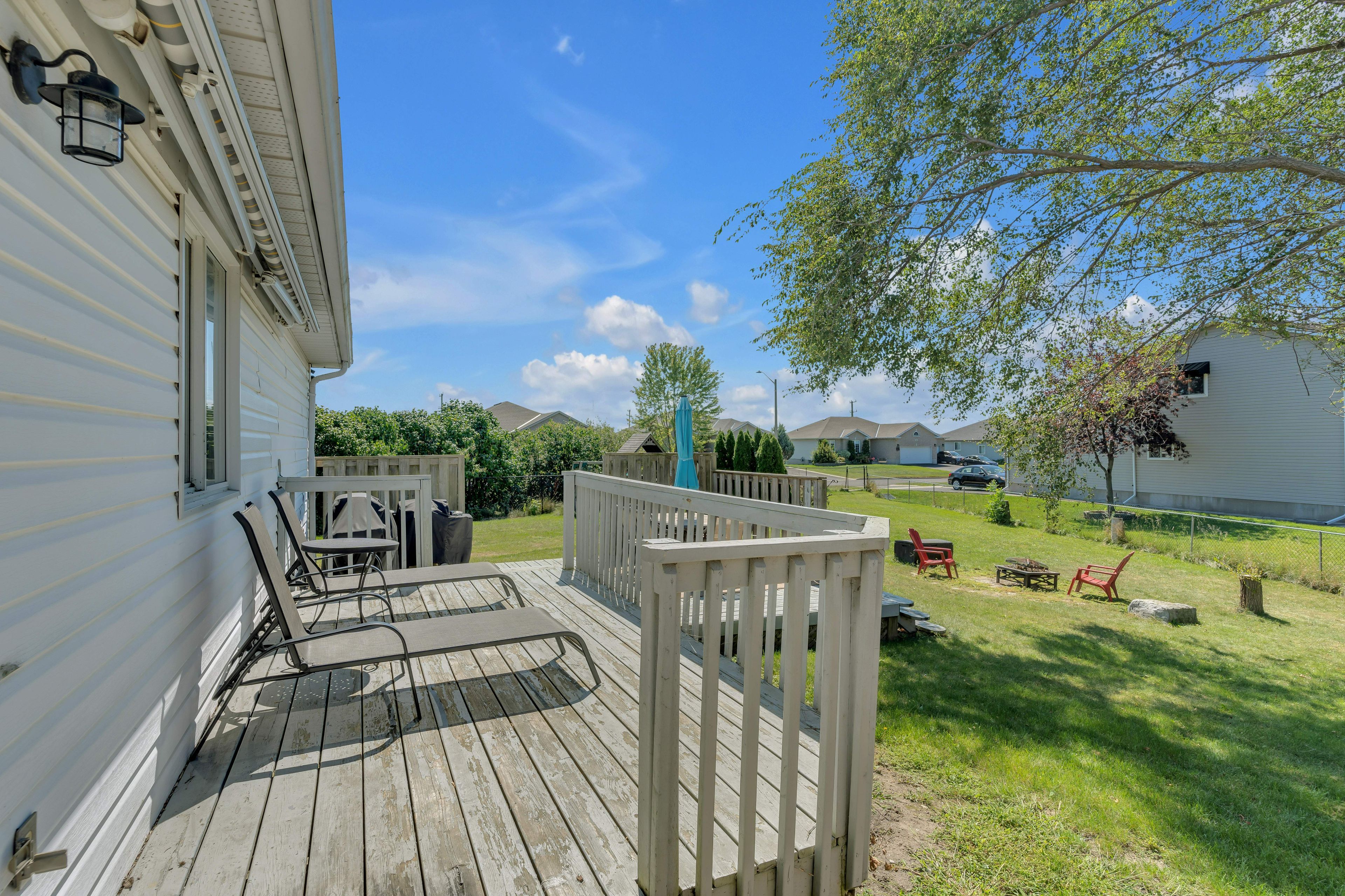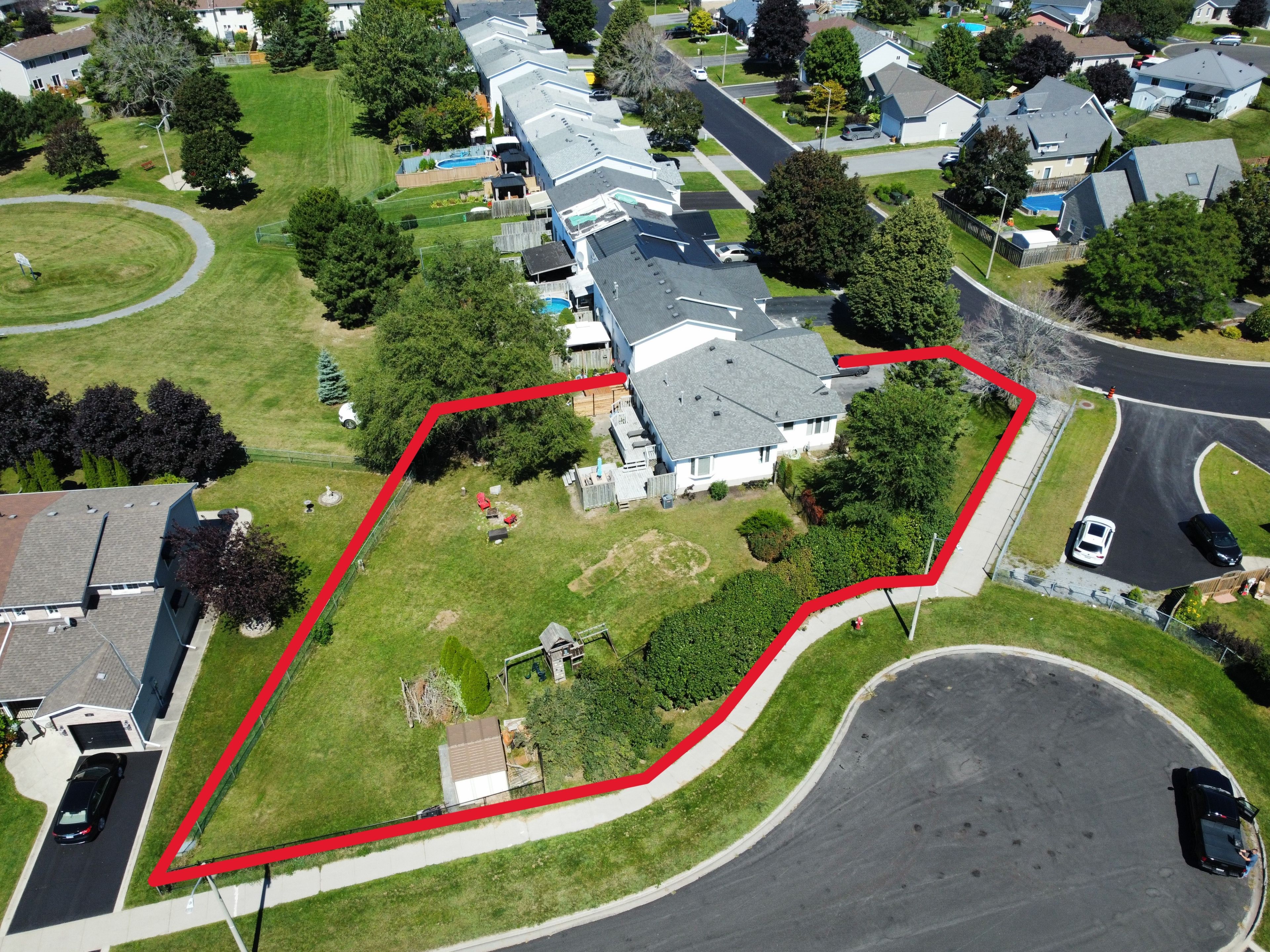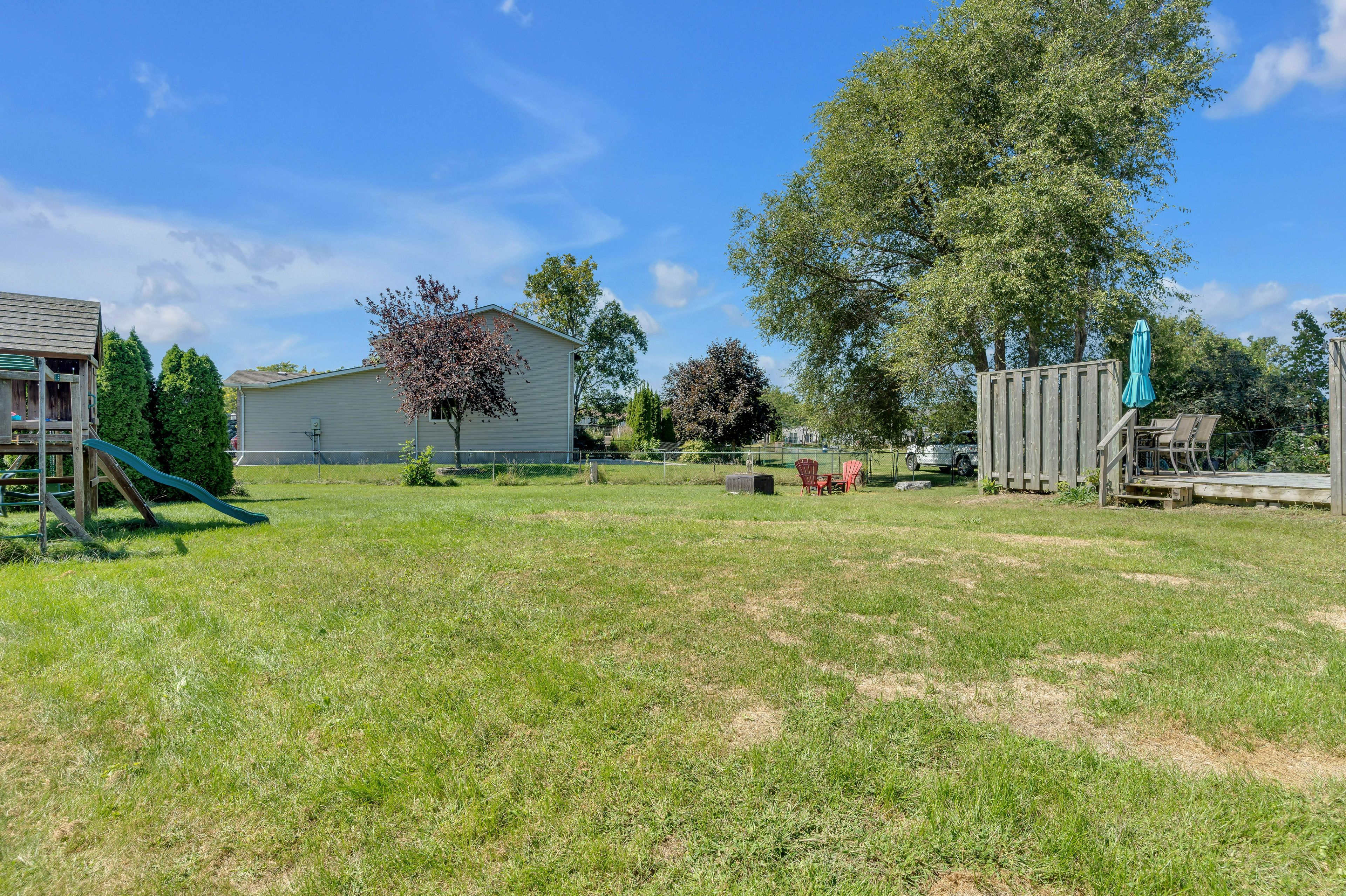 • Fenced backyard includes an above ground pool and park access.