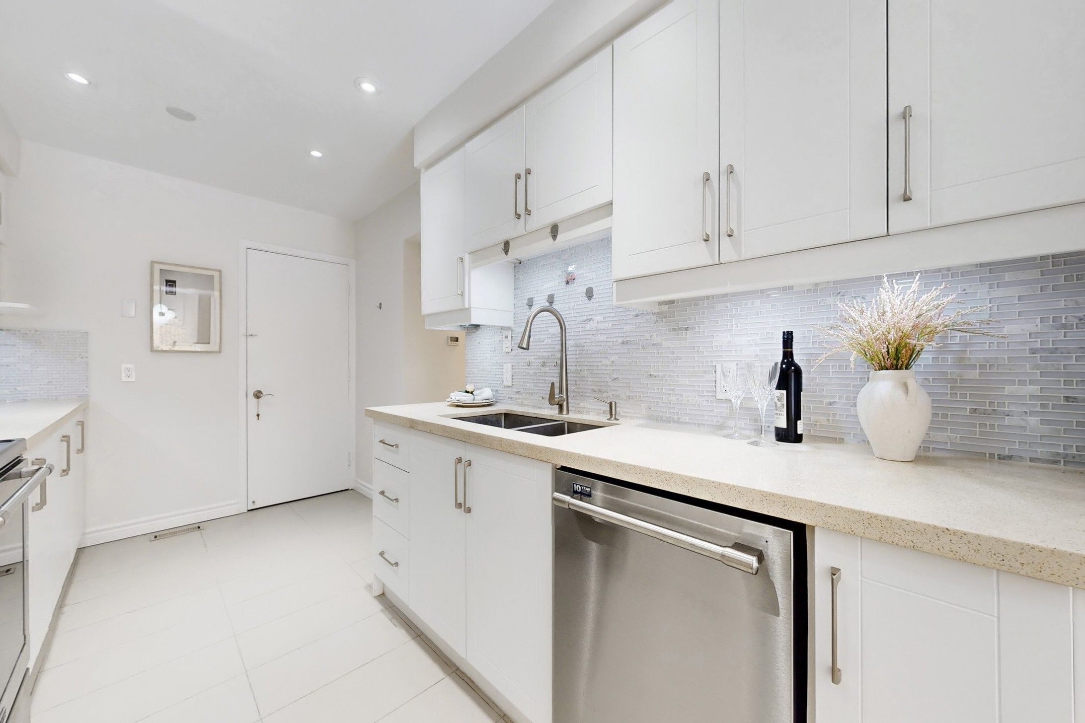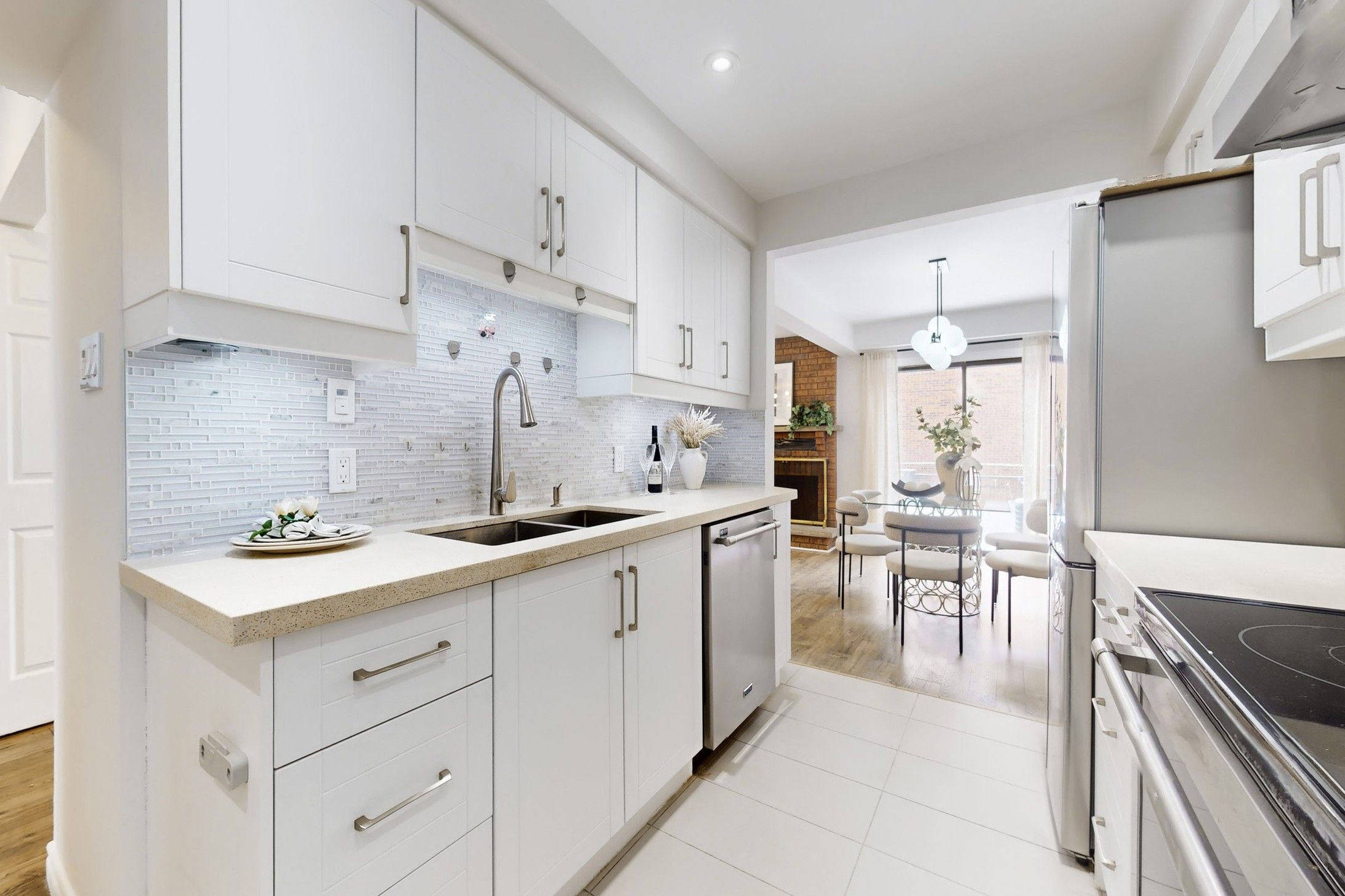 • Modern kitchen with granite counters and breakfast area.