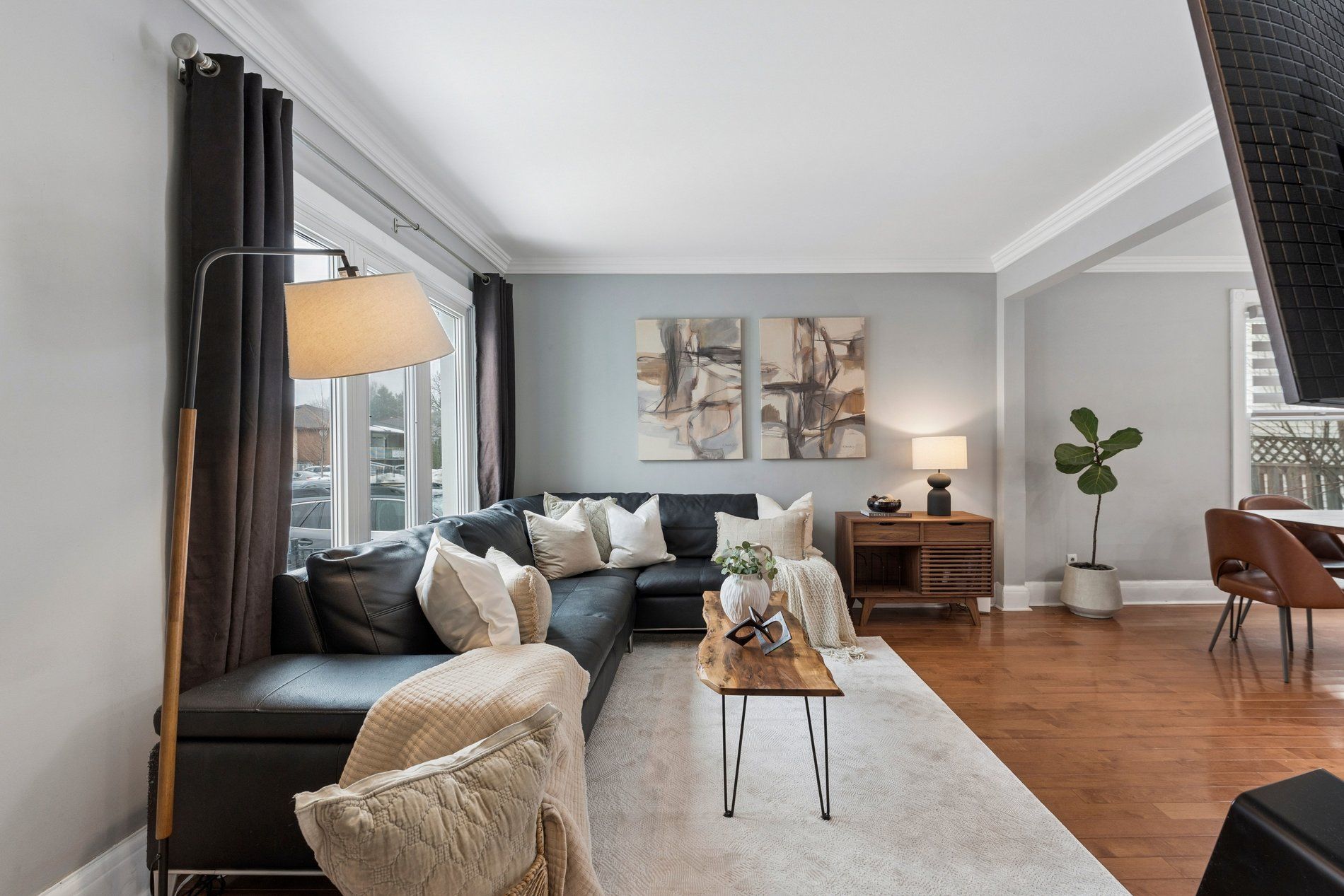 • Bright open-concept living/dining area with large windows and hardwood floors.