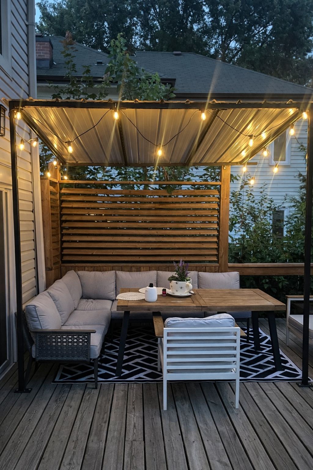• Private, landscaped backyard with built-in deck, fire pit, and garden pond.