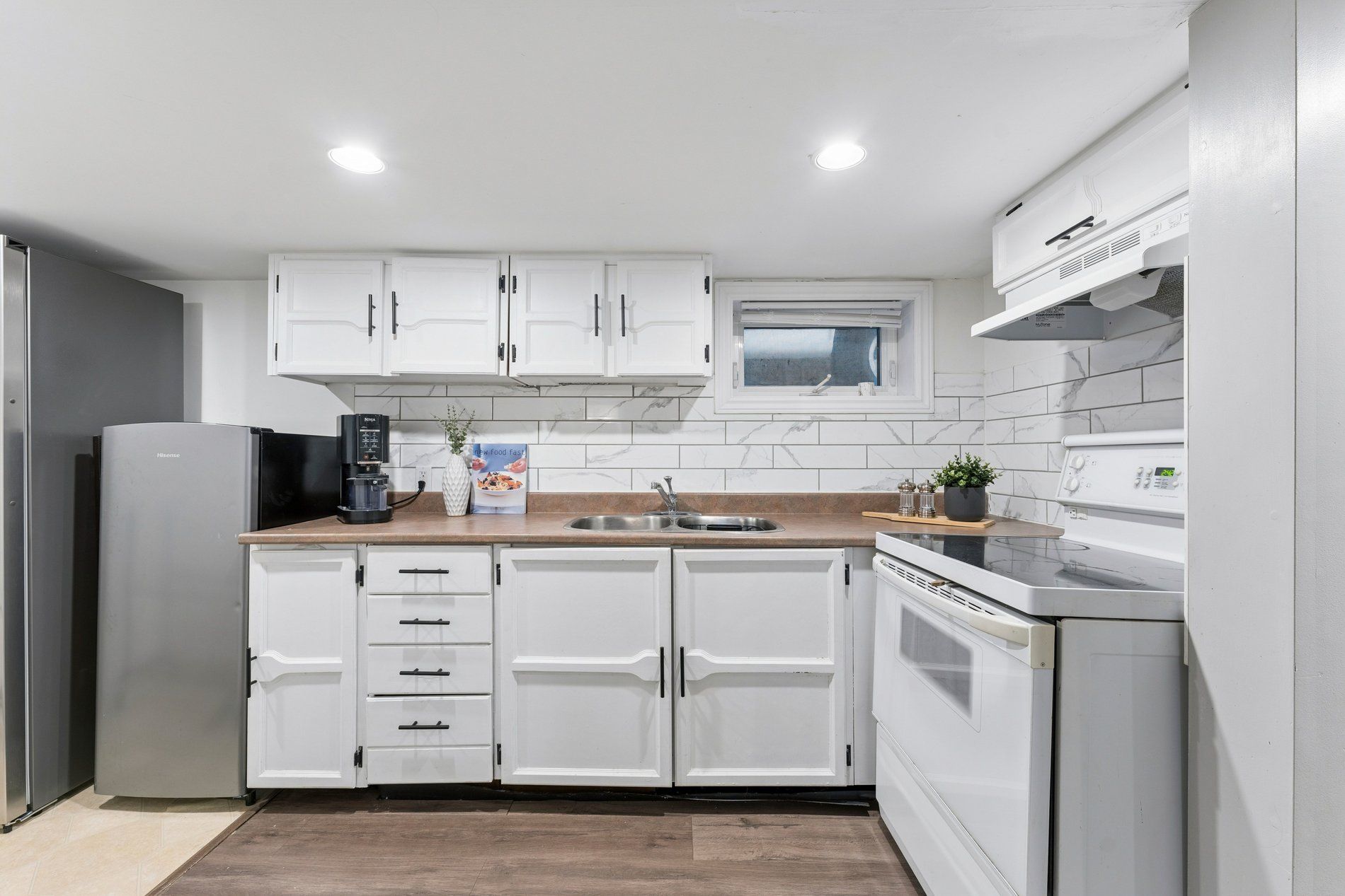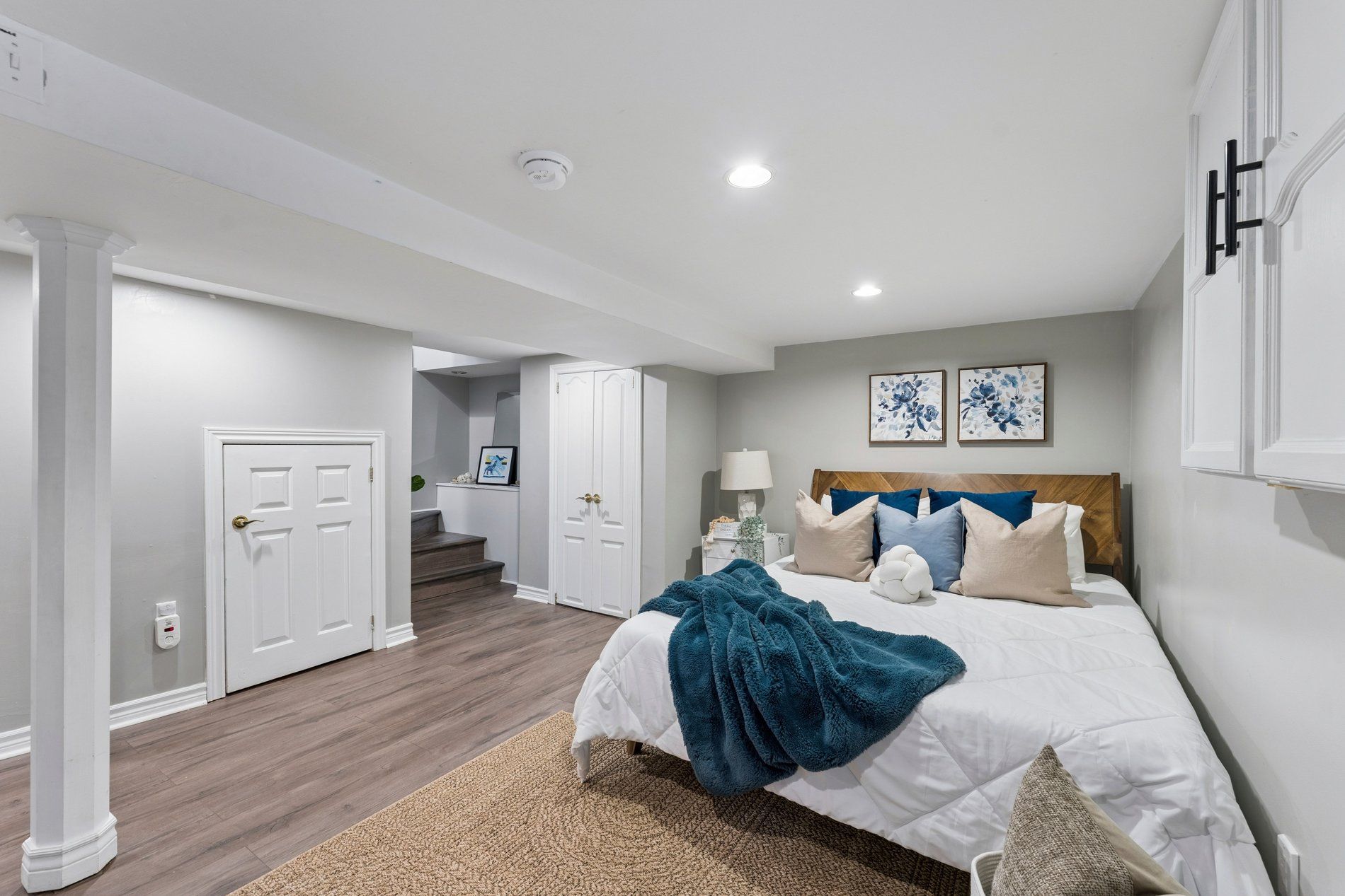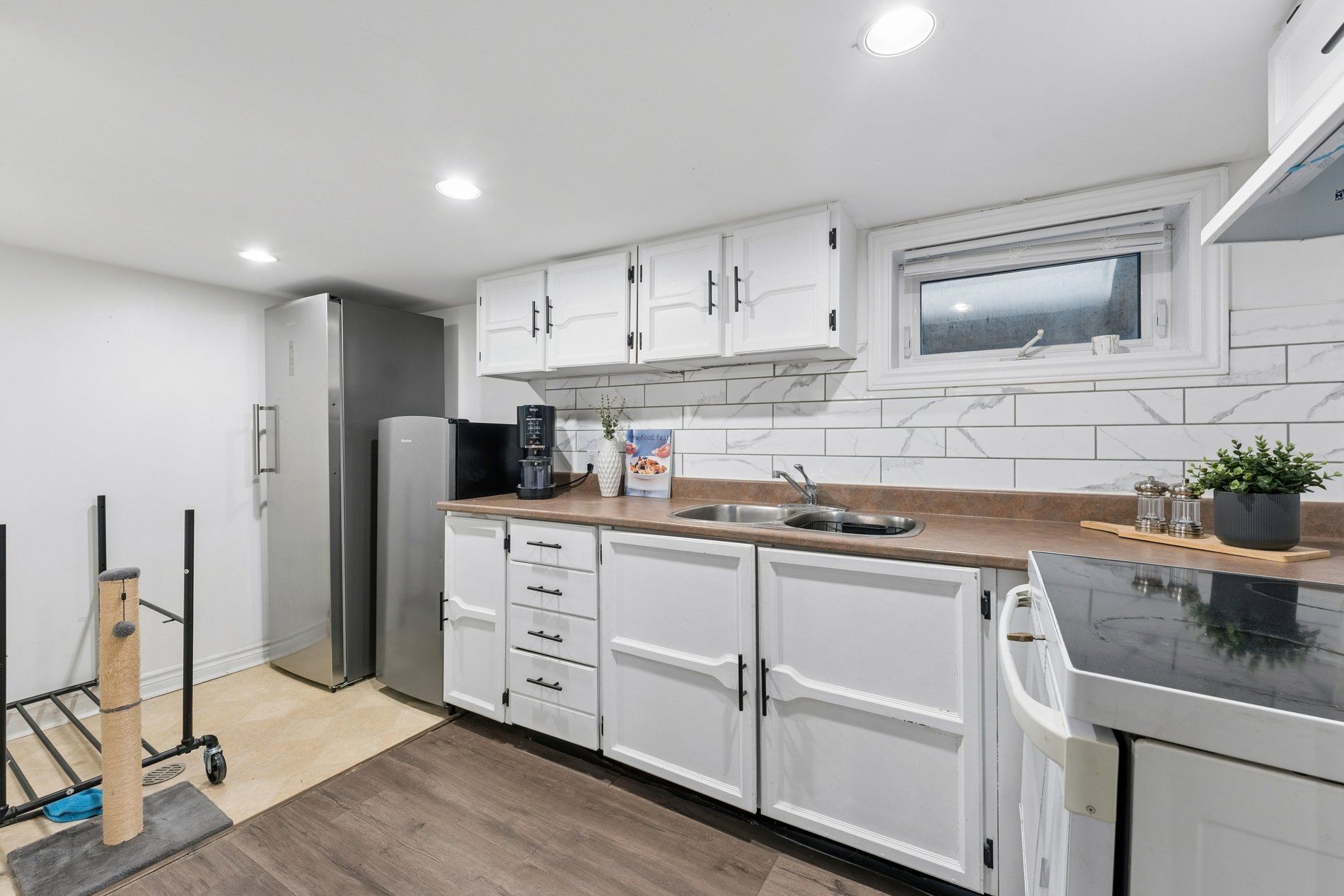Charming and beautifully updated 2-storey 3+1 bedroom family home offering exceptional space and income potential. Featuring a separate entrance to a finished basement with its own kitchen and 4-piece bathroom - ideal for an in-law or nanny suite and ready to make legal for future rental potential. The main level offers bright open-concept living and dining with large windows and hardwood flooring, along with a modern kitchen featuring stainless steel appliances, custom cabinetry, quartz counters, backsplash and breakfast bar. The dining area provides convenient walk-out access to the private backyard, making it perfect for indoor-outdoor entertaining. Upstairs offers three generously sized bedrooms, updated laminate flooring, convenient upper-level laundry with stacked washer & dryer, and a bright 4-piece bathroom with window and plenty of natural light. Bedrooms also include custom wardrobe closets and additional storage space available in the attic with staircase access. Enjoy a private, fully fenced and landscaped backyard designed for entertaining with a spacious built-in deck, custom wood seating, privacy screening, outdoor tv area, fire pit and tranquil garden pond water feature. The property also includes an 8 x 16 backyard shed for additional storage. Located close to schools, parks, shopping, go transit and the new recreation trail (2023), this home offers the perfect combination of comfort, flexibility and convenience.
