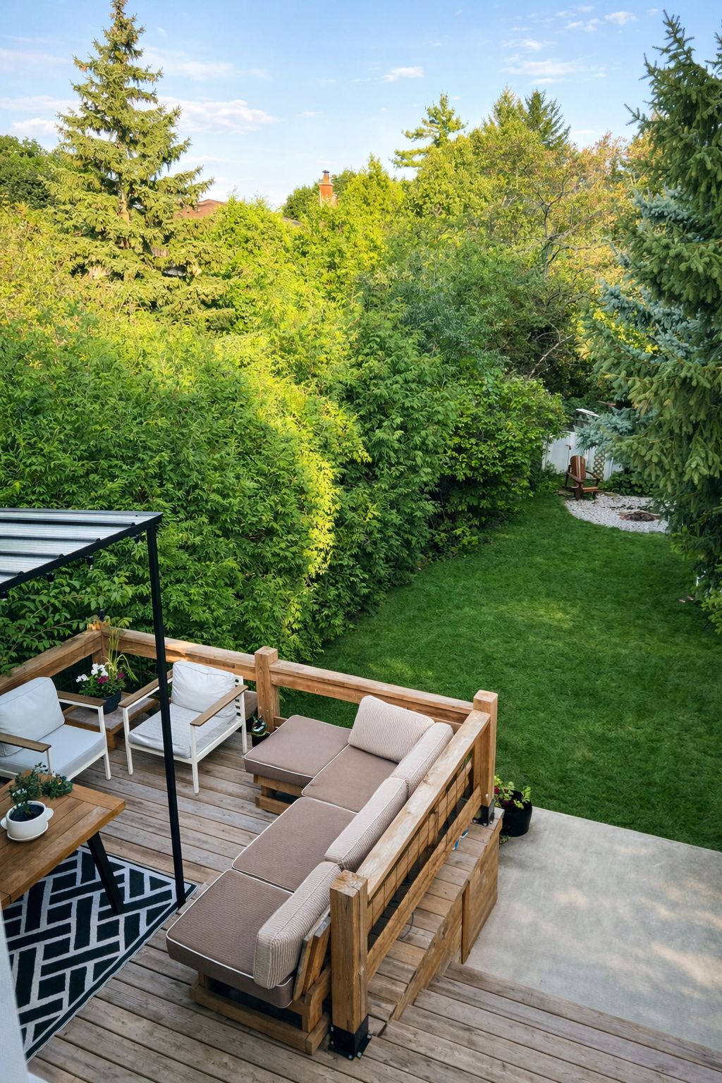 • Private, landscaped backyard with deck, fire pit, and garden pond.