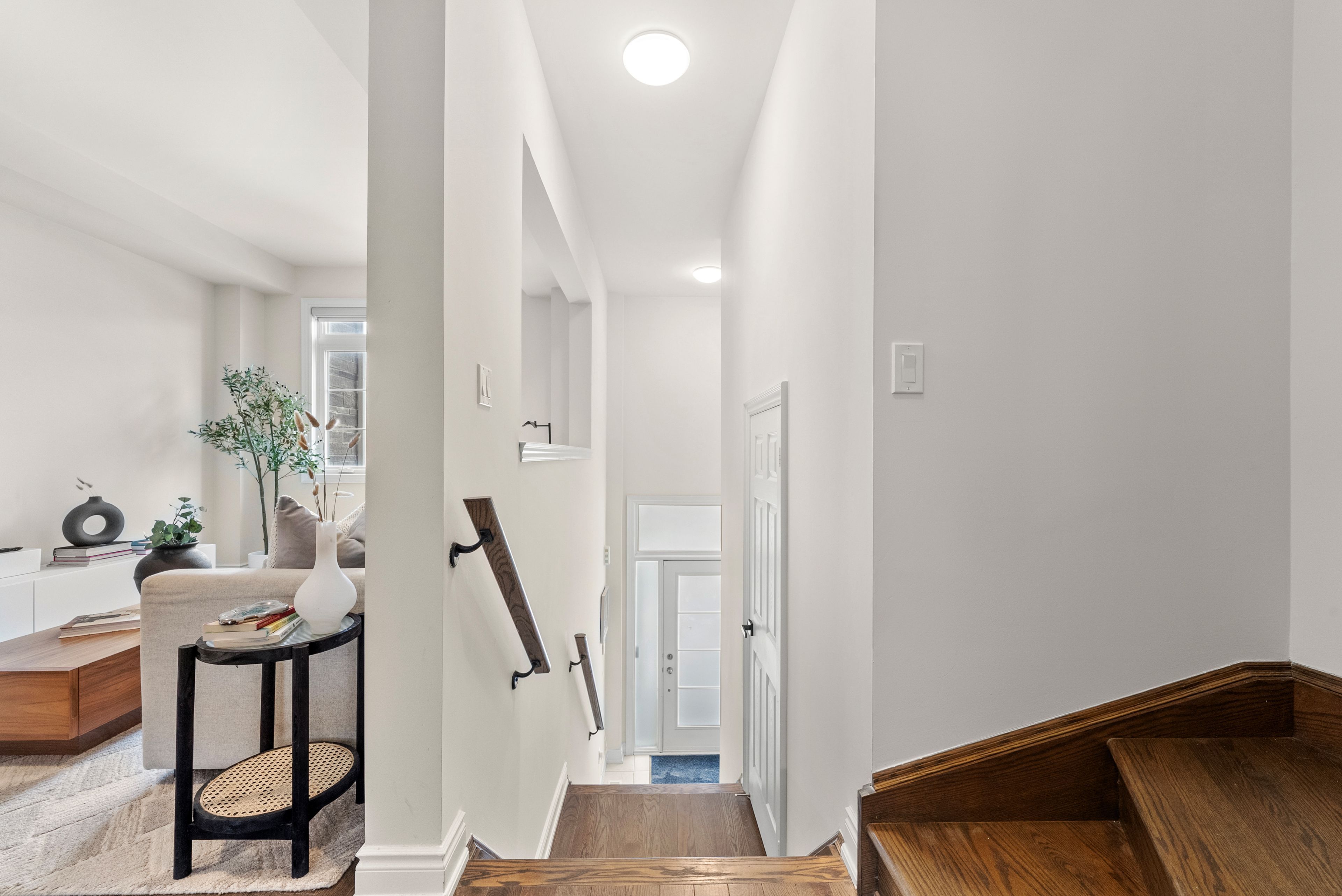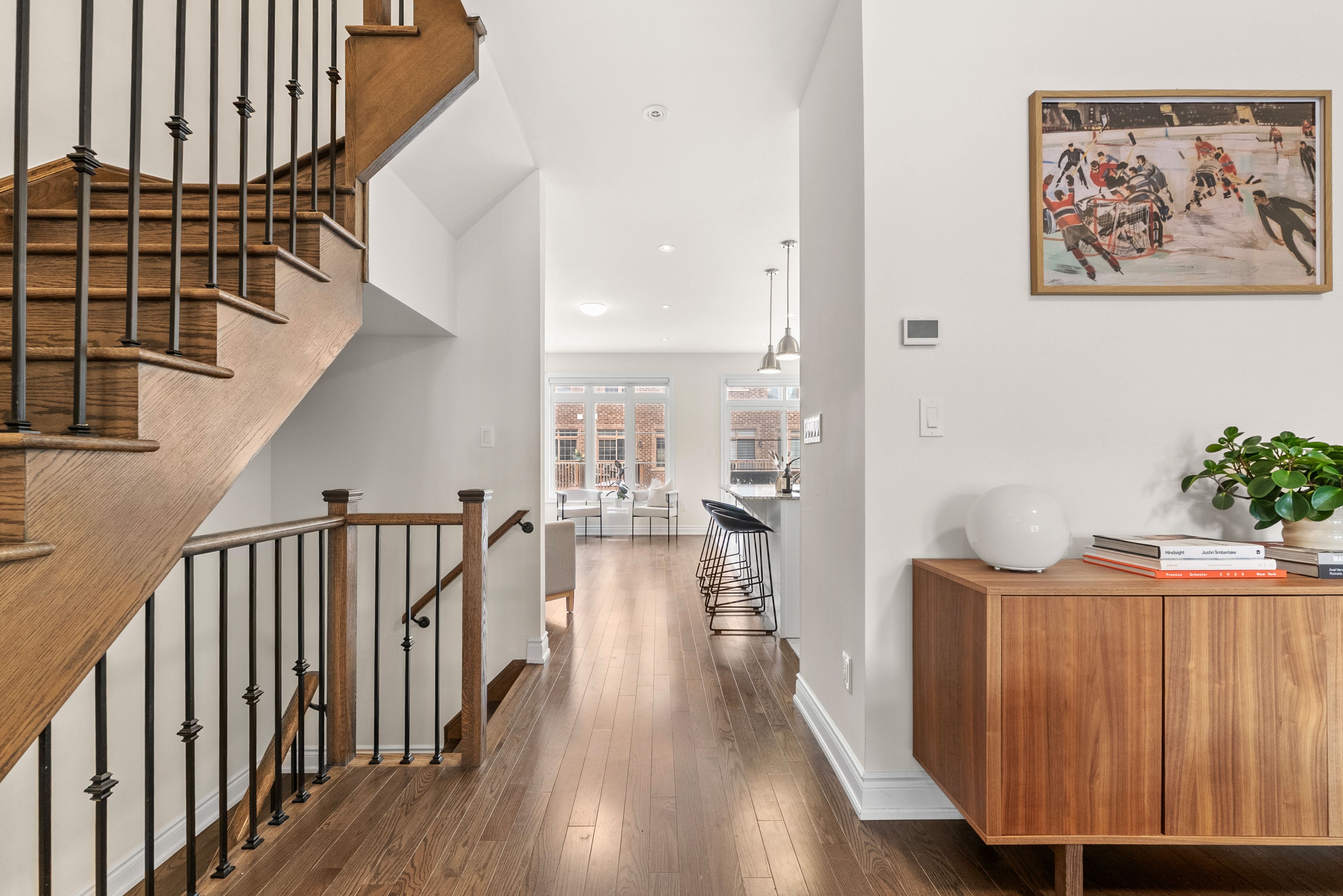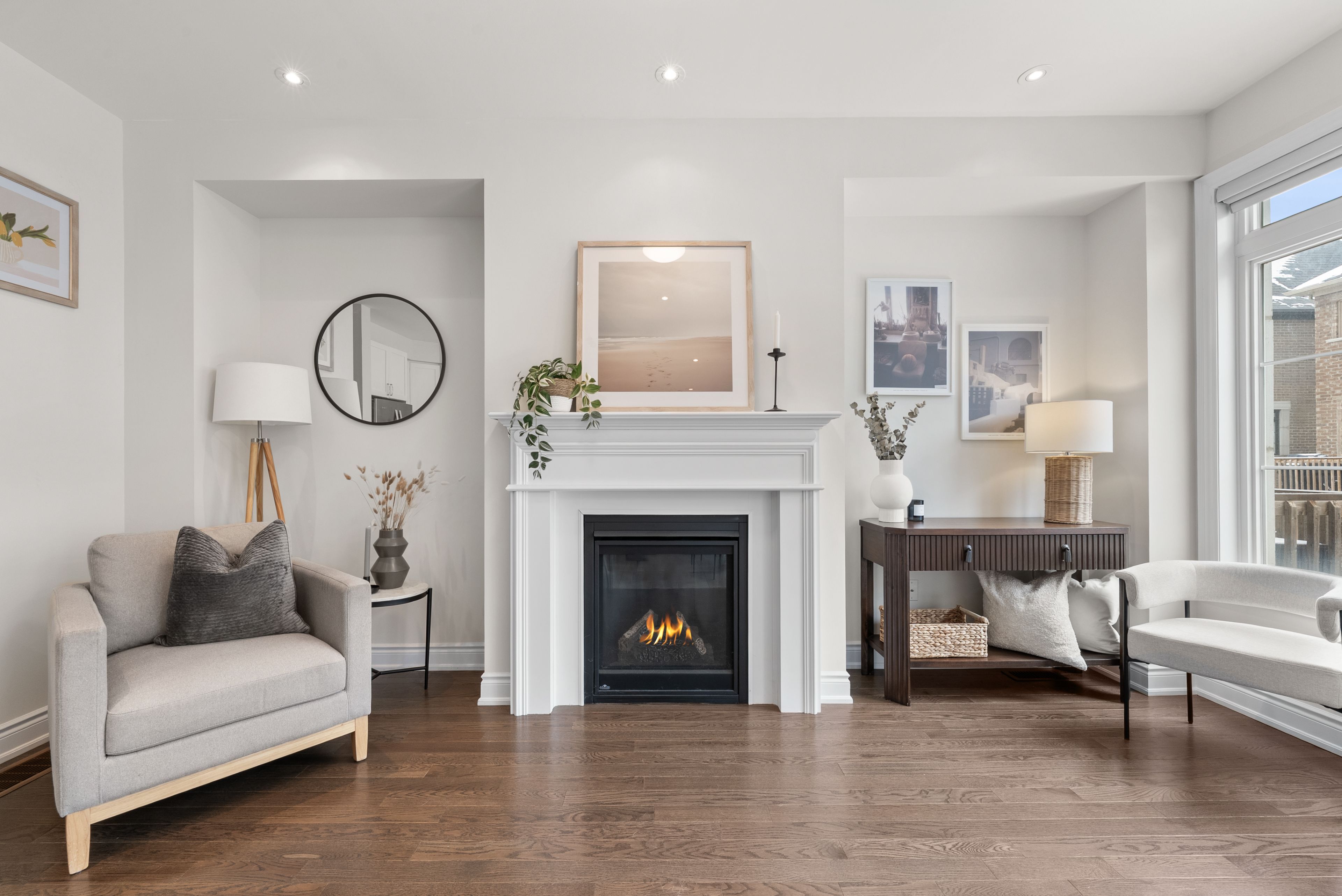 • Bright open-concept main level with a stylish living area and cozy gas fireplace.