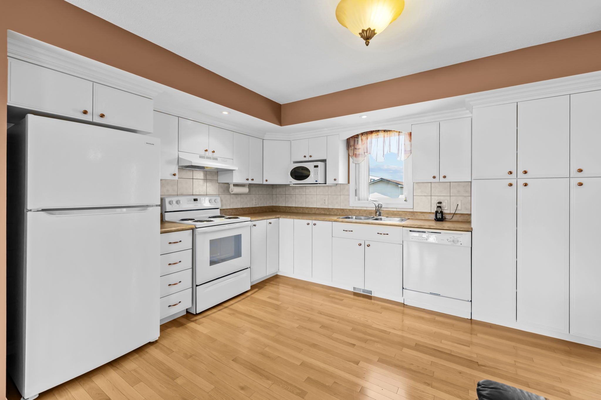 • Spacious kitchen with ample cabinet space and a dining area leading to a deck.
