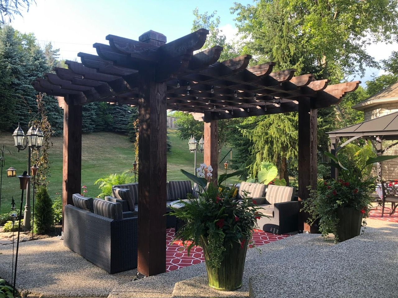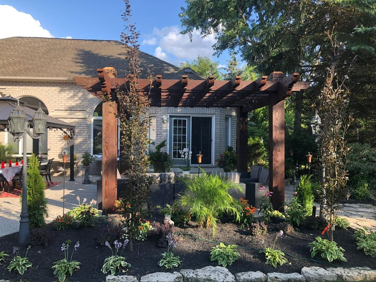 • Private backyard oasis with a covered pergola and expansive patio.