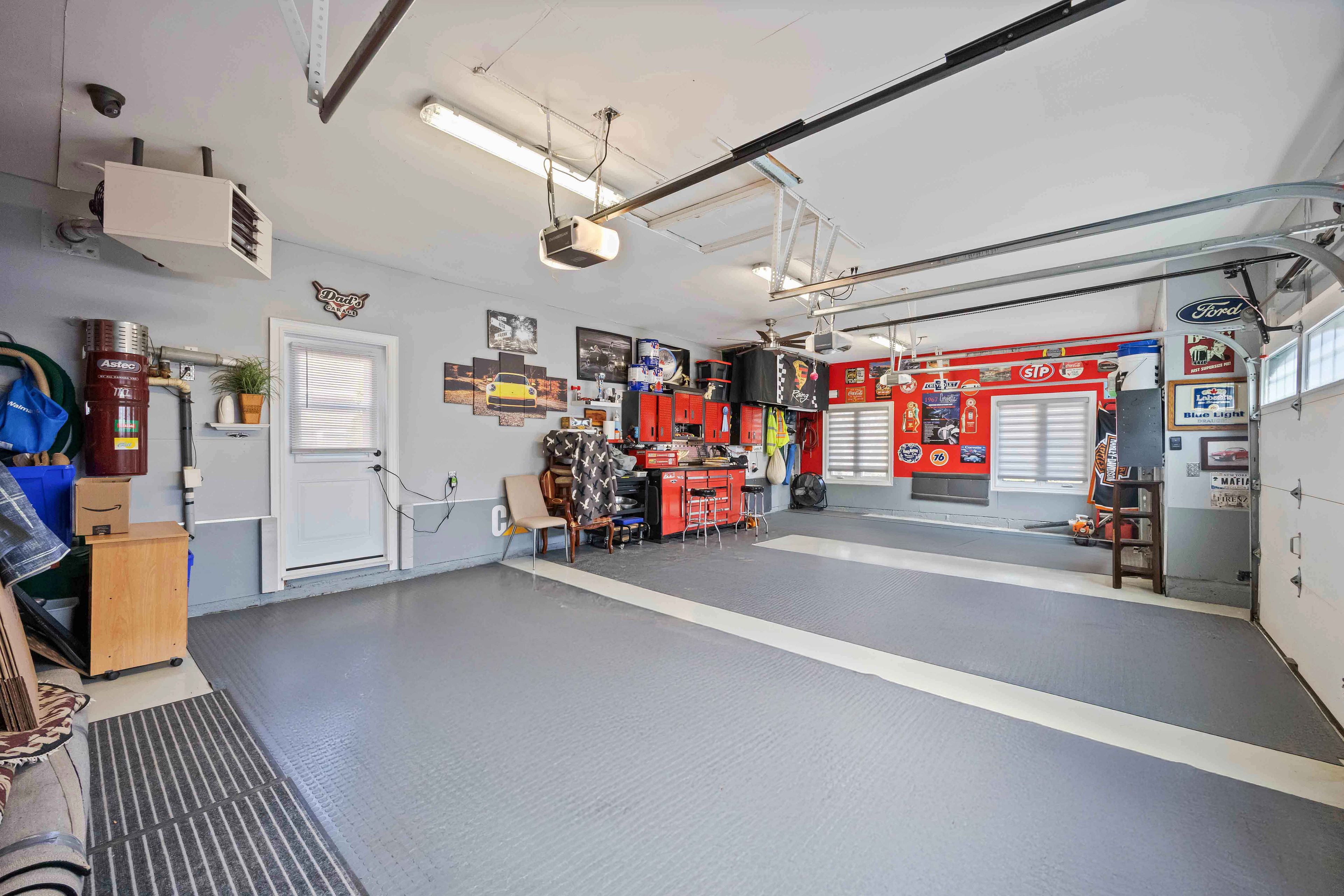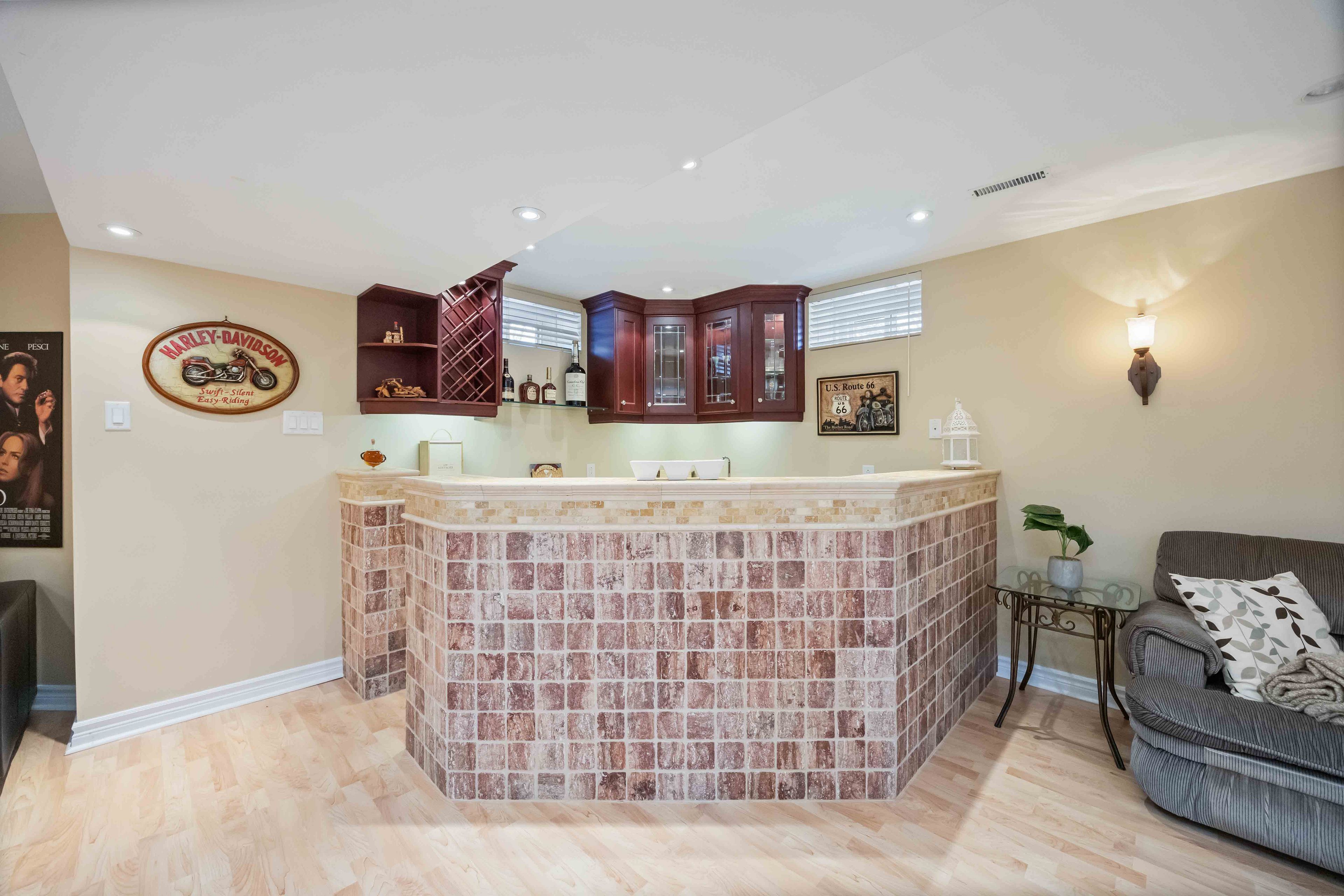 • Fully finished basement with kitchen, recreation room, and built-in bar.