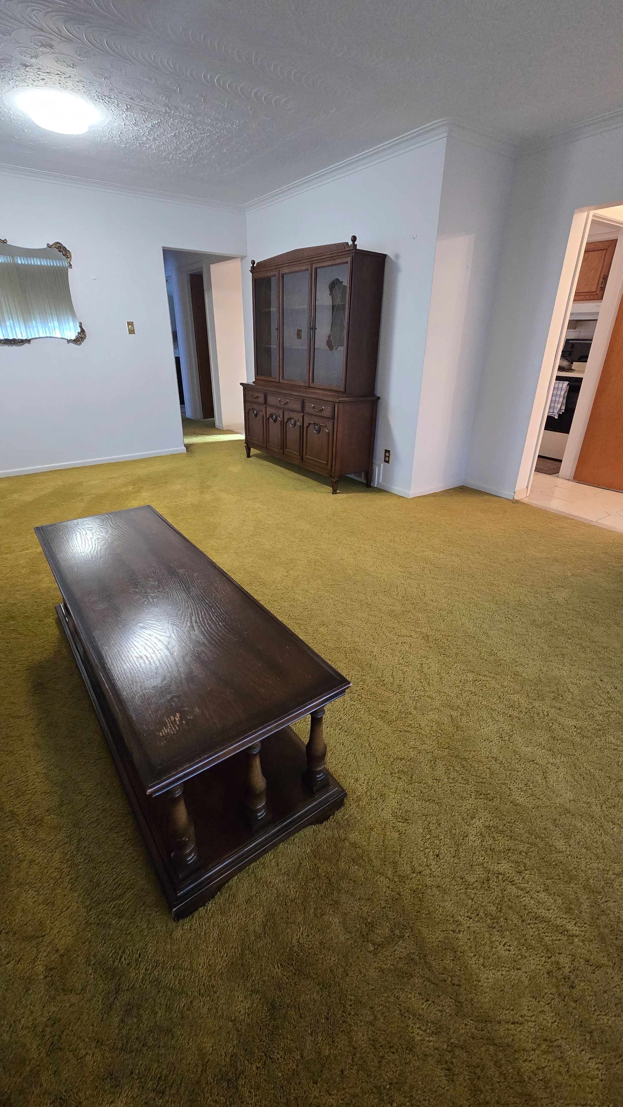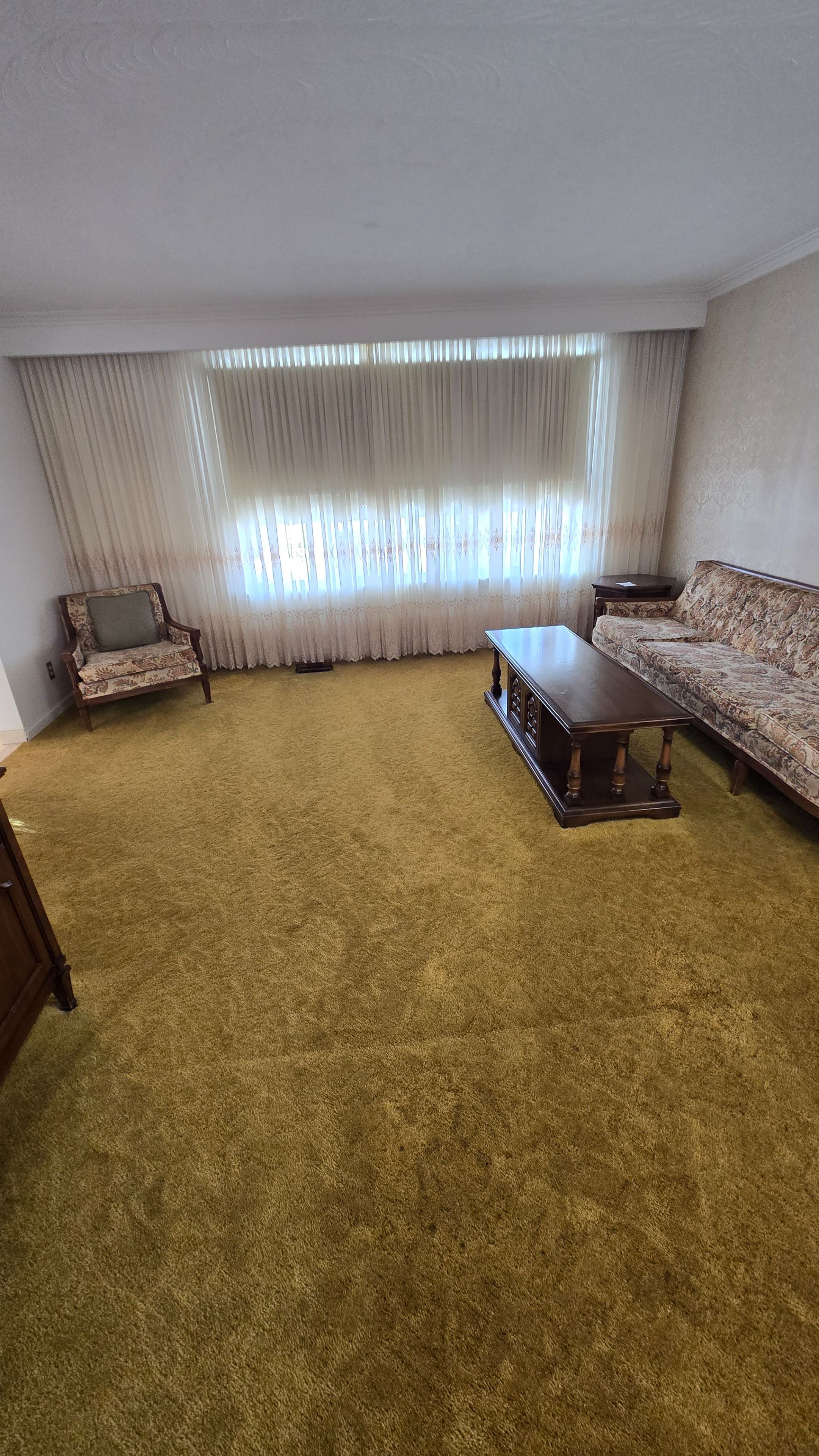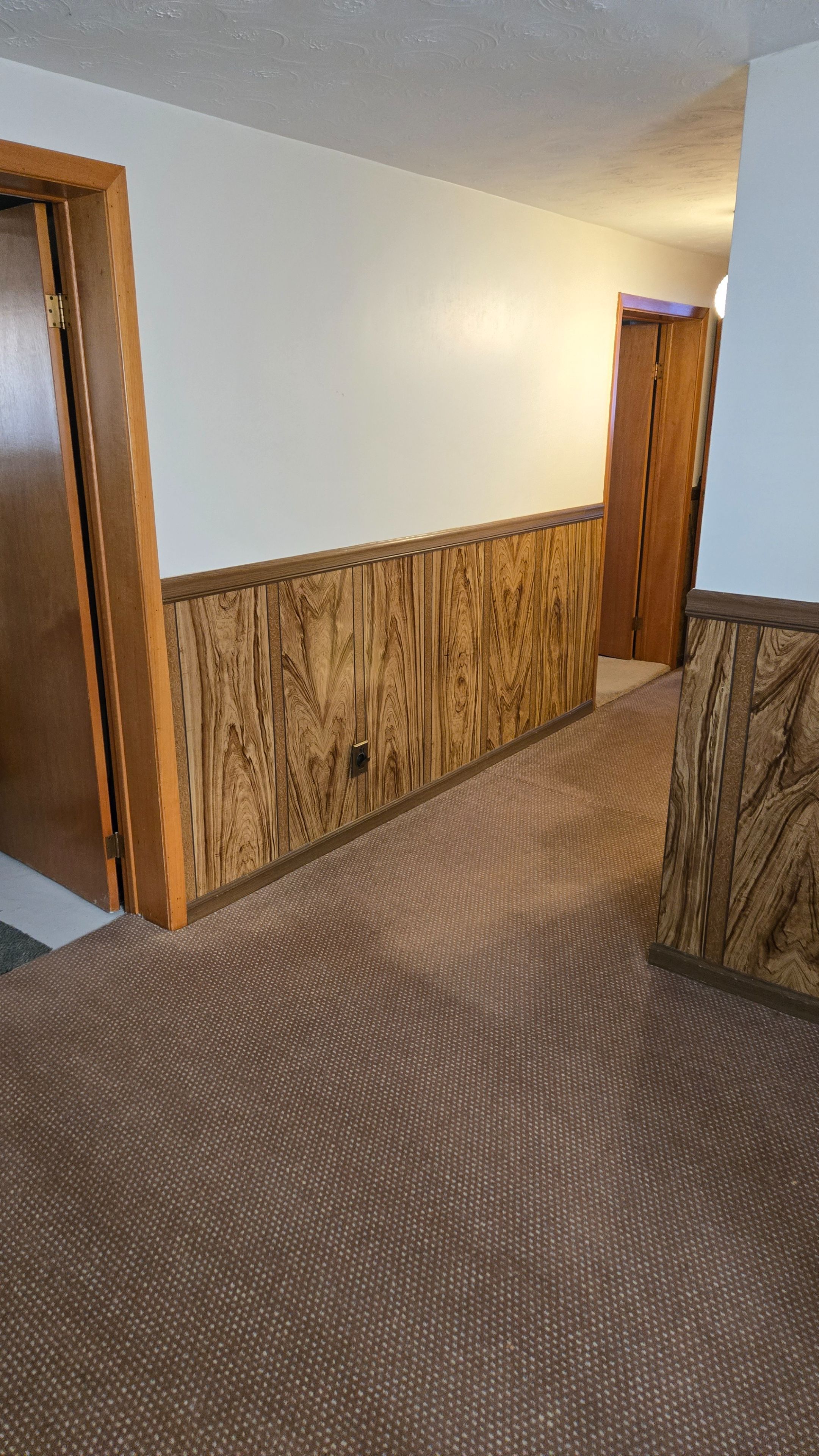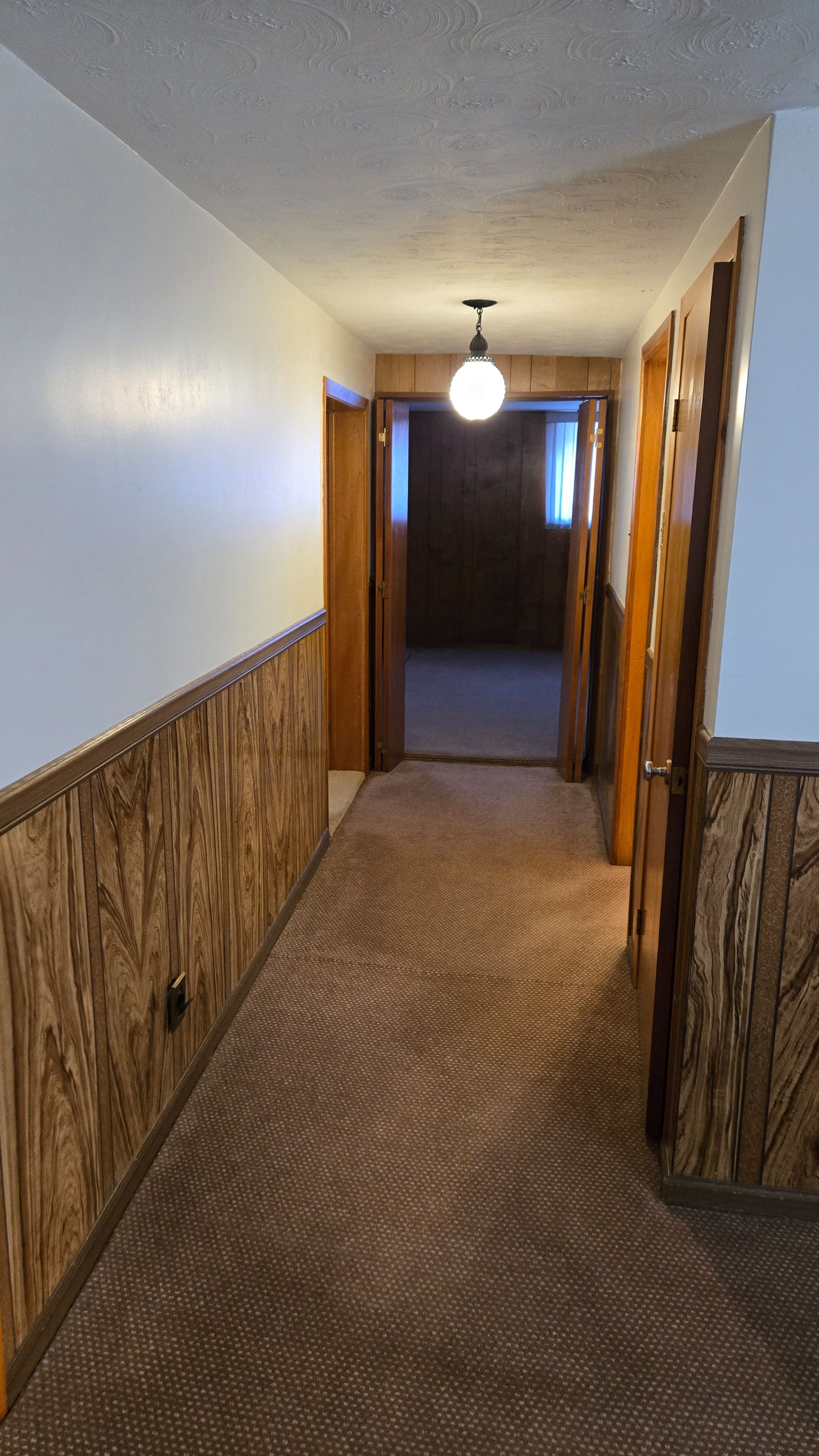 • Main floor features three bedrooms and hardwood flooring underneath carpet.