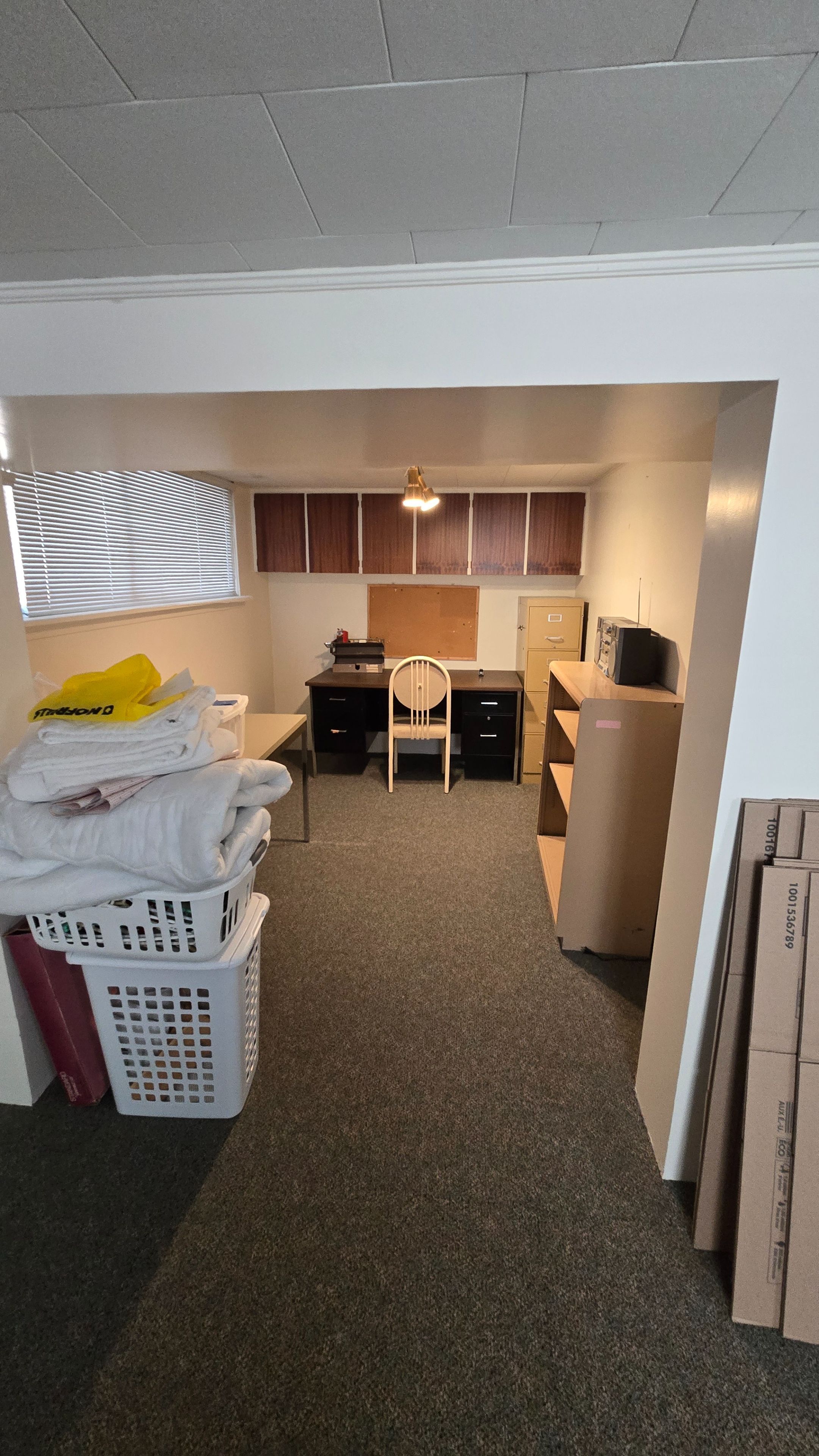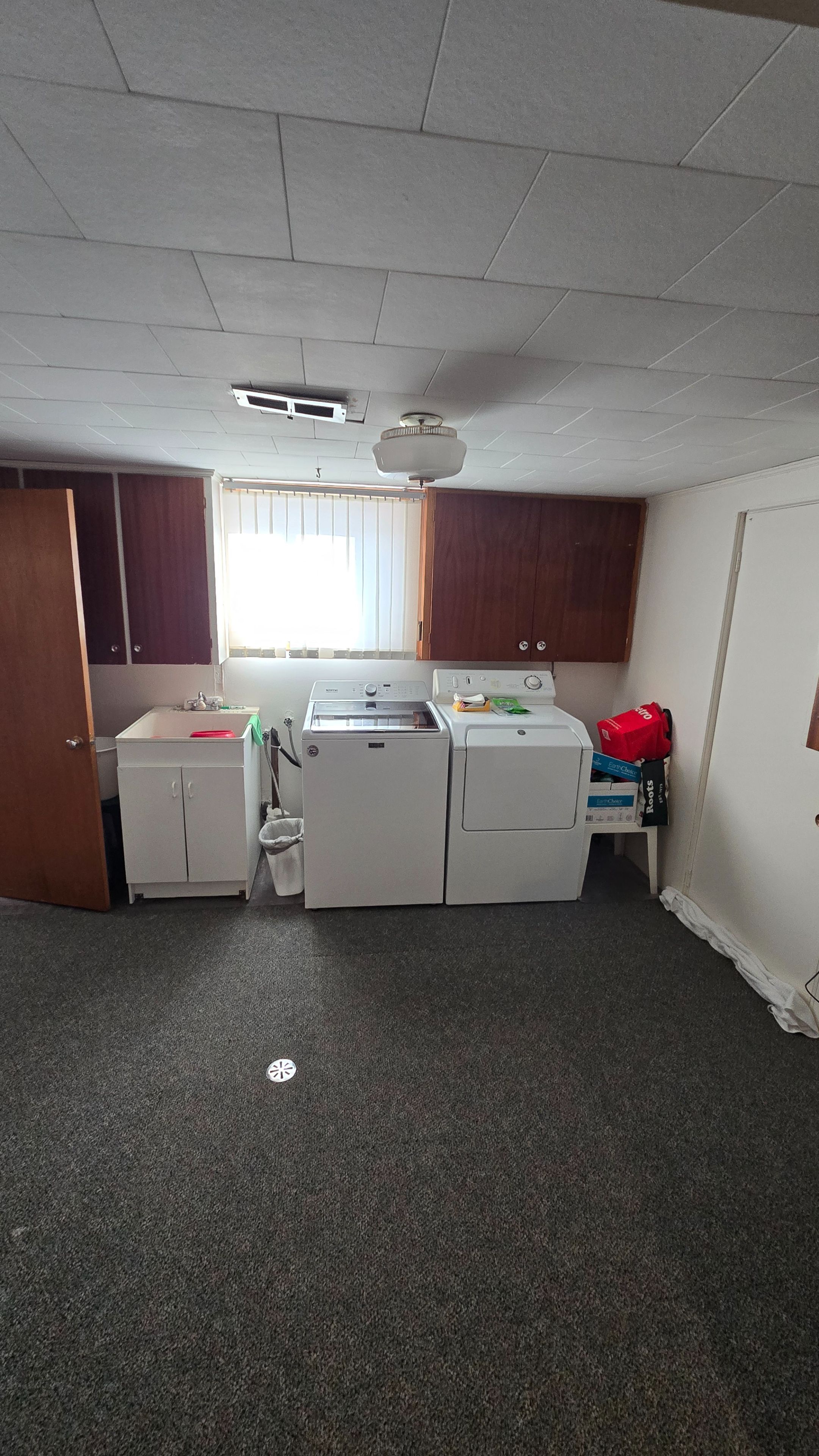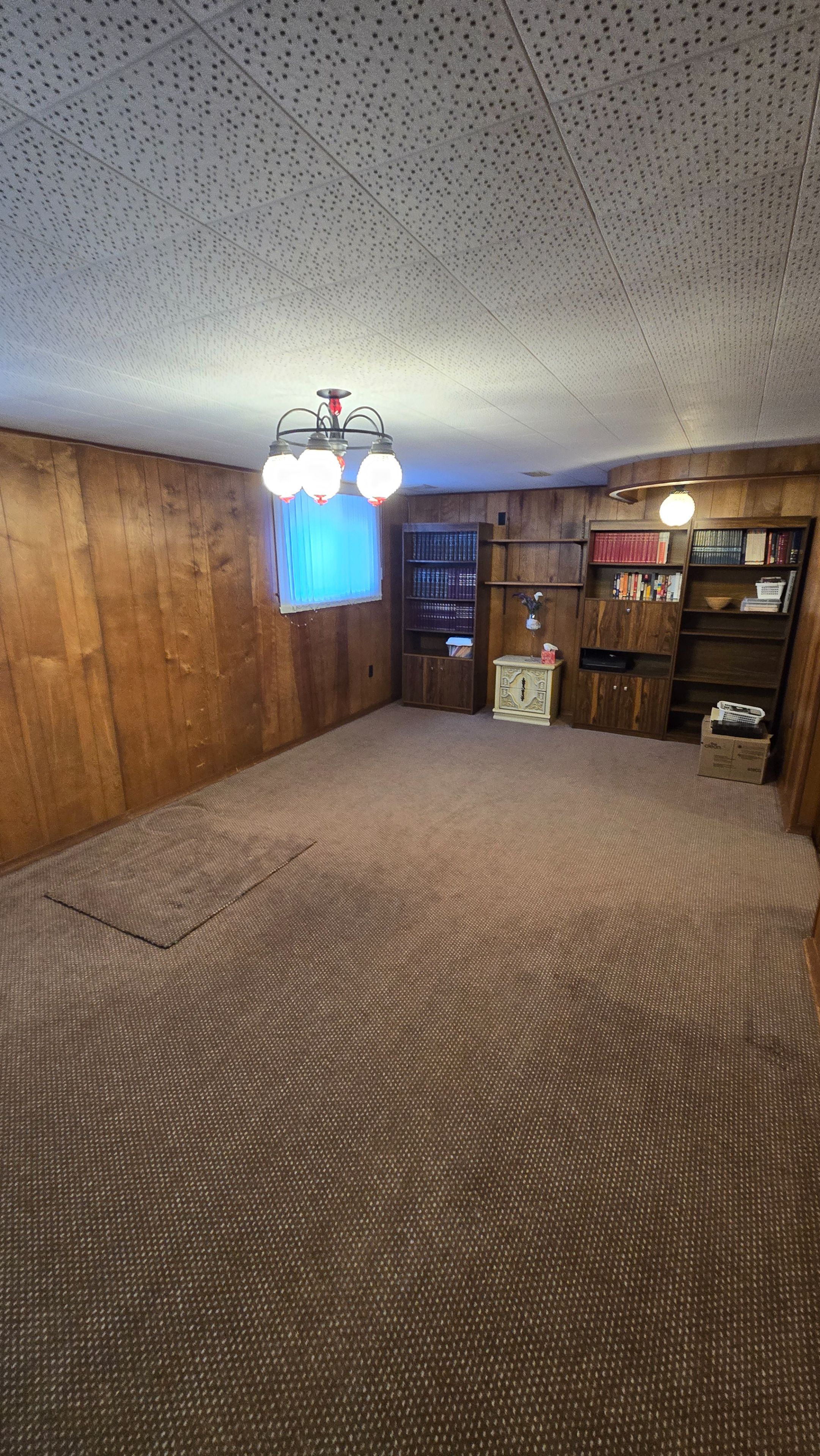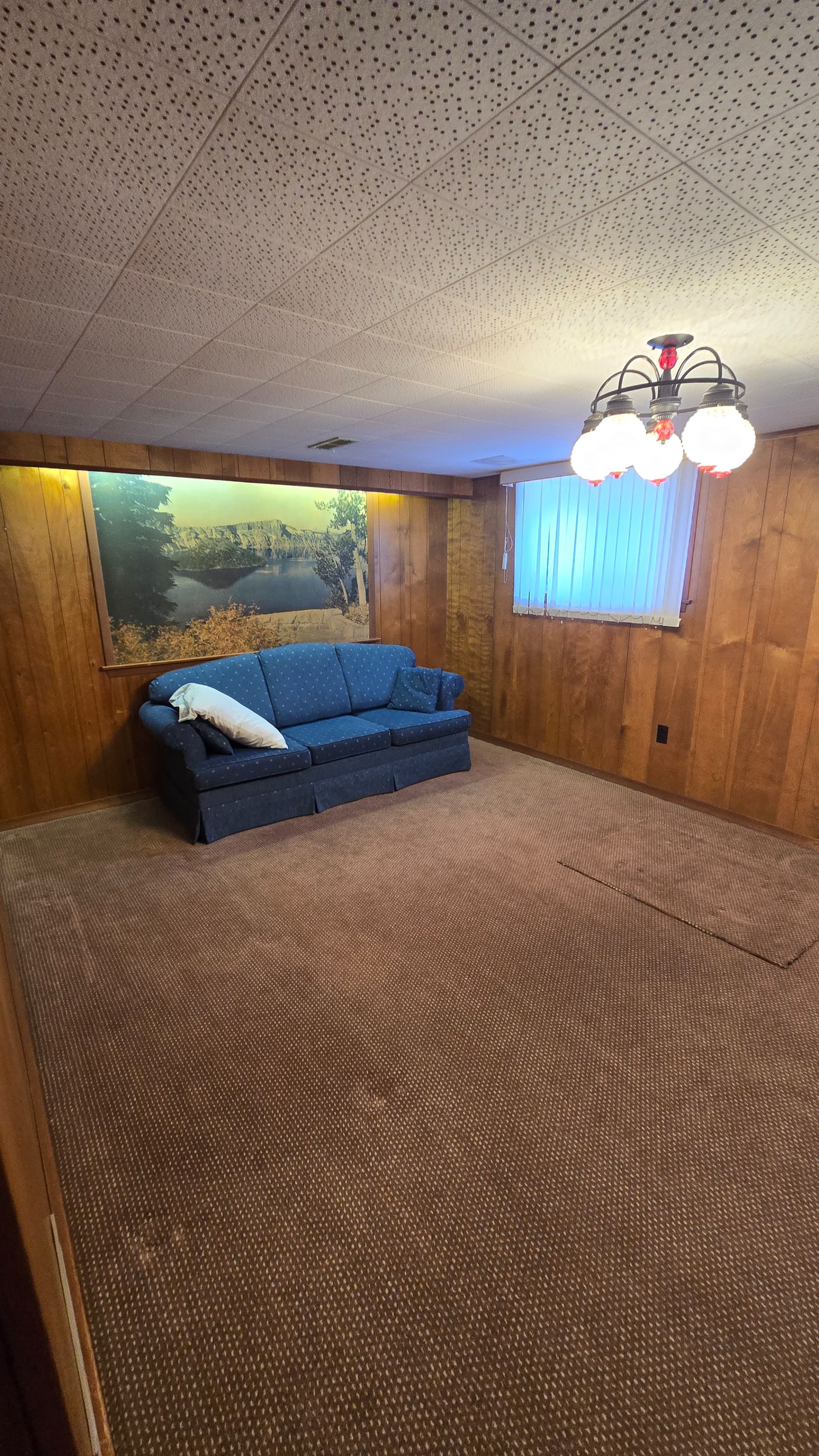 • Main floor features three bedrooms and hardwood flooring underneath carpet.