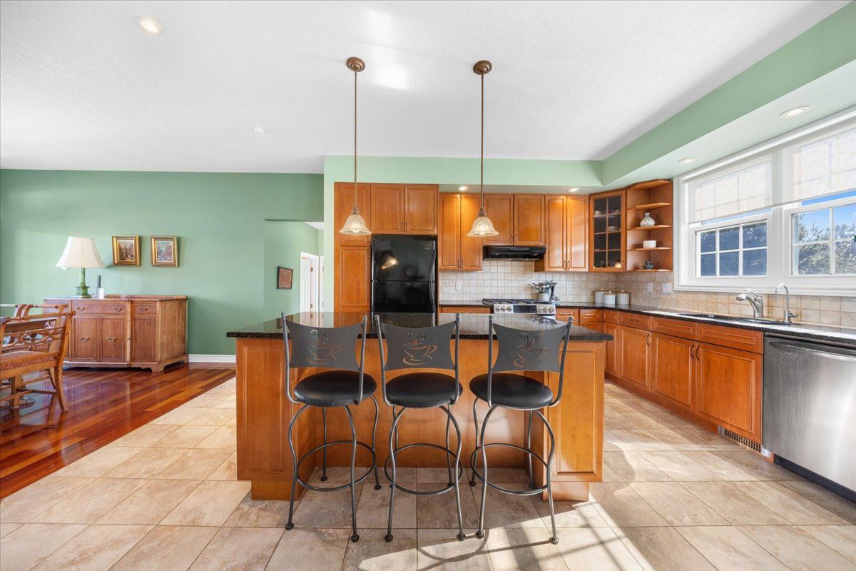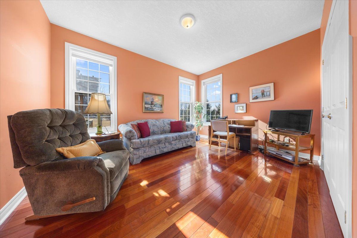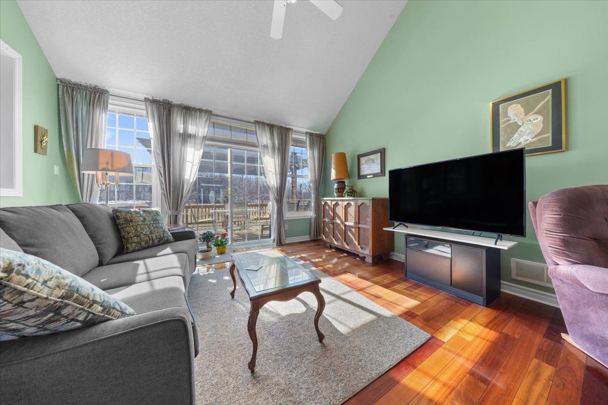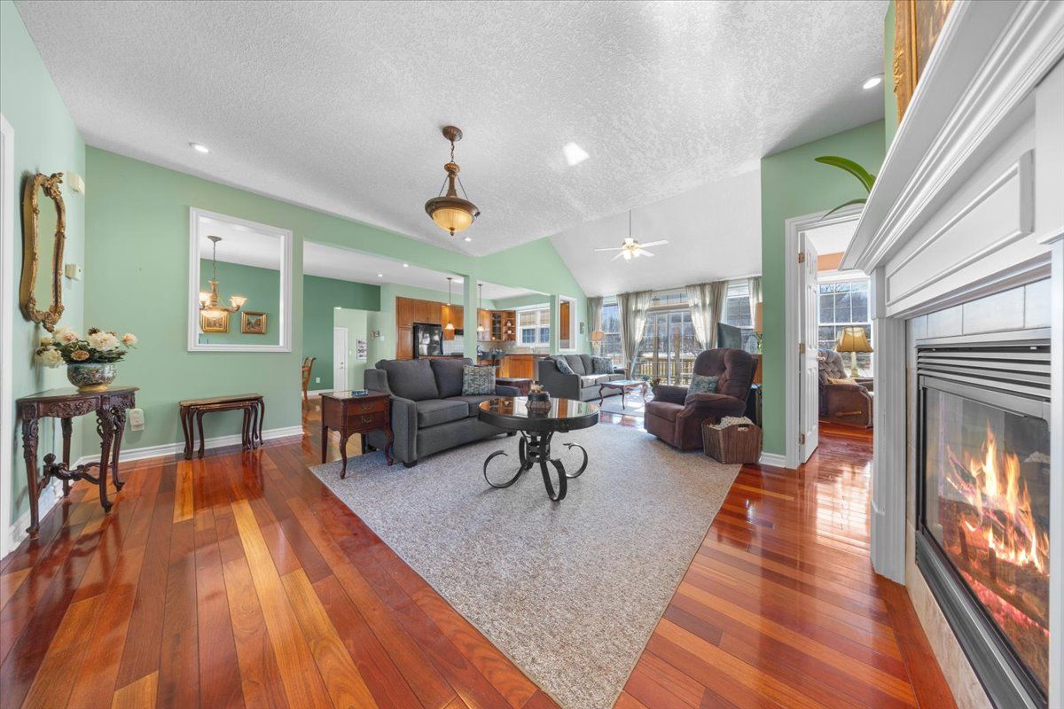 • Family room boasts vaulted ceilings and large windows for natural light.