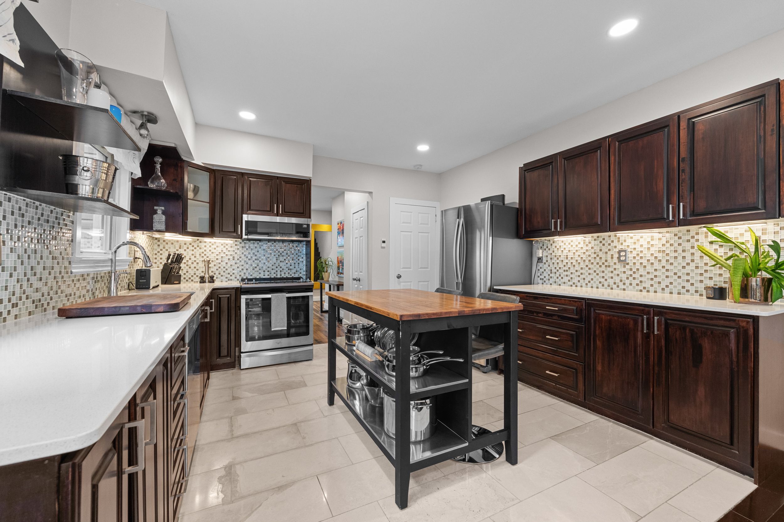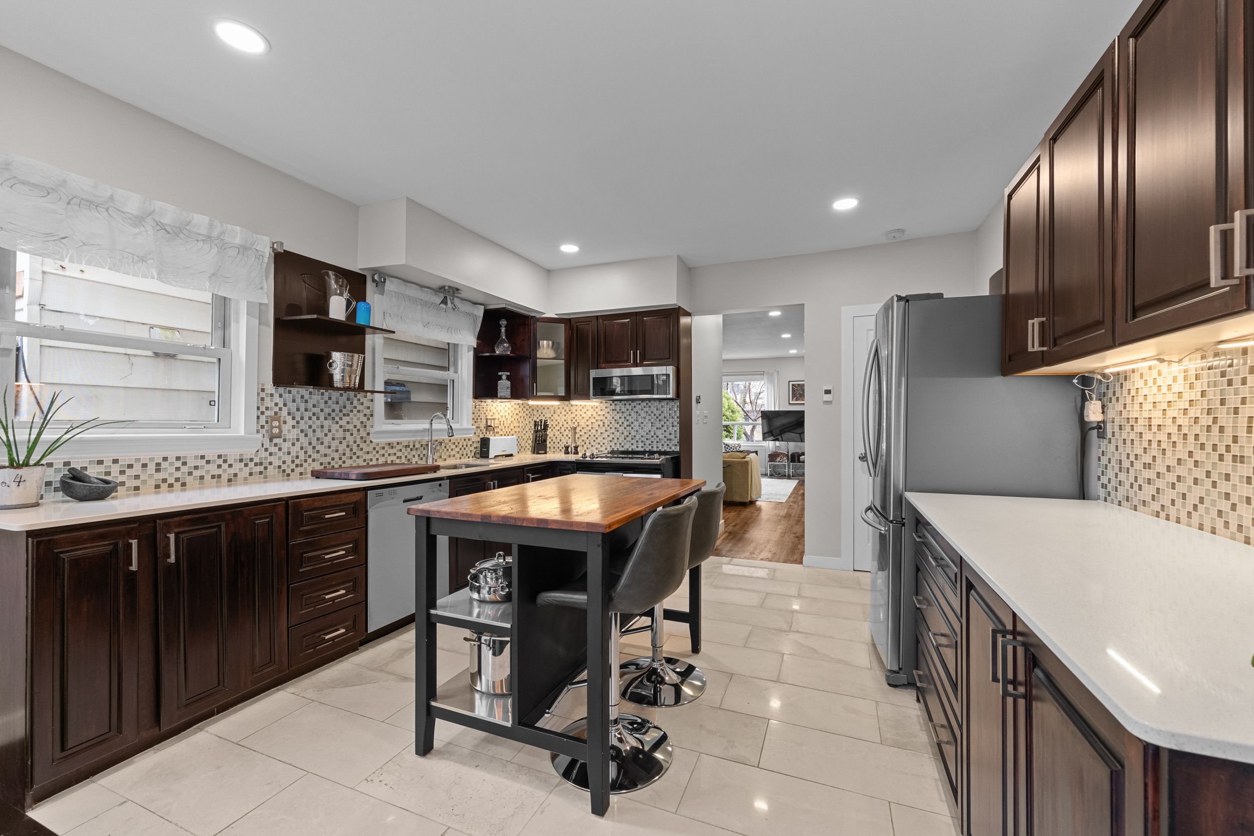 • Family-sized kitchen with quartz countertops and abundant storage.