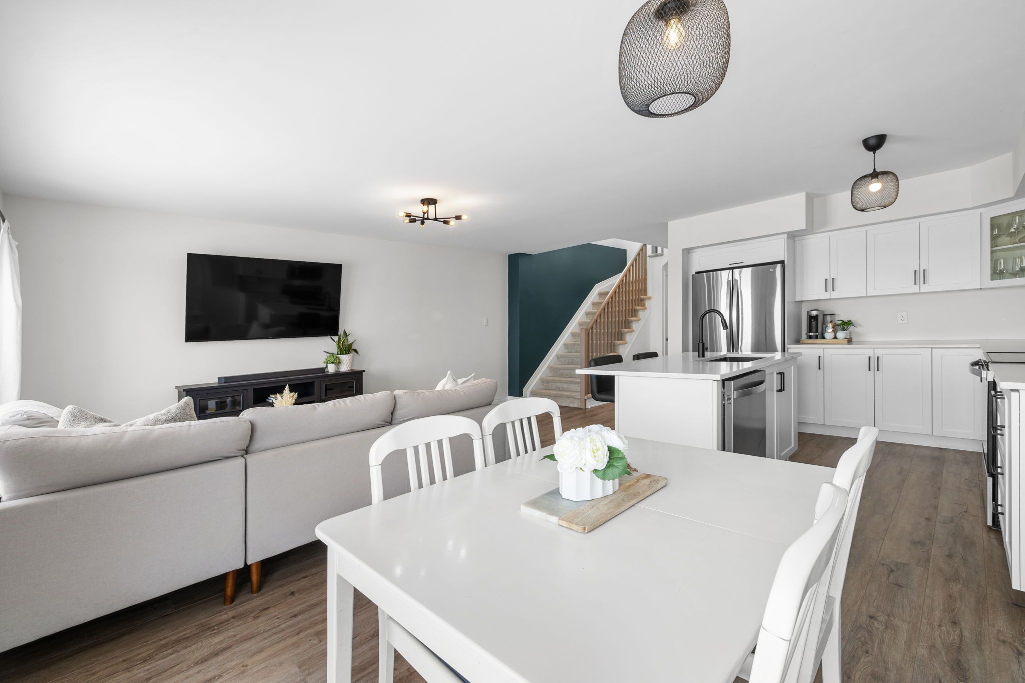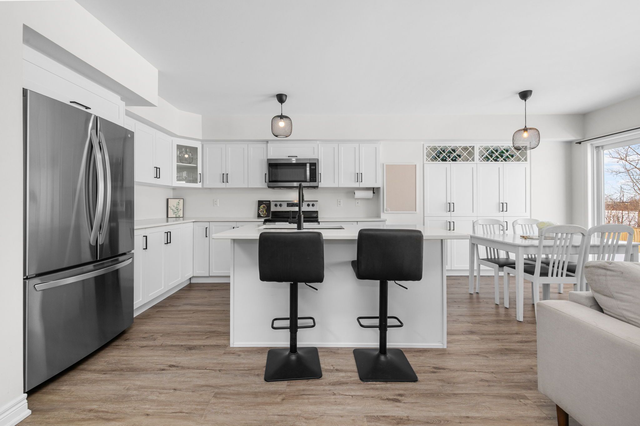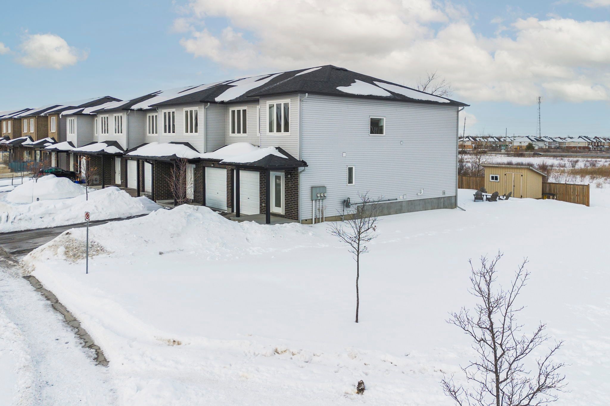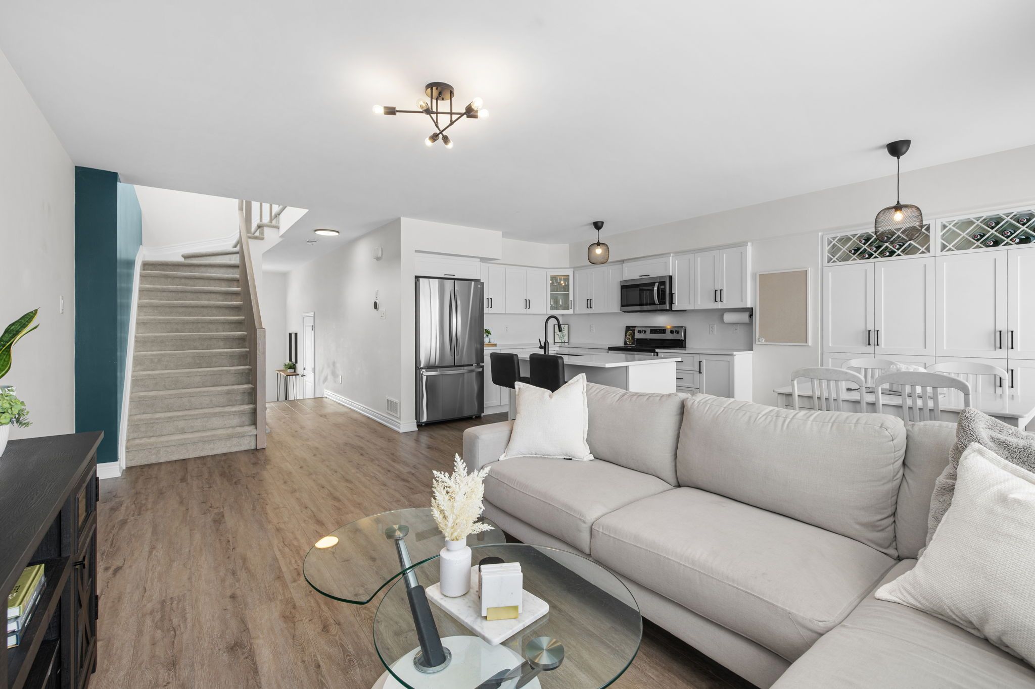 Welcome to this beautifully maintained 2022-built end-unit townhome offering exceptional privacy with no rear neighbours and no direct side neighbour. With 3 bedrooms, 2. 5 bathrooms, and a finished basement, this home blends modern style with everyday functionality. The thoughtfully designed main level features an open-concept layout ideal for both entertaining and family living. The classic white kitchen is complemented by quartz countertops, black hardware, a spacious island with breakfast bar, and custom built-in pantry cabinetry for added storage and organization. Luxury vinyl flooring runs throughout the main level and continues into the finished basement for a cohesive and contemporary feel. Upstairs, the primary suite offers a relaxing retreat complete with a beautifully designed ensuite featuring a double sink vanity and a custom built-in walk-in closet. Two additional bedrooms, a full main bathroom, and convenient second-floor laundry complete the upper level. The finished basement expands your living space with a comfortable family room and a newly added wet bar-perfect for hosting guests or creating the ultimate movie-night setup. Located within walking distance to shops and restaurants, this home offers the perfect balance of privacy, style, and convenience-simply move in and enjoy.