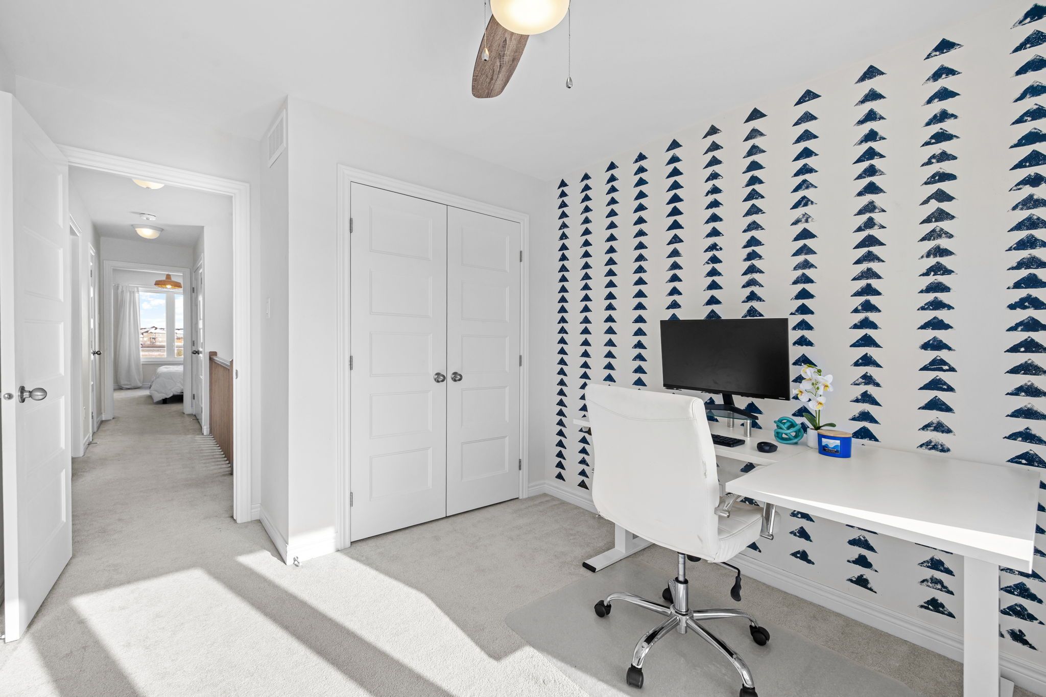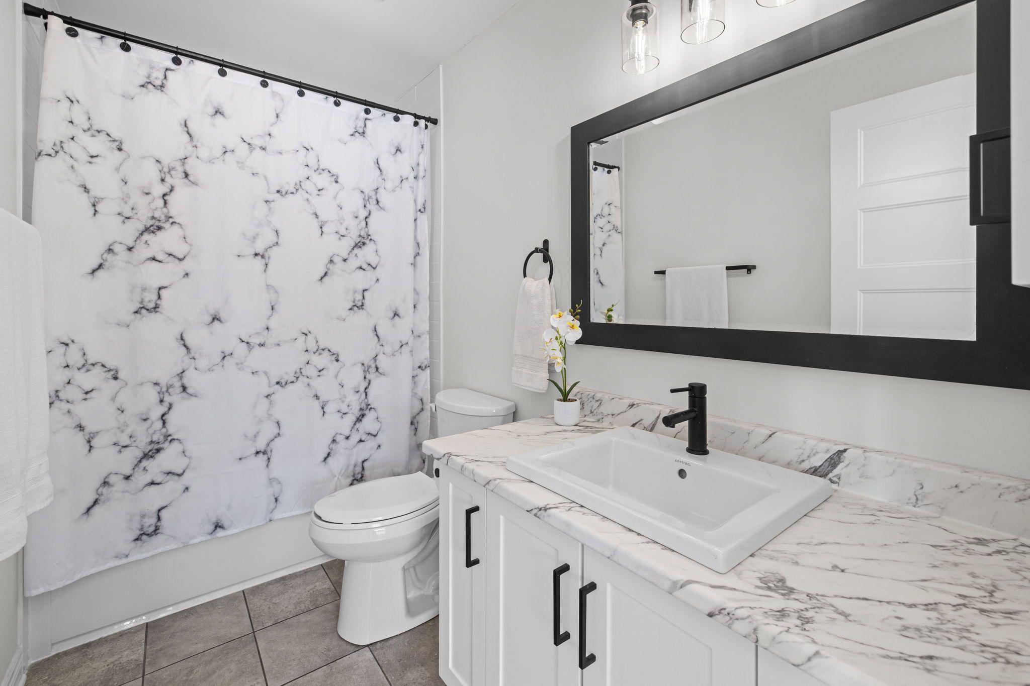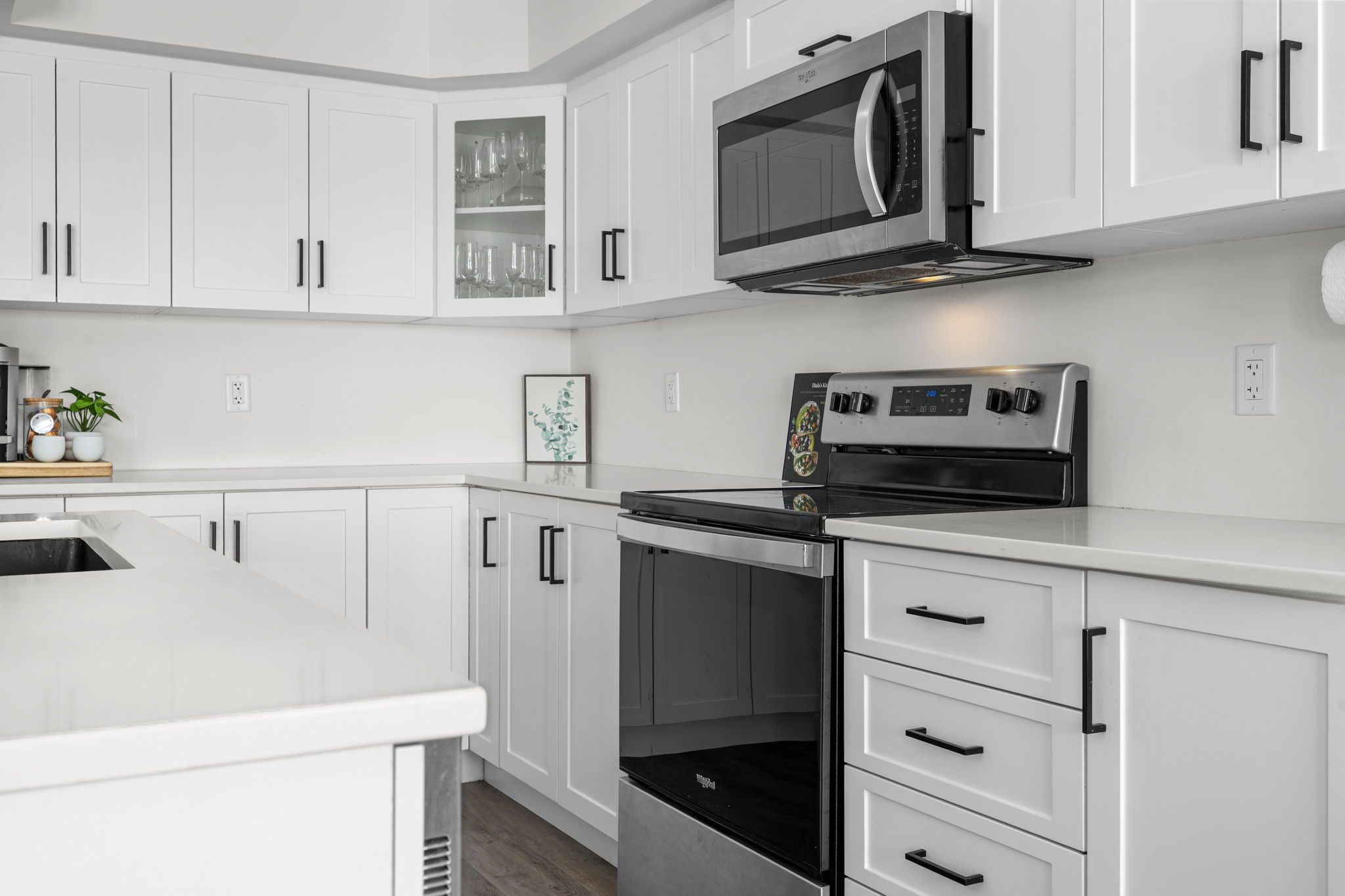 • Modern kitchen features quartz countertops and spacious island for casual dining.
