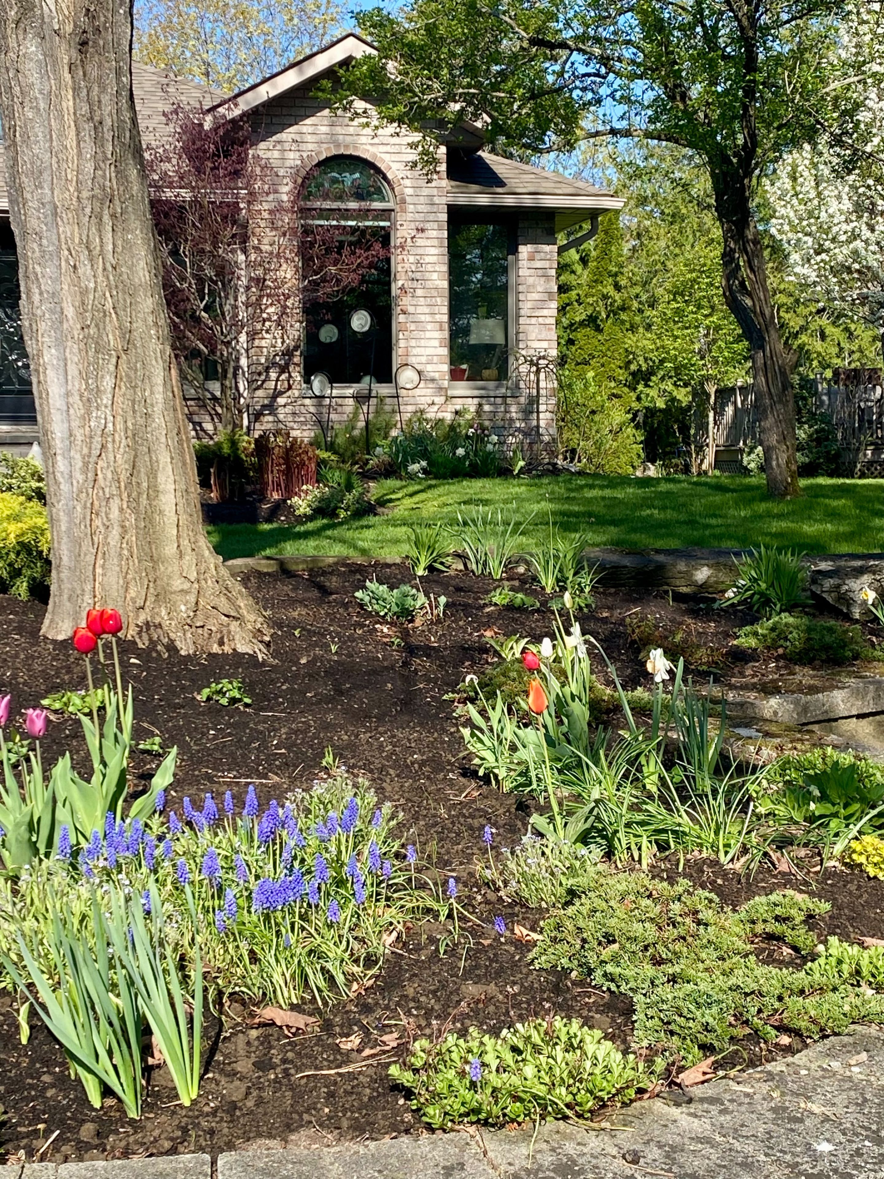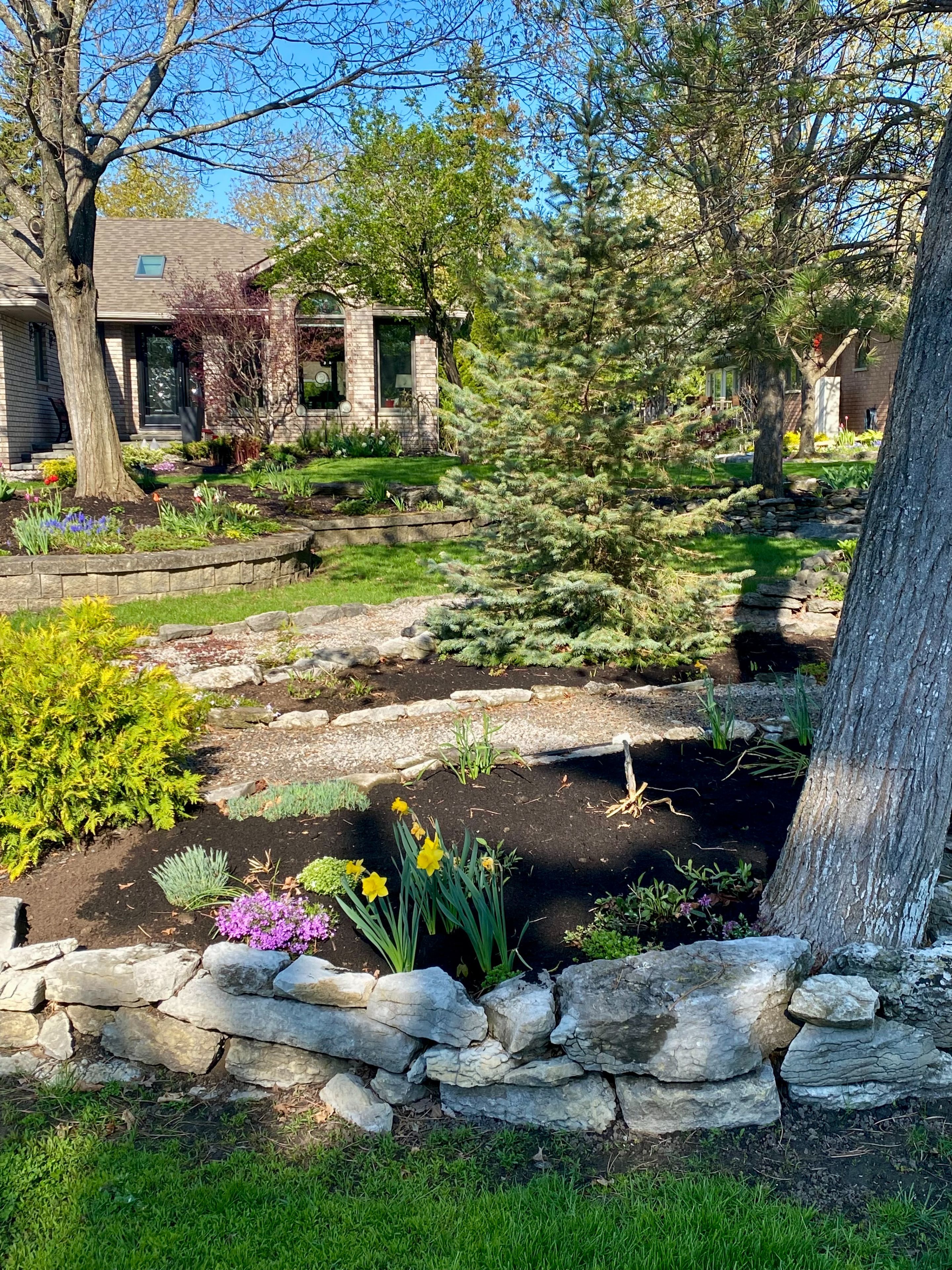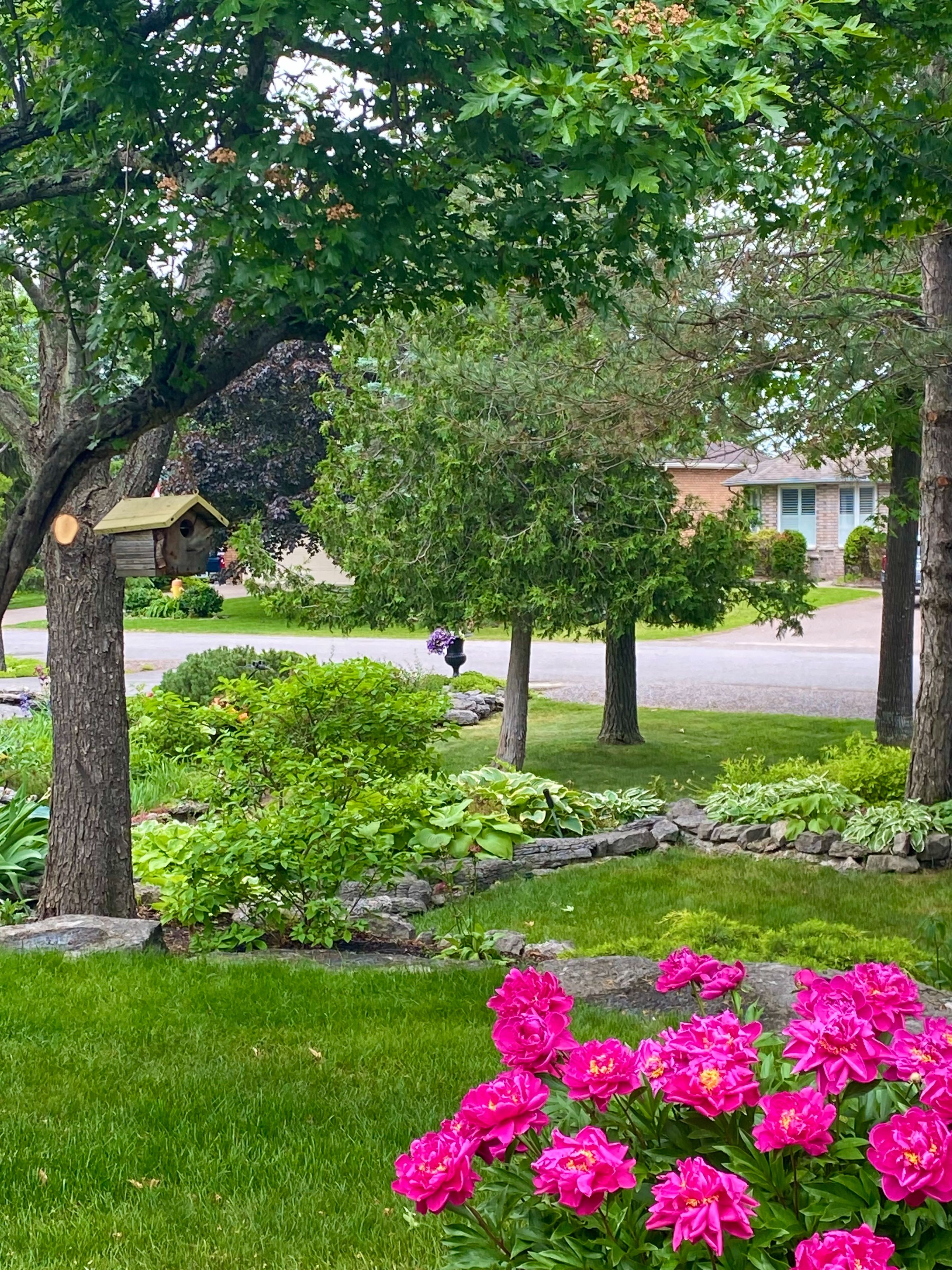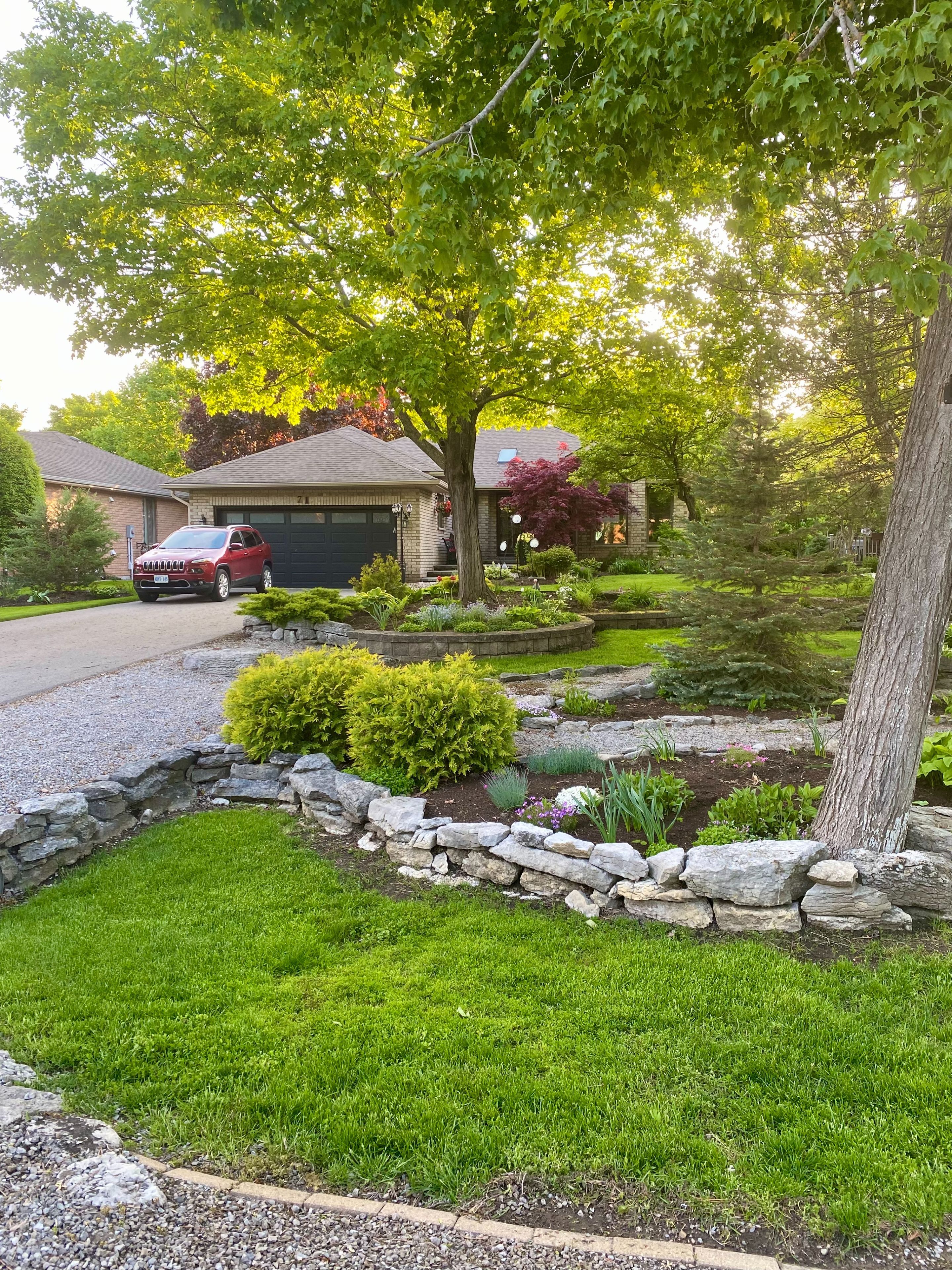 • Private backyard retreat with mature cedars and access to walking trails.
