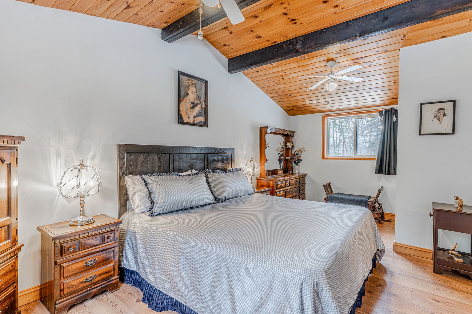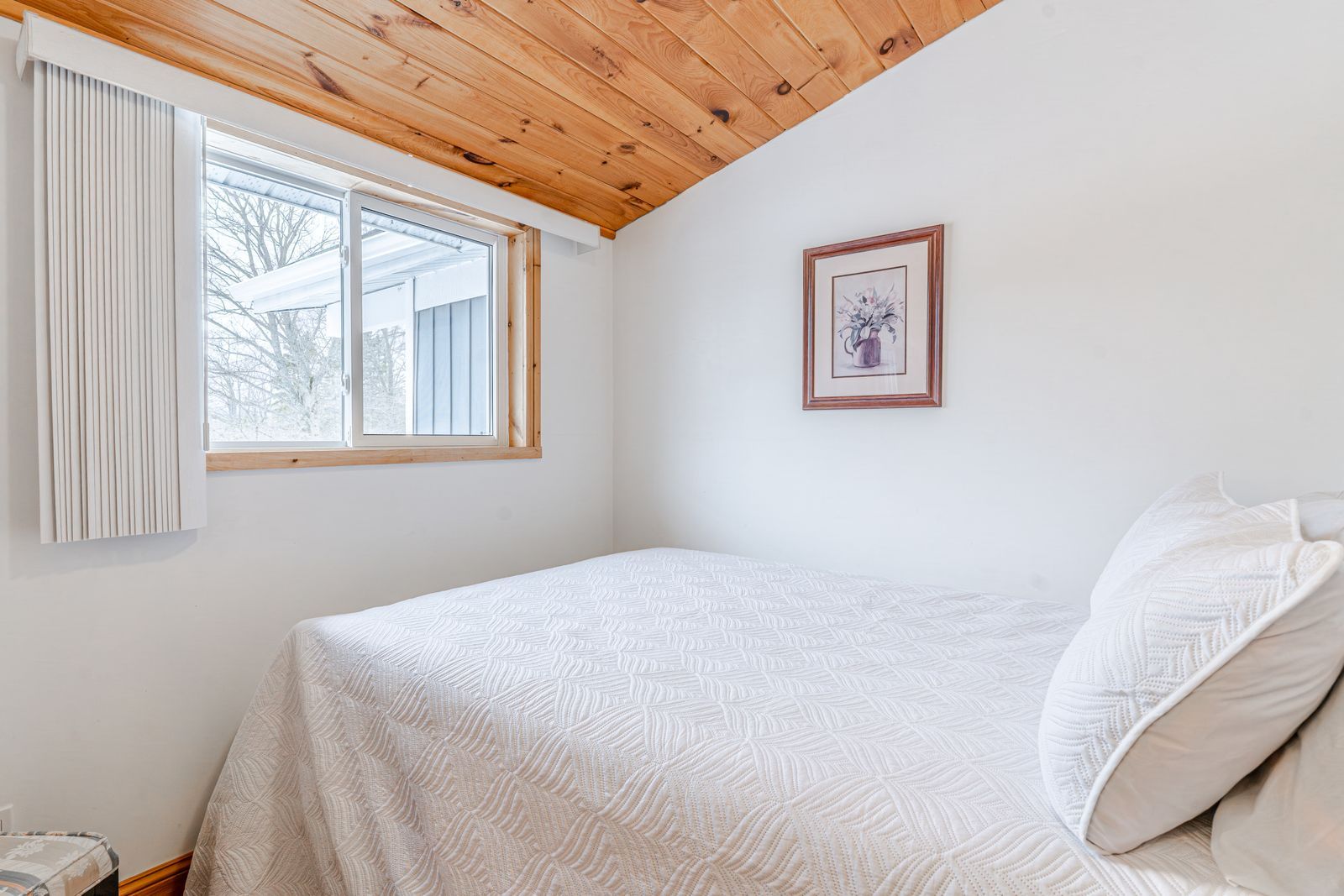• Spacious interior with modern updates, including a vaulted wood plank ceiling.
