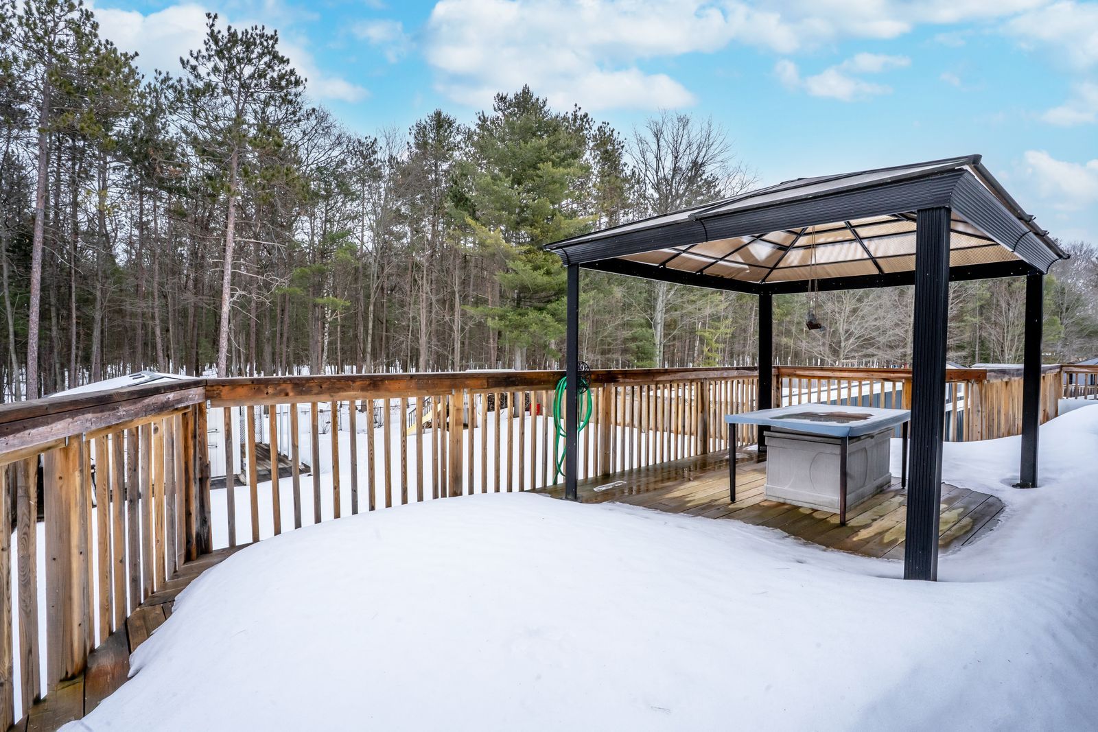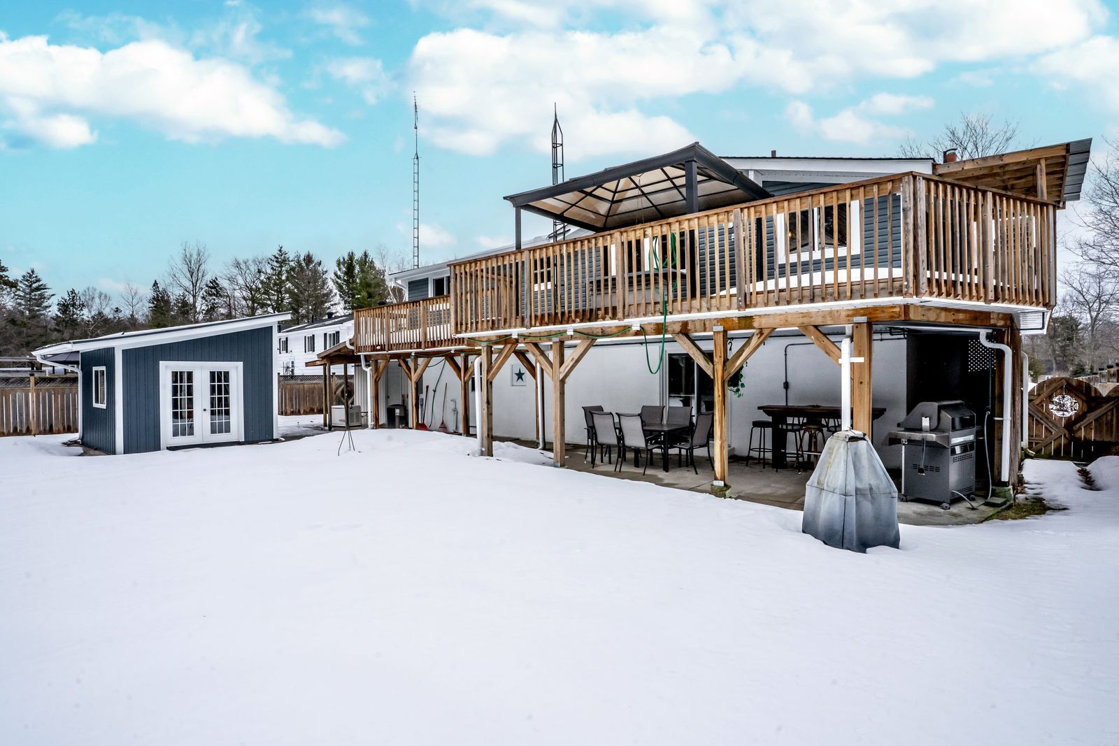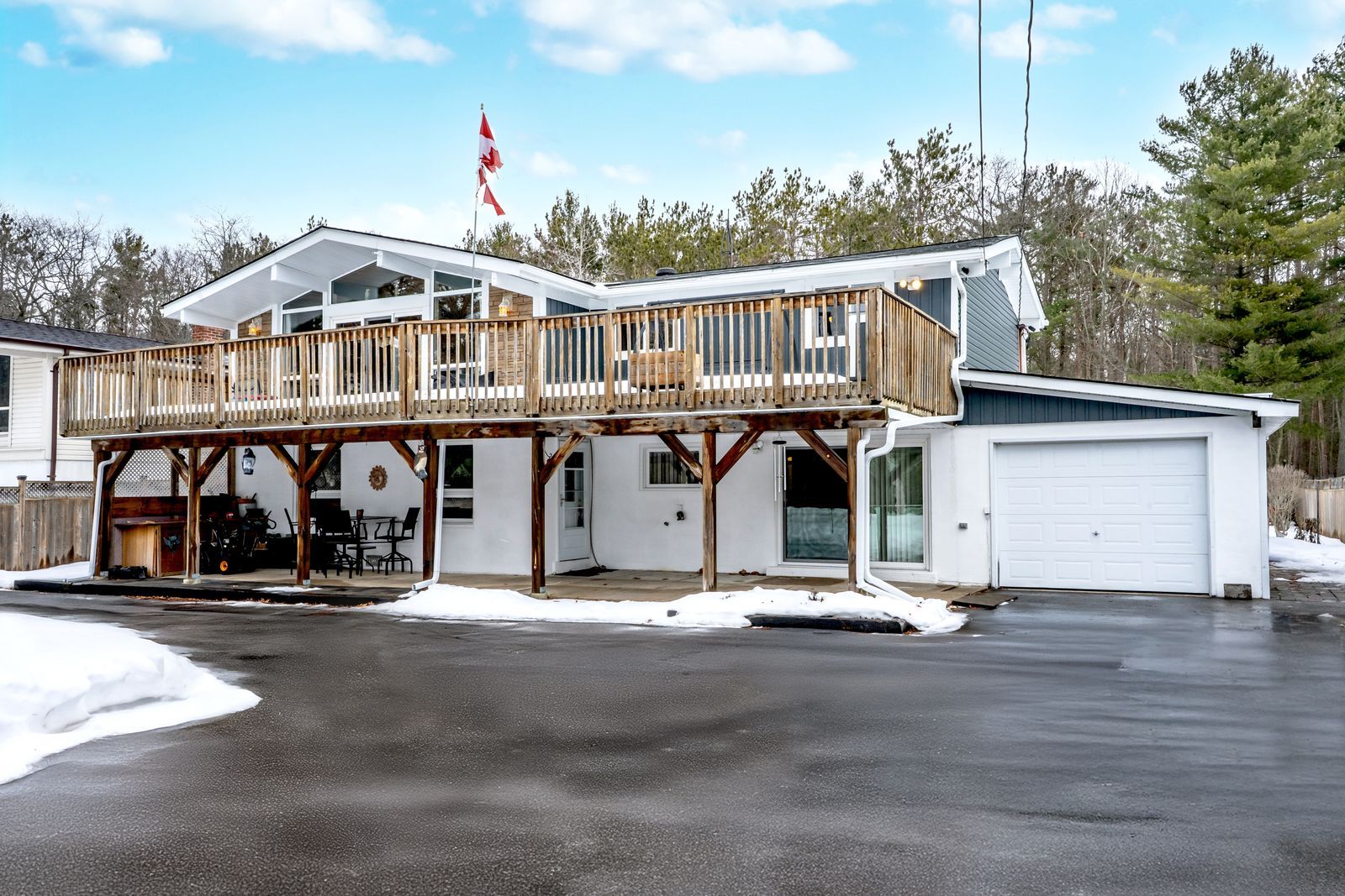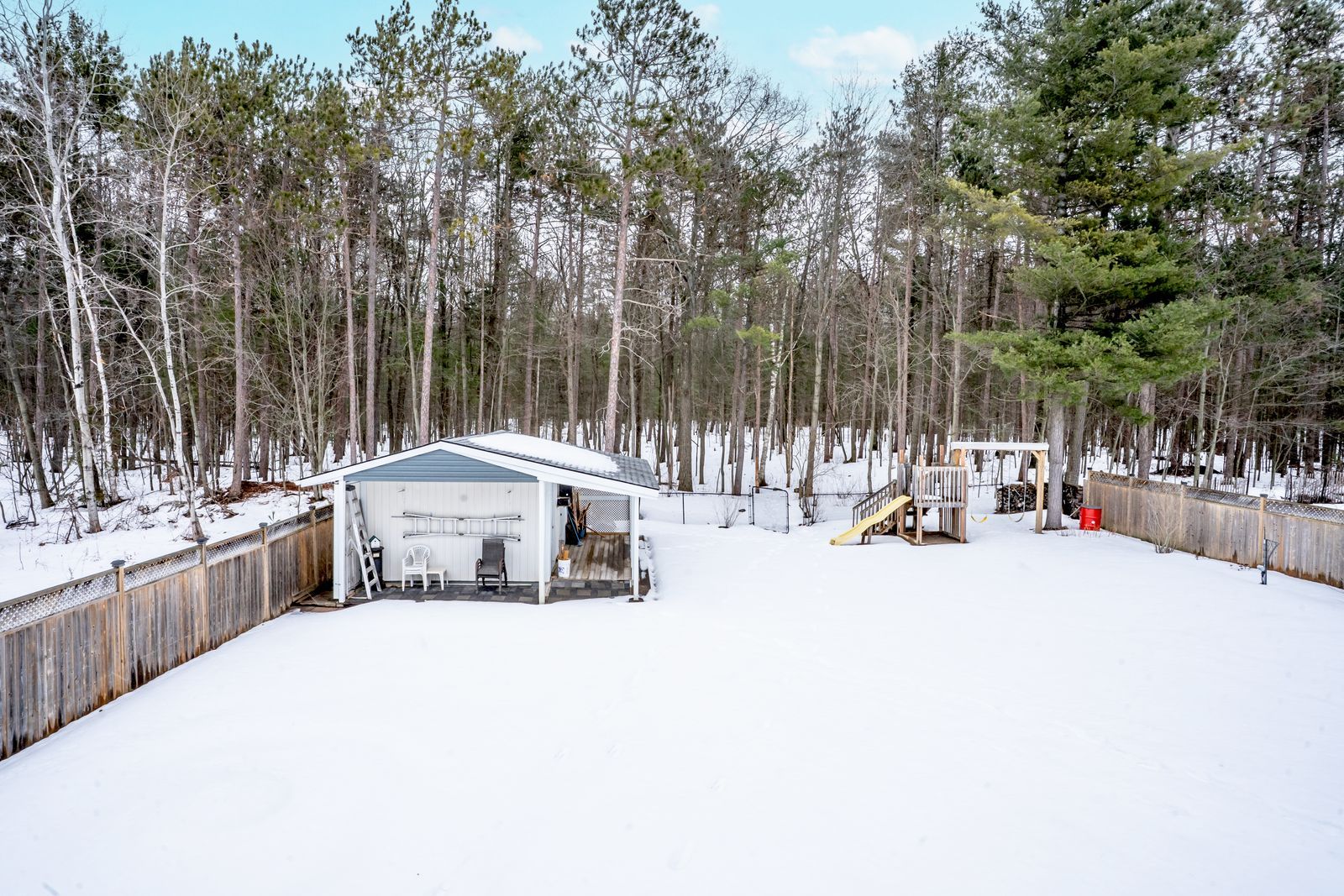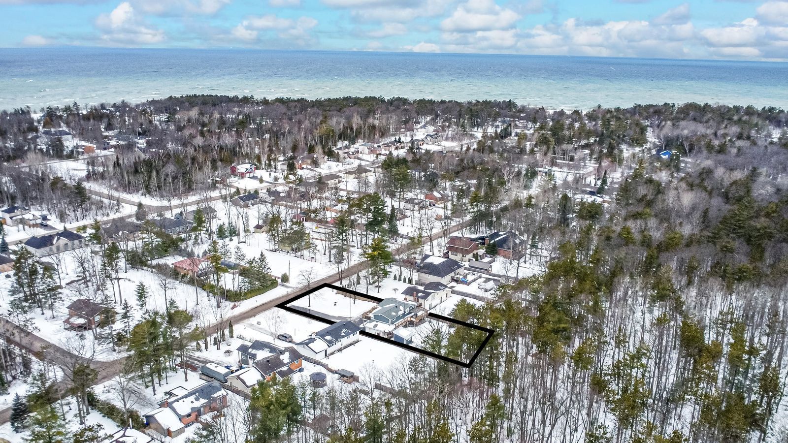 Turn-key home on a 75 x 200 ft lot within walking distance of edmore beach! If your wish list includes walking distance to the beach, a spacious and bright interior, and a generously sized lot with a wooded backdrop, your search might be over. A quick drive will place you at bluewater beach with boardwalk access through the bluewater dunes, and only 15 minutes to elmvale and wasaga beach for everyday errands, dining, and shopping. Set back off the road on a private 75 x 200 ft lot with mature trees, a fully fenced yard, and a forest behind, the setting feels peaceful and tucked away. A private double-wide driveway provides ample parking for 8 vehicles, plus an attached single garage, a garden shed, and an insulated outbuilding that could be converted into future living space. This well-maintained raised bungalow delivers an inviting layout with easy-care flooring, modern light fixtures, neutral paint tones, and warm wood accents. The open concept kitchen and dining area make a statement with a vaulted wood plank ceiling, large windows, and a sliding glass walkout to the front deck, while the kitchen adds ample cabinetry, a large island with seating for four, tiled backsplash, a gas stove, and a second walkout to the back deck. The primary bedroom features two double closets, and the nearby laundry keeps you from hauling baskets up and down stairs. The walkout basement hosts a flex space, ideal for a home office, den, or hobby room, while the living room is designed for entertaining, with a bar, built-in shelving, pot lights, a gas fireplace, and a walkout to the back patio. Accessible features include a level entrance, bath grab bars, and a stair lift, and a whole-home generator adds year-round peace of mind.
