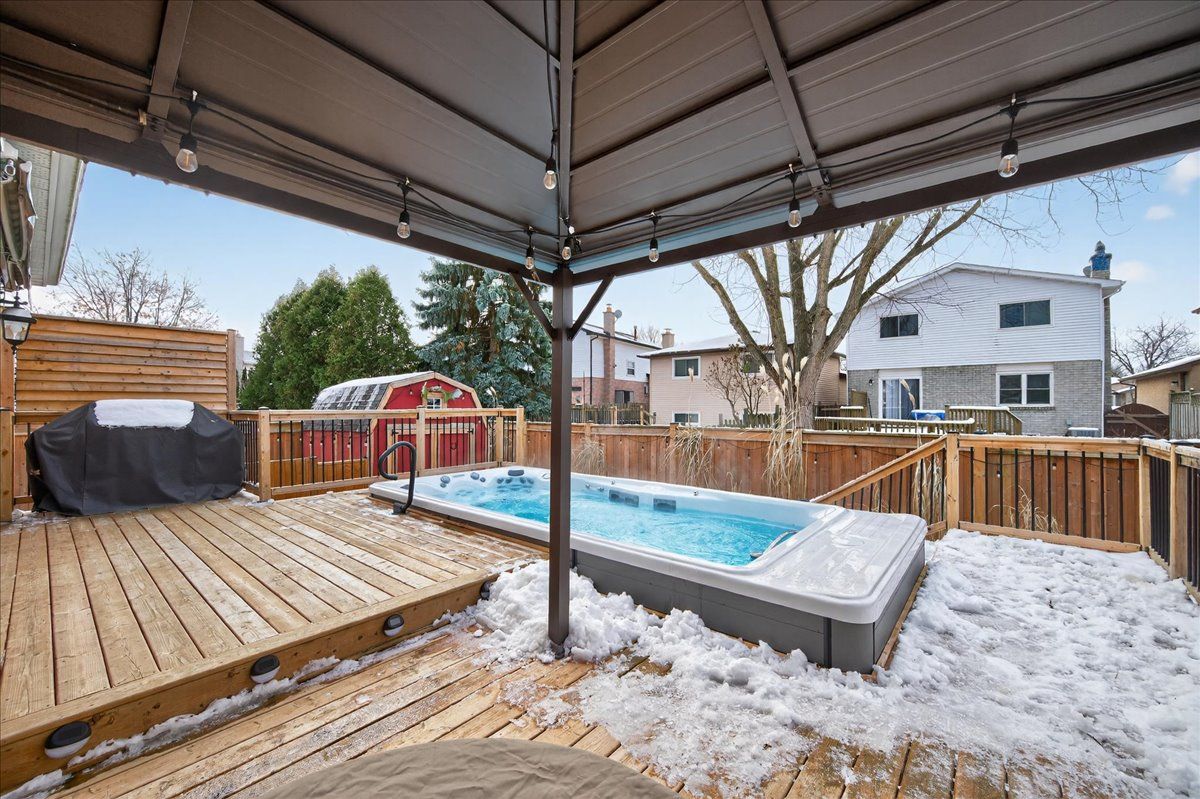 • Backyard retreat with swim spa, gazebo, and beautiful landscaping.