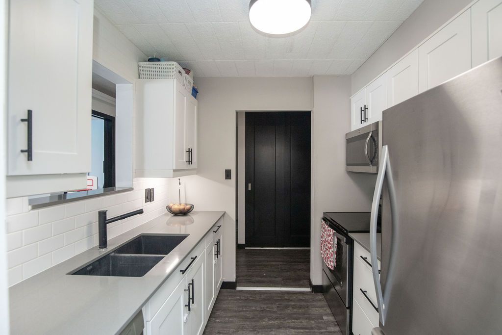 • Updated kitchen featuring stainless steel appliances and quartz counters.