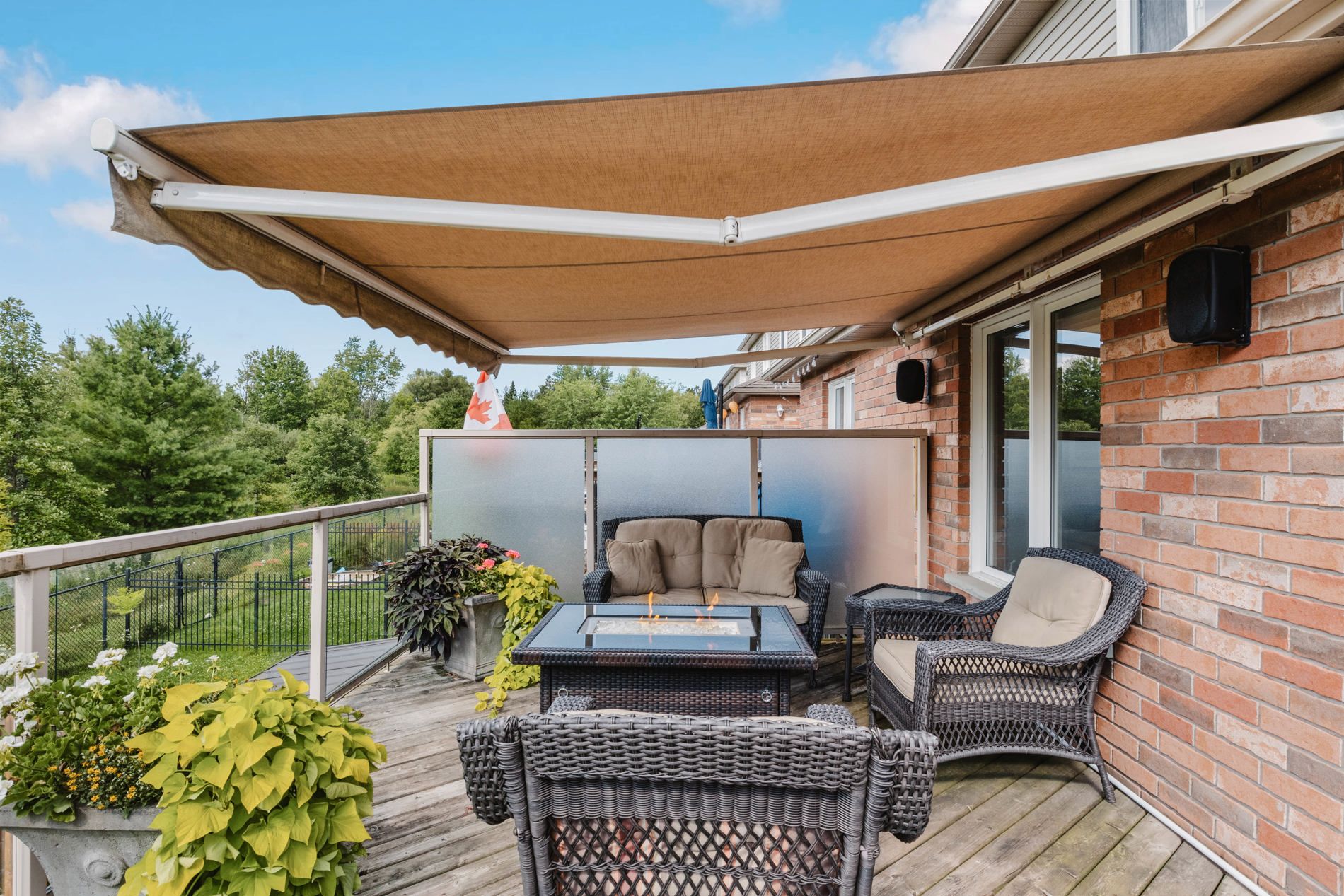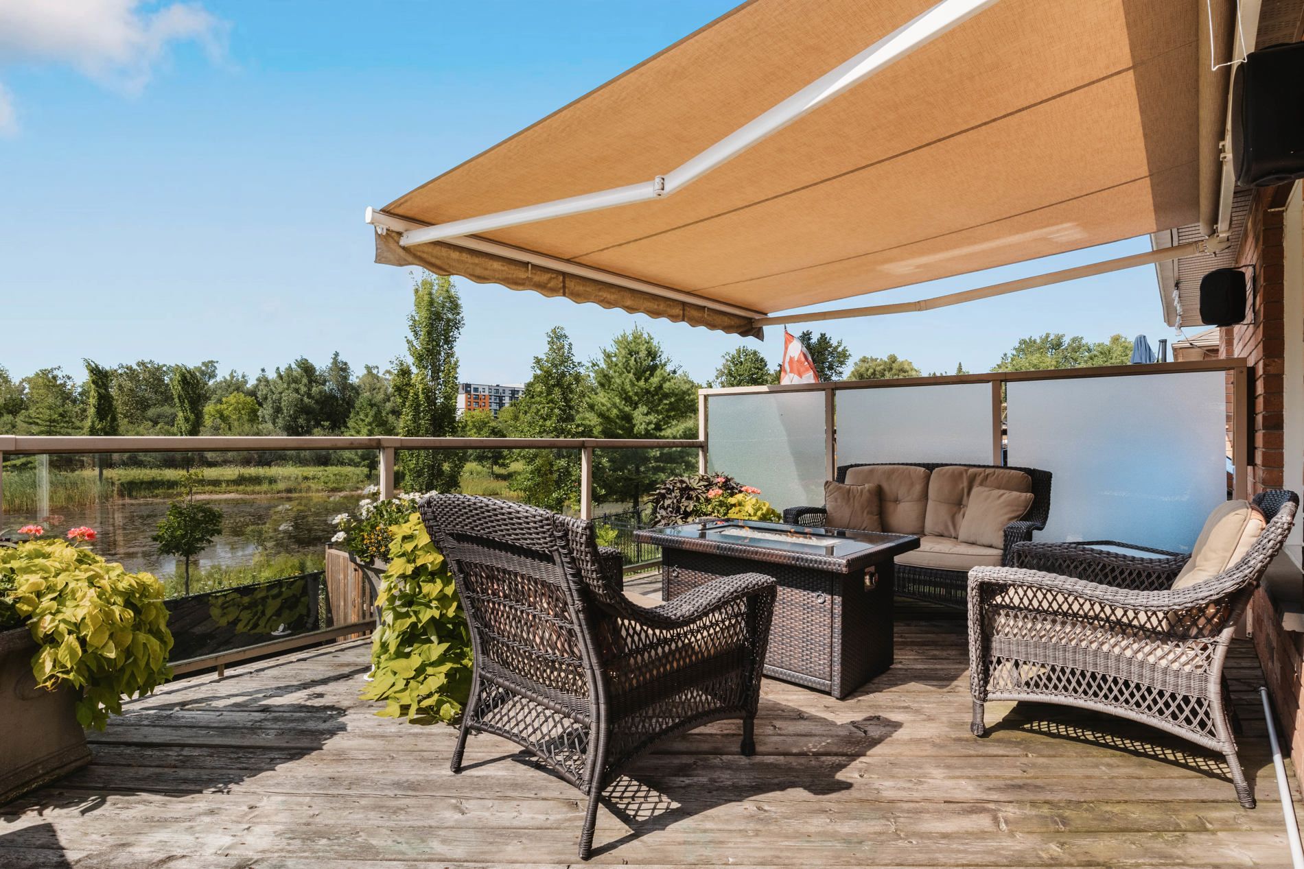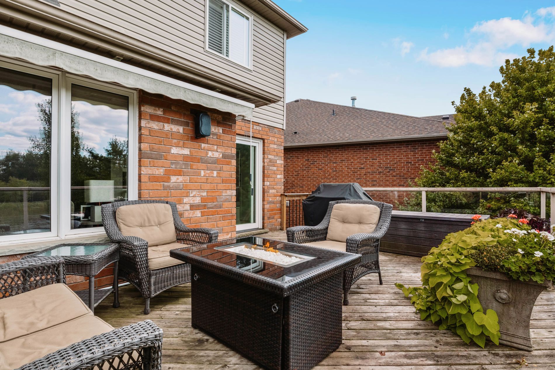• Oversized deck equipped with glass railing, retractable awning, and gas BBQ connection.
