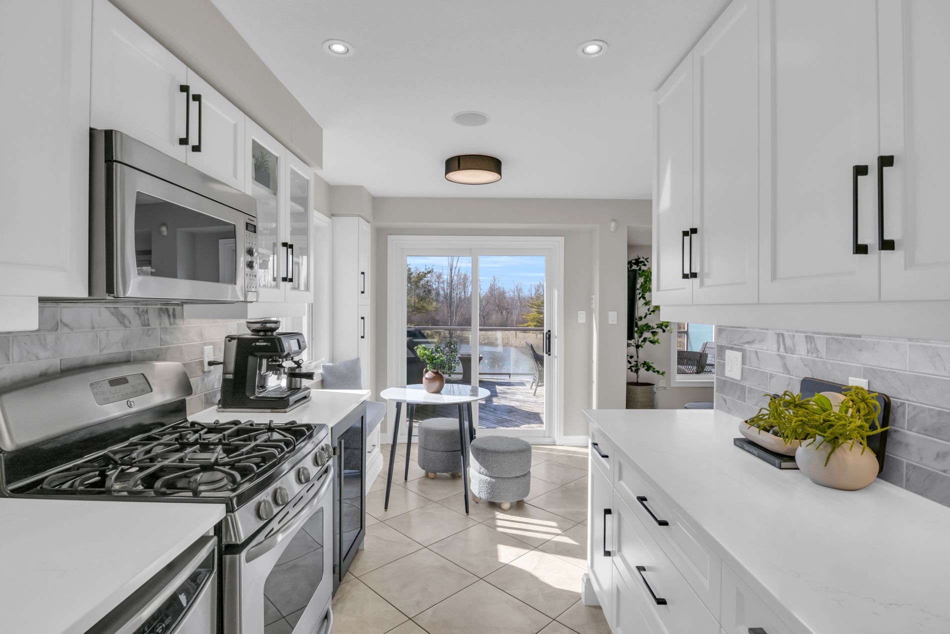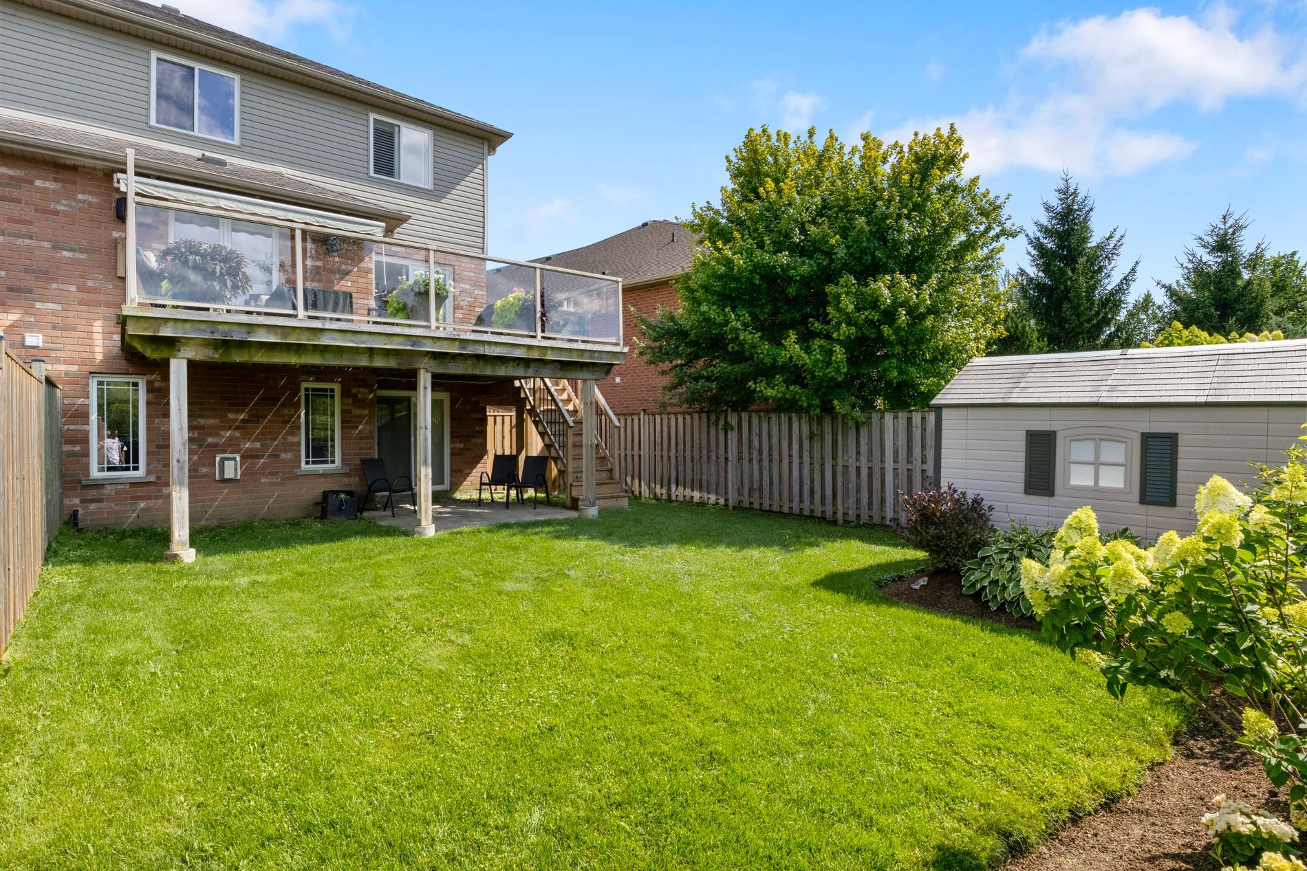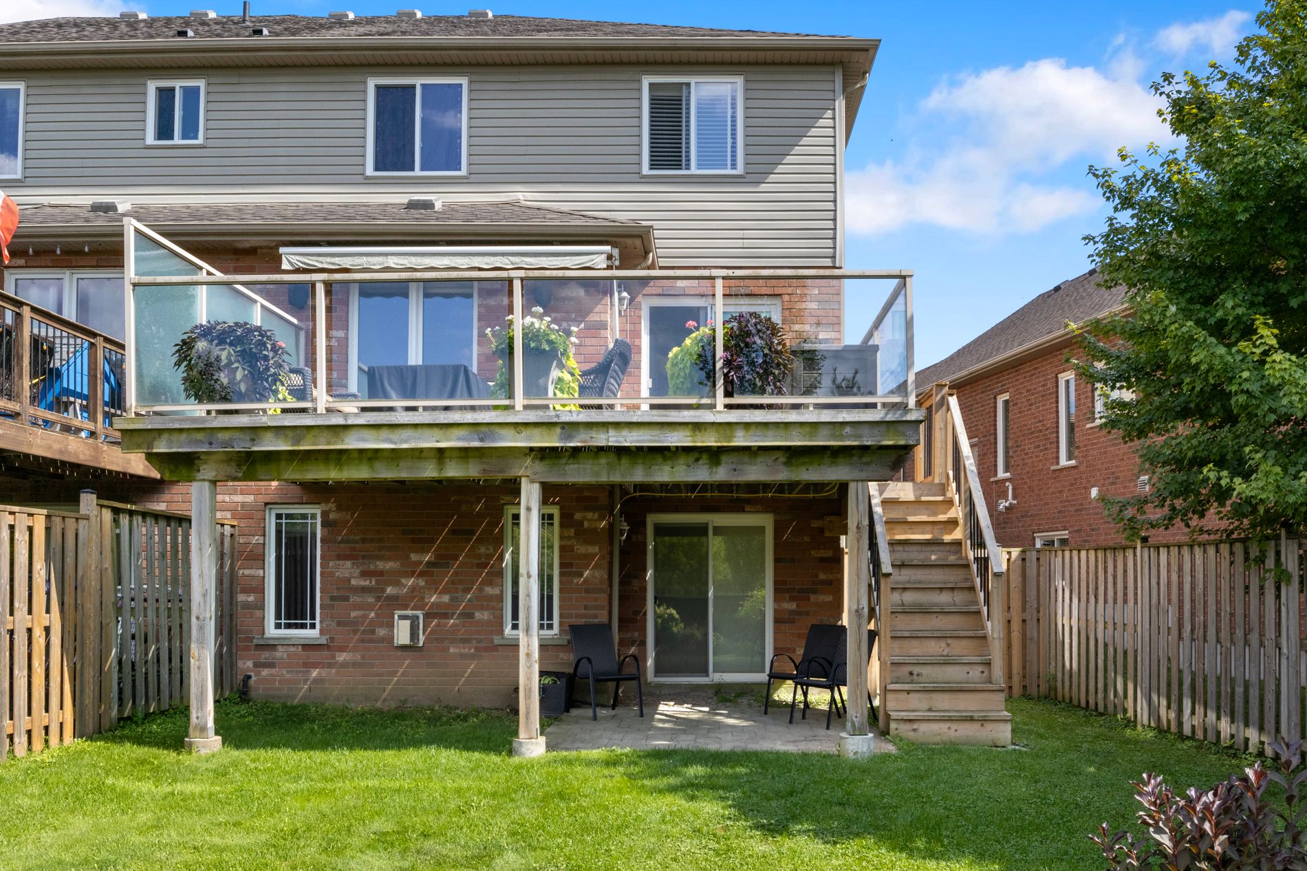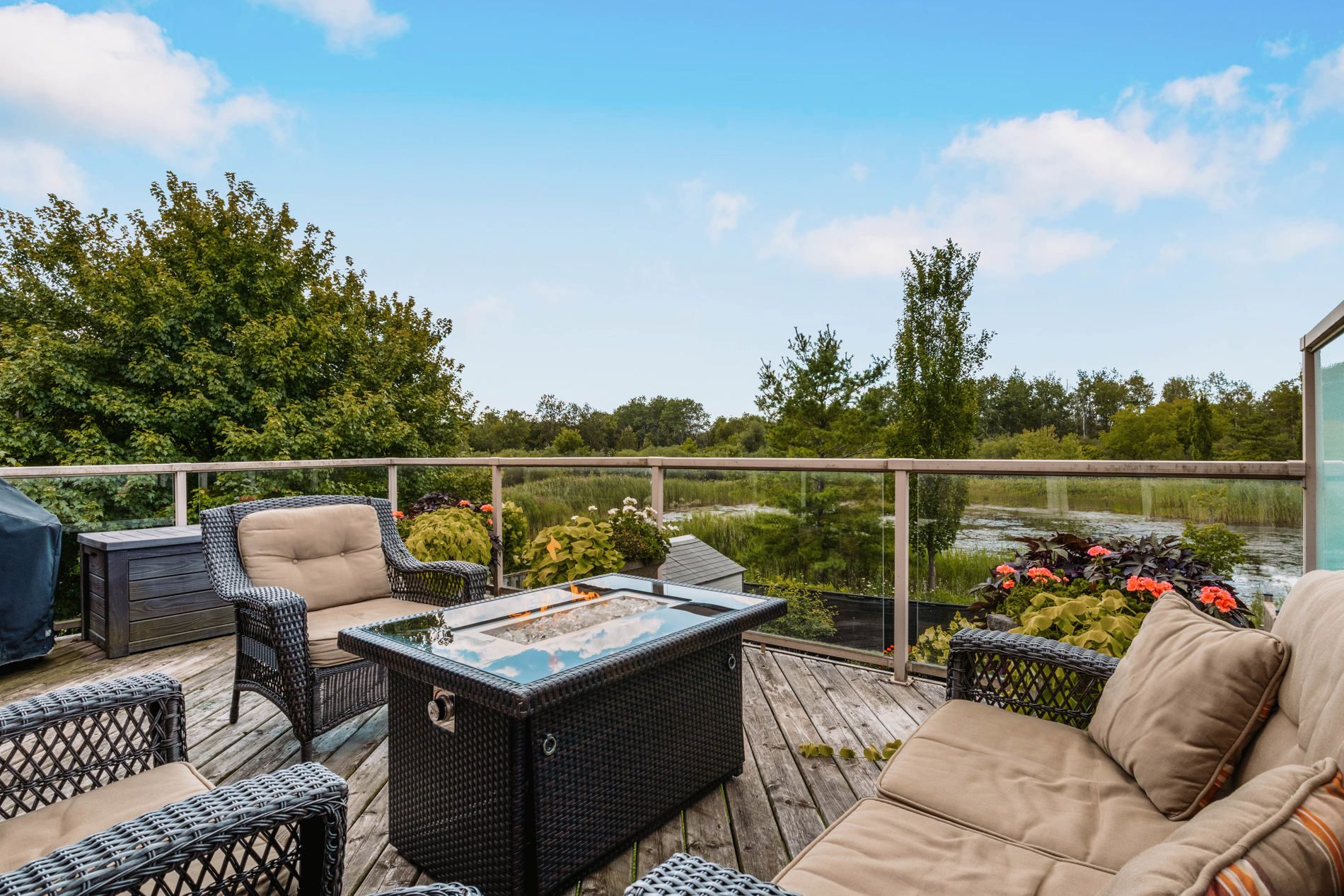 • Oversized deck equipped with glass railing, retractable awning, and gas BBQ connection.