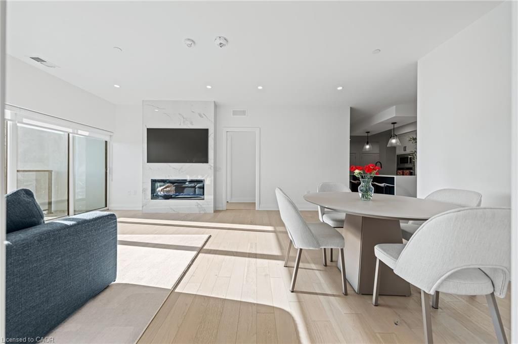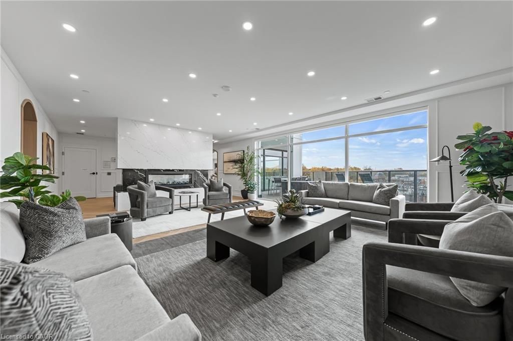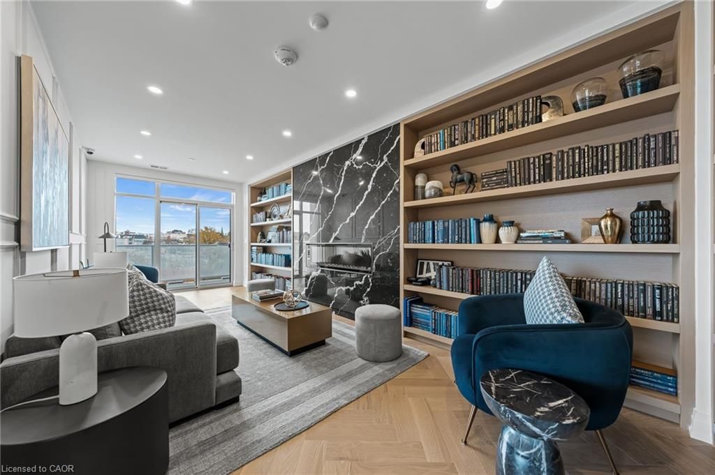 Welcome to edgewater condos - where luxury meets lifestyle in the heart of downtown guelph. Unit 601 at 71 wyndham street south offers an exceptional blend of modern elegance and everyday comfort. This bright and spacious 2-bedroom + den, 2-bath suite features an open-concept design with hardwood flooring, two private balconies, and a stunning floor-to-ceiling fireplace that anchors the living space beautifully. The sleek kitchen is a true showpiece, complete with quartz countertops, a waterfall island with seating for four, a built-in wine fridge, and a custom walk-in pantry - perfect for cooking enthusiasts and entertainers alike. The primary suite includes a generous walk-in closet, a spa-inspired 3-piece ensuite with heated floors, and direct balcony access. The second bedroom is filled with natural light and conveniently located near the second full bath, also with heated floors. Enjoy two underground parking spaces and a collection of premium amenities including a golf simulator, fitness centre, guest suites, a main floor lounge with billiards and a terrace, plus a 4th-floor library and patio with scenic river views. Steps from the covered bridge, the boathouse, and guelph's vibrant downtown - this is urban living at its finest.