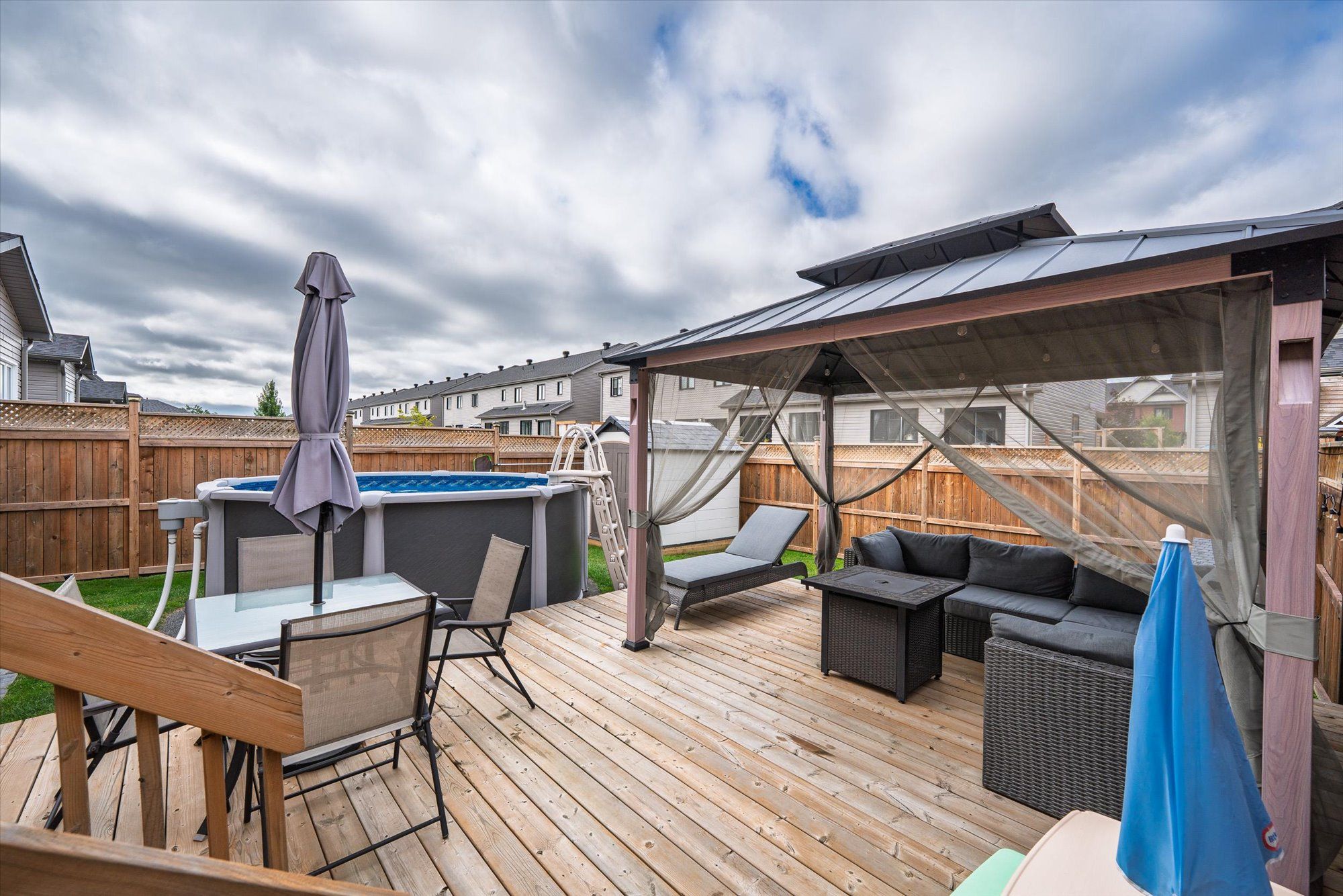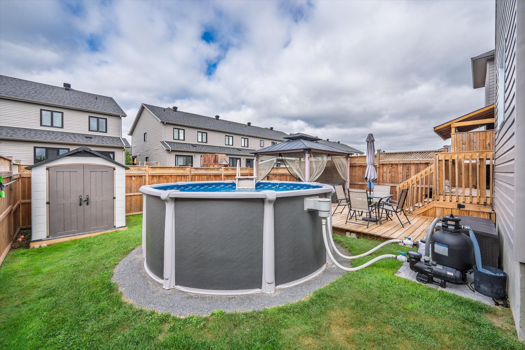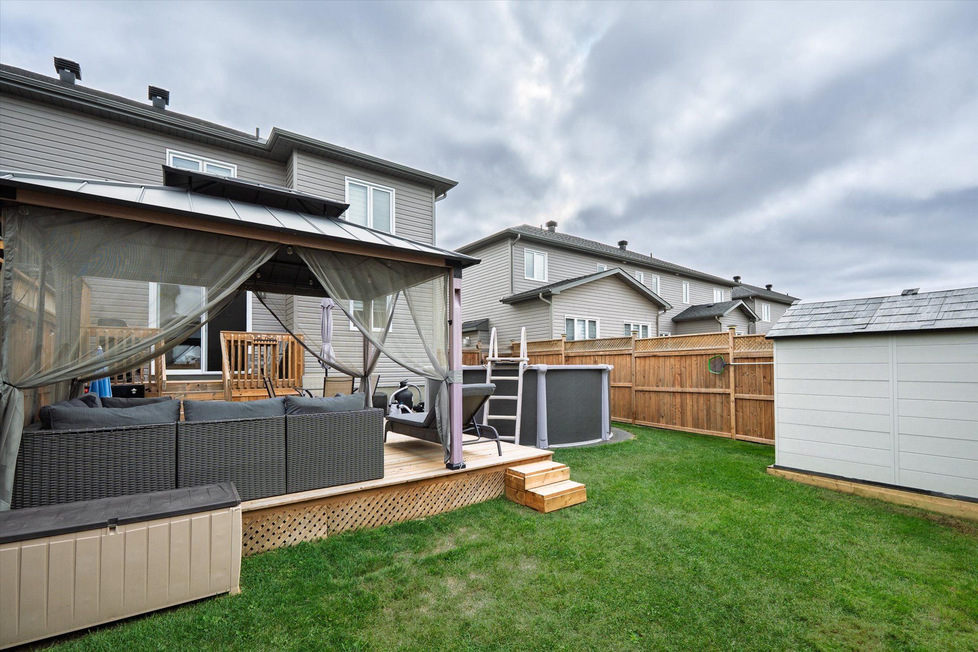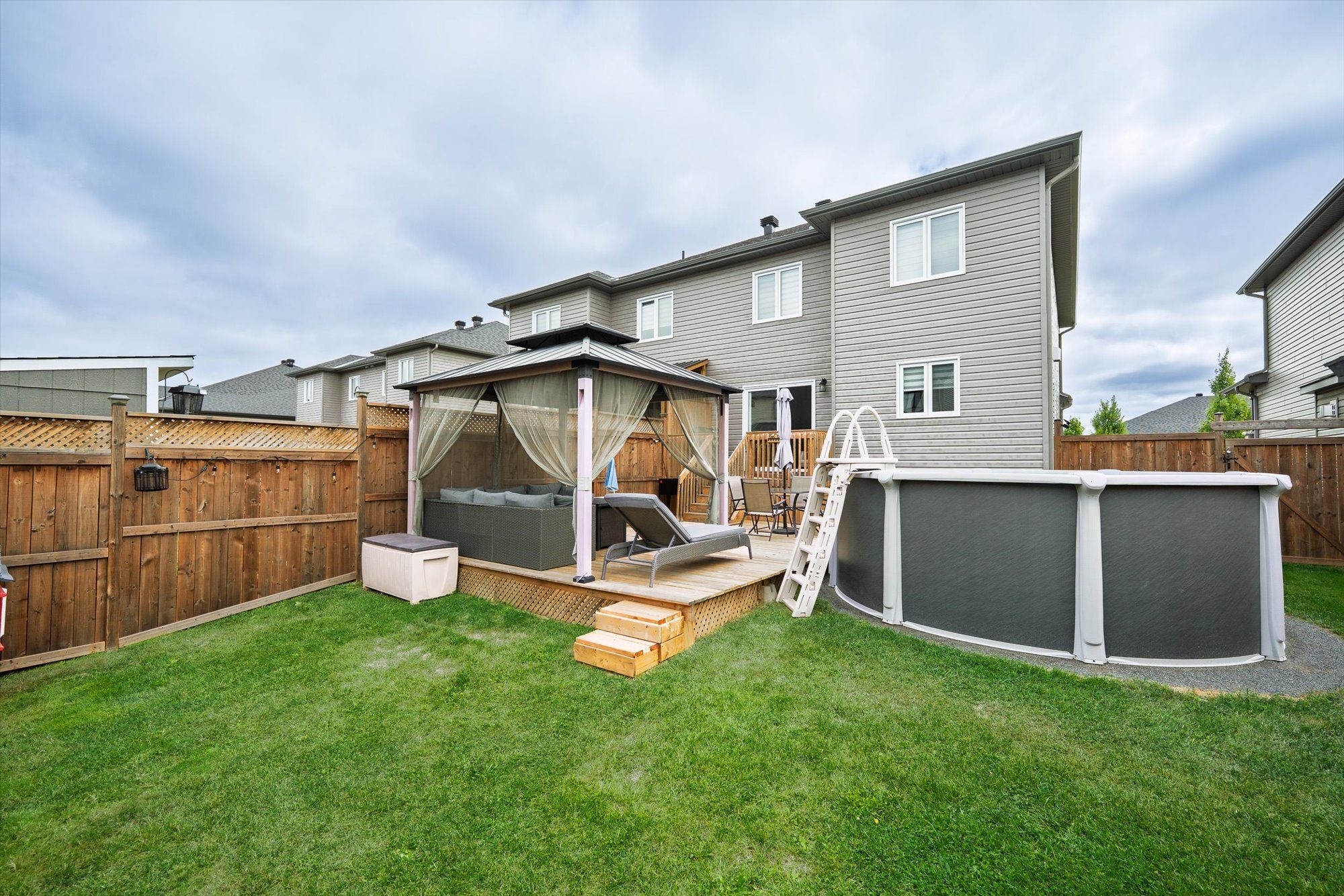 Welcome to 710 azure st, where thoughtful upgrades and inviting spaces come together in the desirable russell community. This beautifully finished residence features an inviting layout with abundant natural light and designer touches throughout. Step into the heart of the home - a stunning kitchen with a chimney-style hood range as the focal point, complemented by rich cabinetry, expanded pantry space and ample room for meal prep and casual dining. The seamless flow from kitchen to dining and living spaces is highlighted by elegant engineered hardwood floors. Patio doors off the living room lead you to the deck overlooking a fully fenced, landscaped yard featuring a gazebo and newly installed above-ground pool (2024) - perfect for summer gatherings. A powder room completes the main level. The luxurious primary suite is a true retreat, complete with an upgraded walk-in closet and spa-inspired ensuite boasting custom glass shower doors and a deep soaker tub, ideal for unwinding after a long day. Thoughtful design continues with two additional bedrooms and a main bathroom, completing the second level. The fully finished lower level includes a rec room and flex space ideal for an office, play area or home gym. The property includes a double-wide laneway and shed (2022). Located in a desirable neighbourhood steps to the 10 km paved new york central recreational trail, russell fair grounds, arena, schools, library, conservation area, sports dome, restaurant, cafe and more. New amenities coming soon include the russell recreation complex with 3 ice rinks, a 25-meter indoor pool, plus the russell station trail / eadie park incl. A tennis and pickleball courts, splash pad and play structure (fall 2026). Discover next-level comfort and timeless style at 710 azure st - a home you'll be proud to own.