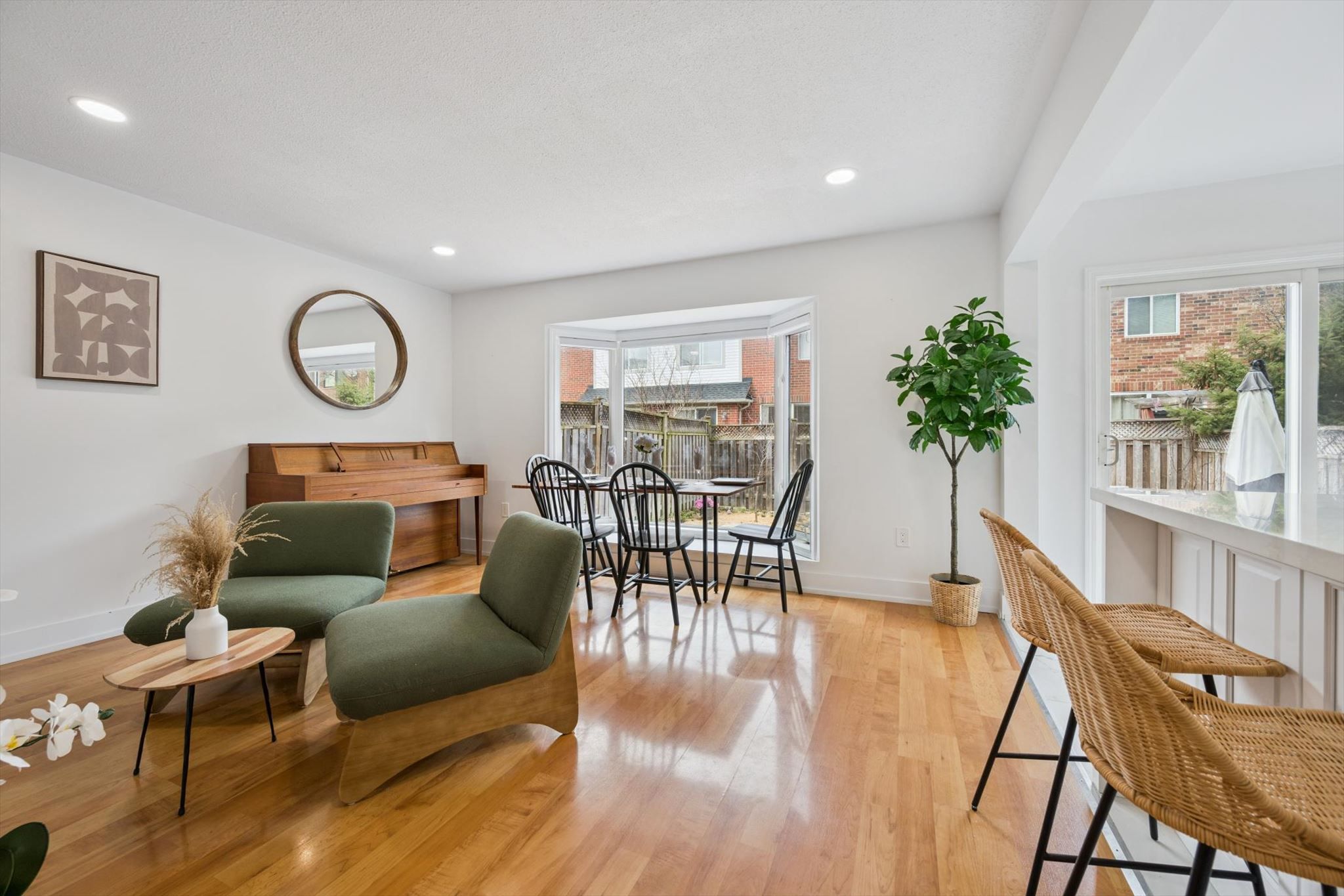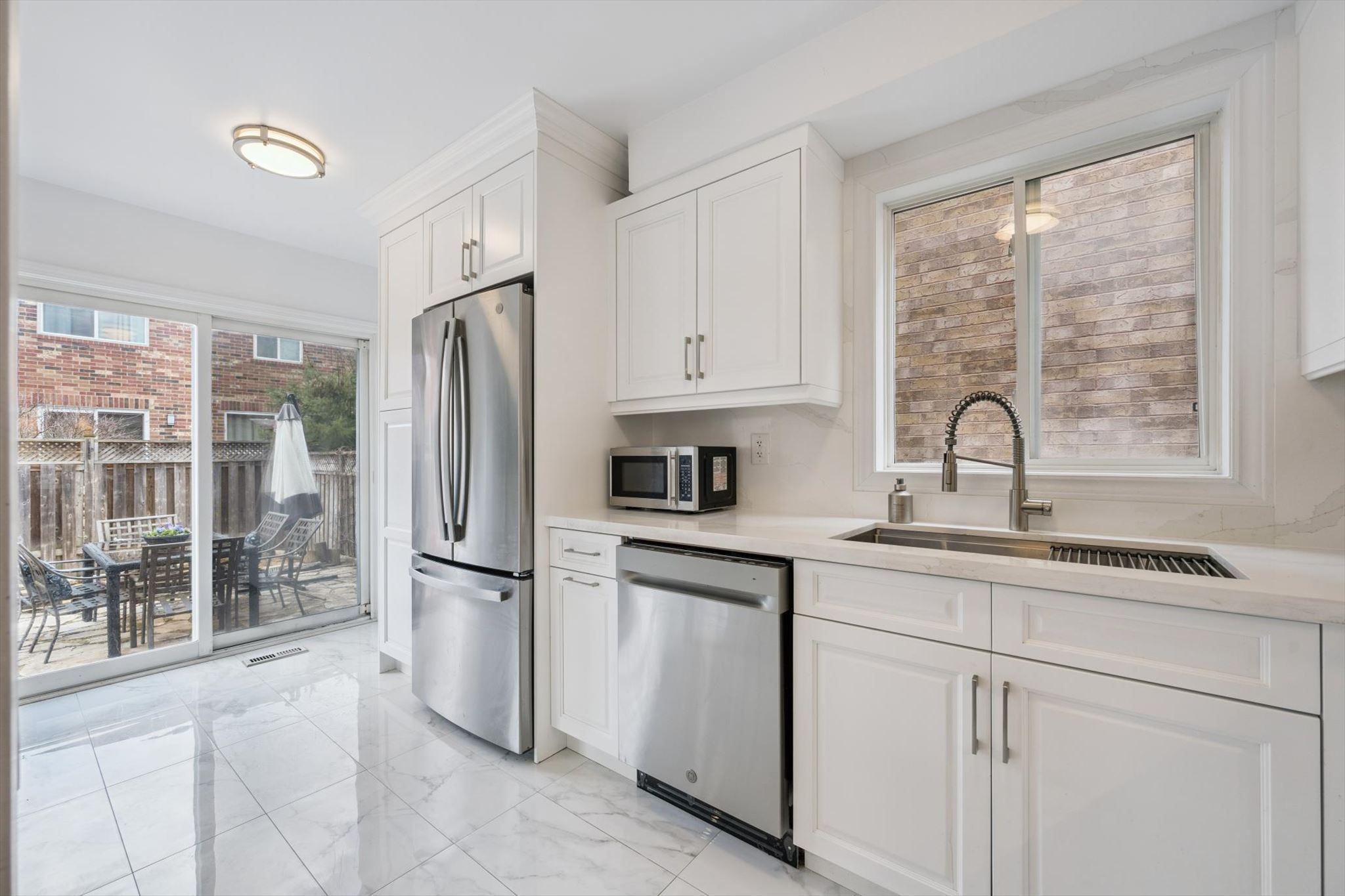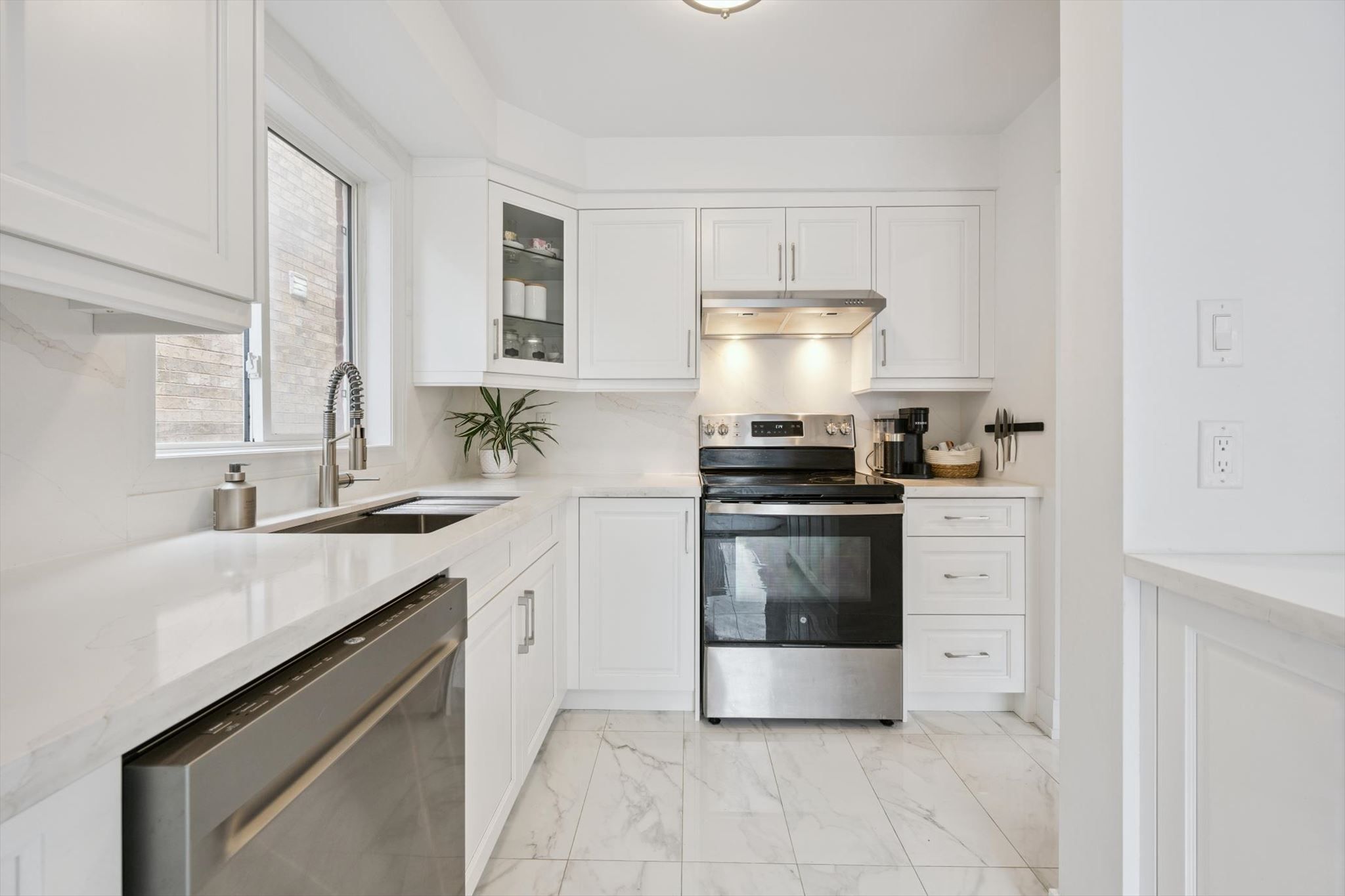 • Renovated open-concept kitchen with stylish quartz counters and modern appliances.
