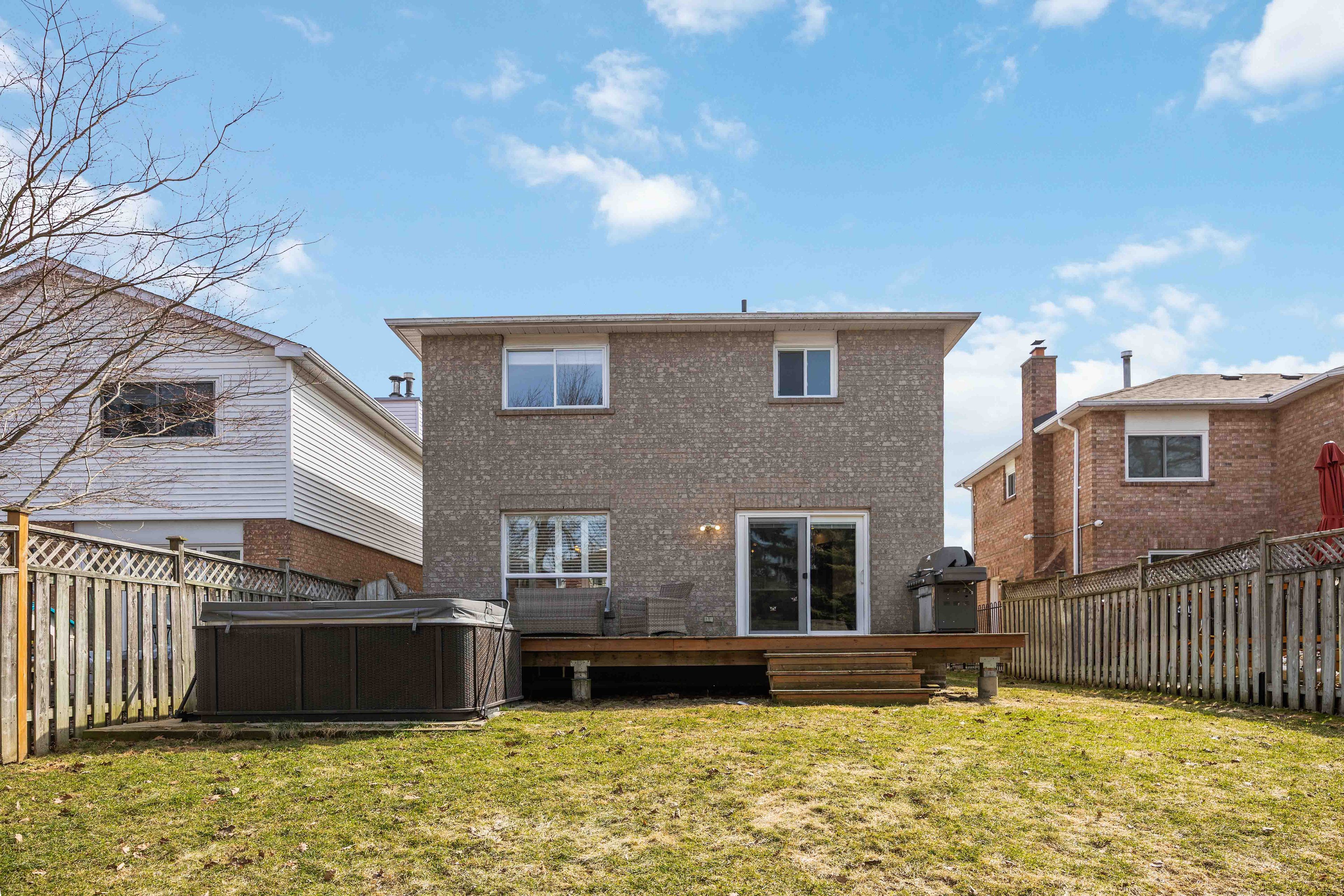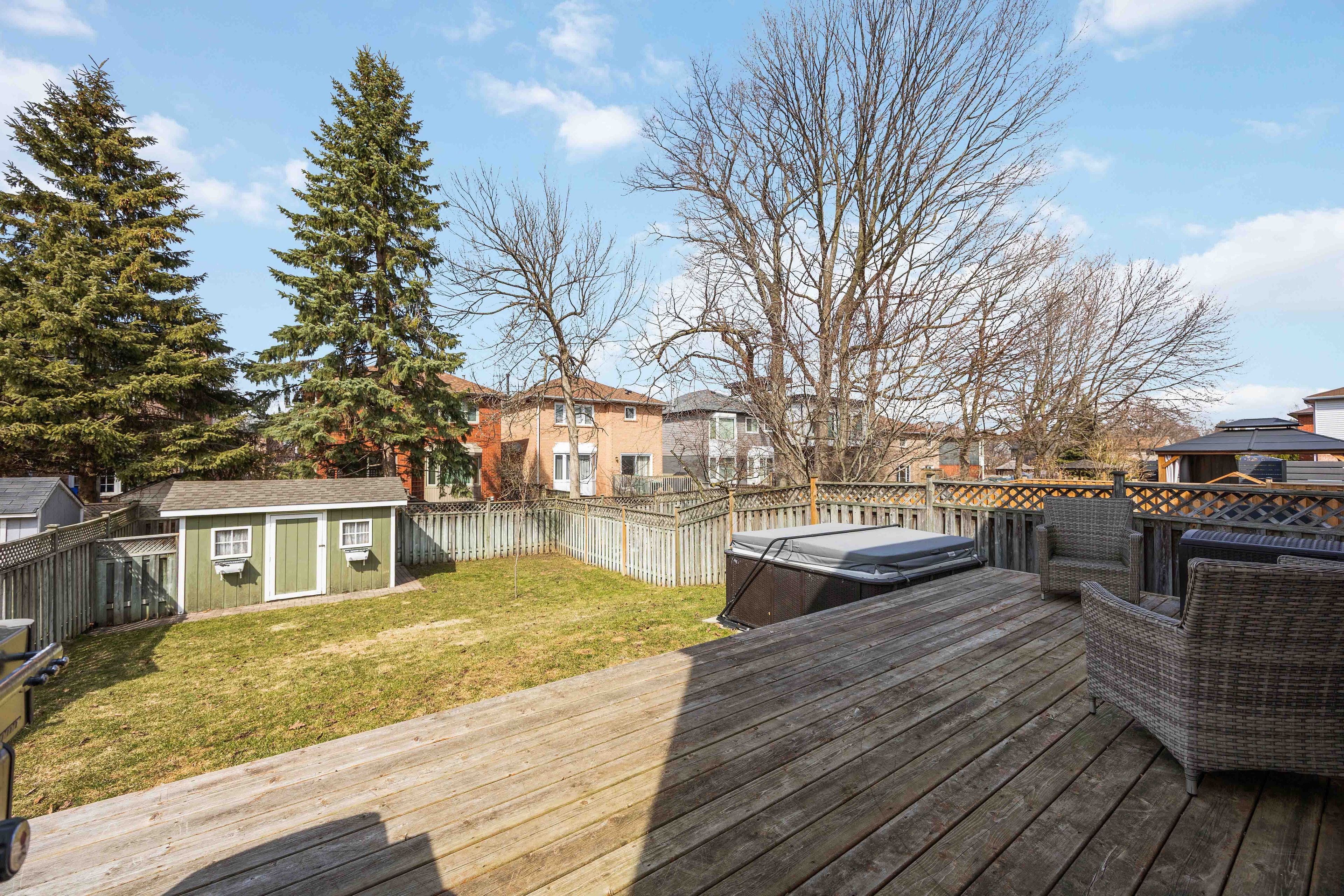 • Private deck overlooks a landscaped backyard, great for relaxation and hosting.