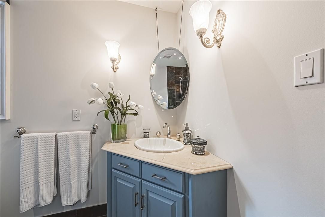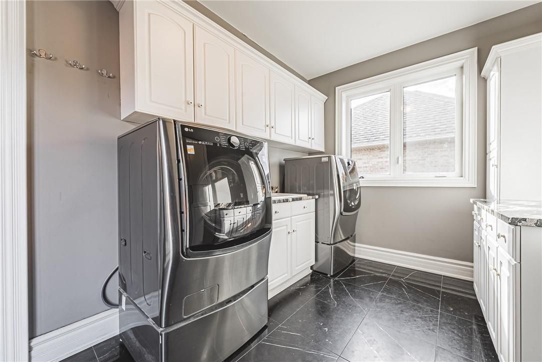 Unique, custom-built luxury home offering just over 5000 sq ft of finished living space. Attention to detail & fine construction throughout, this home offers elegance, comfort, & functionality. Step into the grand sitting area, featuring soaring ceilings, stunning windows, & an impressive open staircase that connects all levels of the home. Sunken dining room boasts coffered gold leafing ceilings for refined entertaining. Custom built downsview kitchen offers abundant cabinetry, granite countertops, & top-of-the-line stainless steel appliances, including a sub-zero refrigerator, wolf gas range, gaggenau built-in oven, miele dishwasher, & microwave storage. Relax or entertain in the expansive great room, featuring dramatic ceiling heights & a backlit onyx walls for your tv. An open-concept office with natural light, perfect workspace. Main-floor laundry room includes garage access. Upstairs, the spacious primary suite offers a large walk-in closet & a renovated 5-piece ensuite (2025). Two generous bedrooms share a beautifully appointed 4-piece bathroom, & a bright loft area overlooks both the front & rear of the home. The lower level features large windows & offers in-law suite potential with separate walk-ups to both the rear yard & garage. Cozy recreation room with fireplace, a fully equipped gym, a sauna for relaxation, 3 pc bath (2025), workshop, cold room, & plenty of storage space. The outdoor oasis includes a composite deck with built-in bbq, hot tub, & an oversized waterfall feature with fireplace, artificial turf & a storage shed. Additional highlights include an oversized 2-car garage with abundant storage & a long interlock driveway accommodating up to 8 vehicles & irrigation system. Trillium award several years for landscaping. Ideally located near tiffany falls, tamahaac club, highway 403, the linc, costco, schools, parks, & trails, luxury living with convenience & lifestyle.