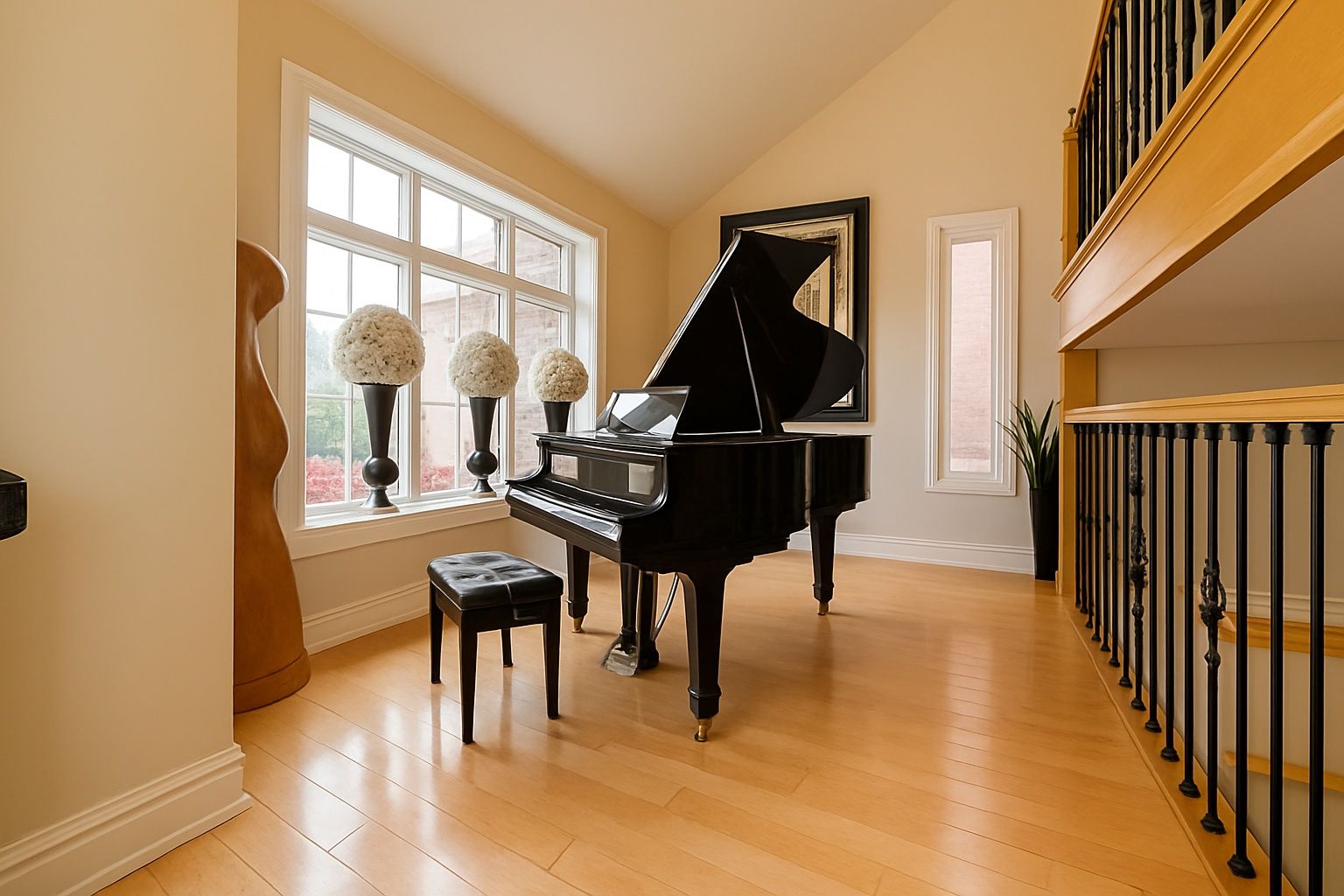 • Grand sitting area with soaring ceilings and impressive open staircase.